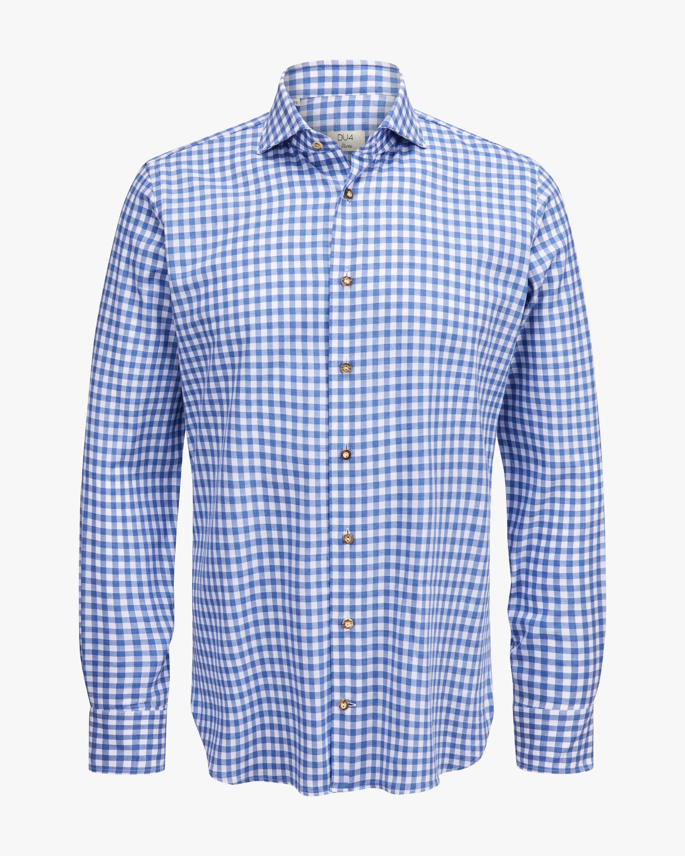 Sebi Trachtenhemd für Herren von Du4 in Blau und Weiß. Seit 45 Jahren entwirft das Label leidenschaftlich stilvolle Hemden - Das taillierte Modell aus angenehmer Baumwoll-Verarbeitung überzeugt durch die traditionelle Optik sowie das markante Vichy-Karo-Muster, während die Hornknöpfe besondere Akzente setzen.