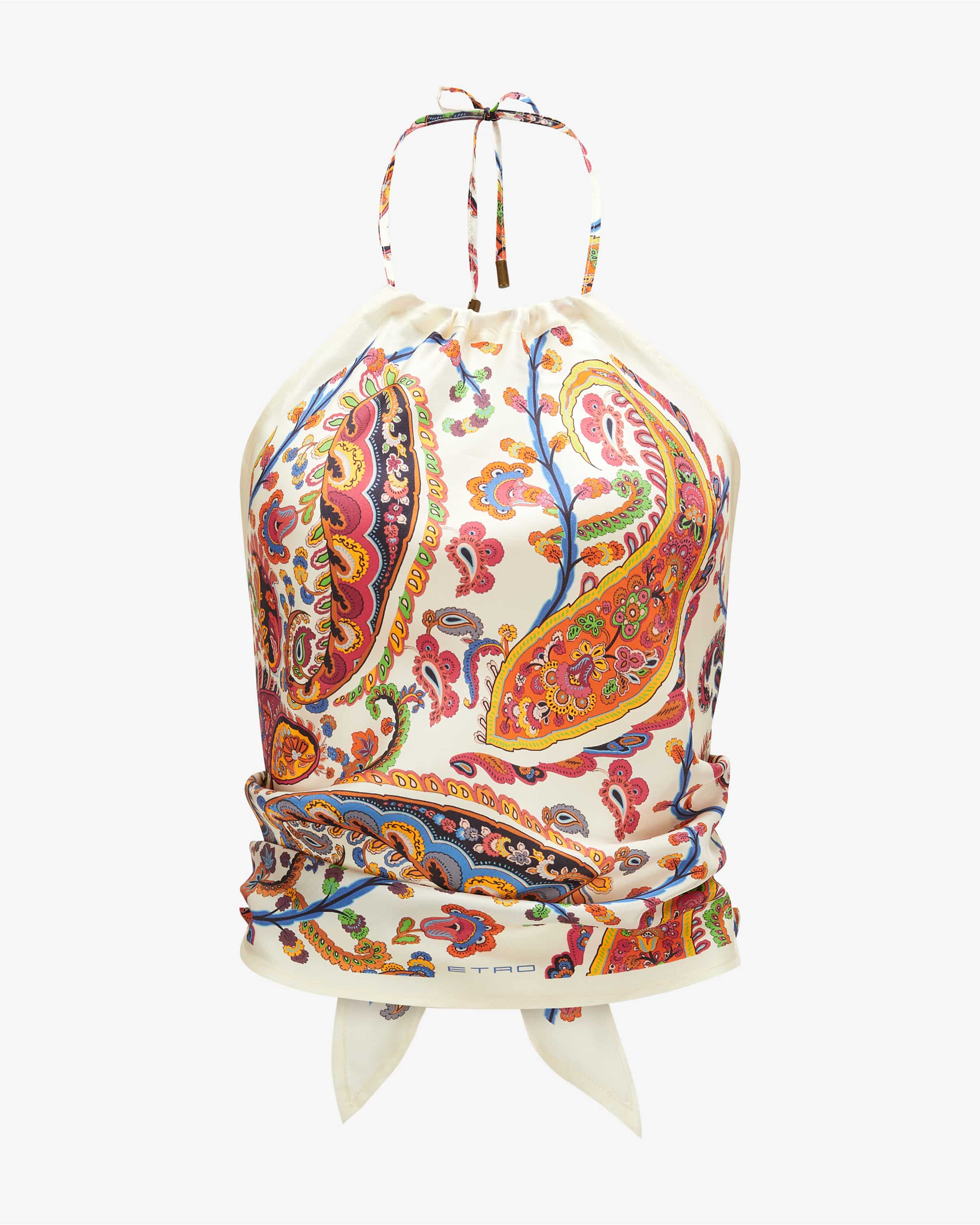 Seidentop für Damen von Etro in Bunt und Creme. Die italienische Traditionsmarke ist bekannt für ihre opulenten Paisley-Muster und ethnischen Prints. Auch dieses Modell überzeugt mit detailreichem Paisley-Motiv und hochwertiger Seide, während die raffinierte Silhouette zum Binden das sommerliche Boho-Design gekonnt abrundet.
