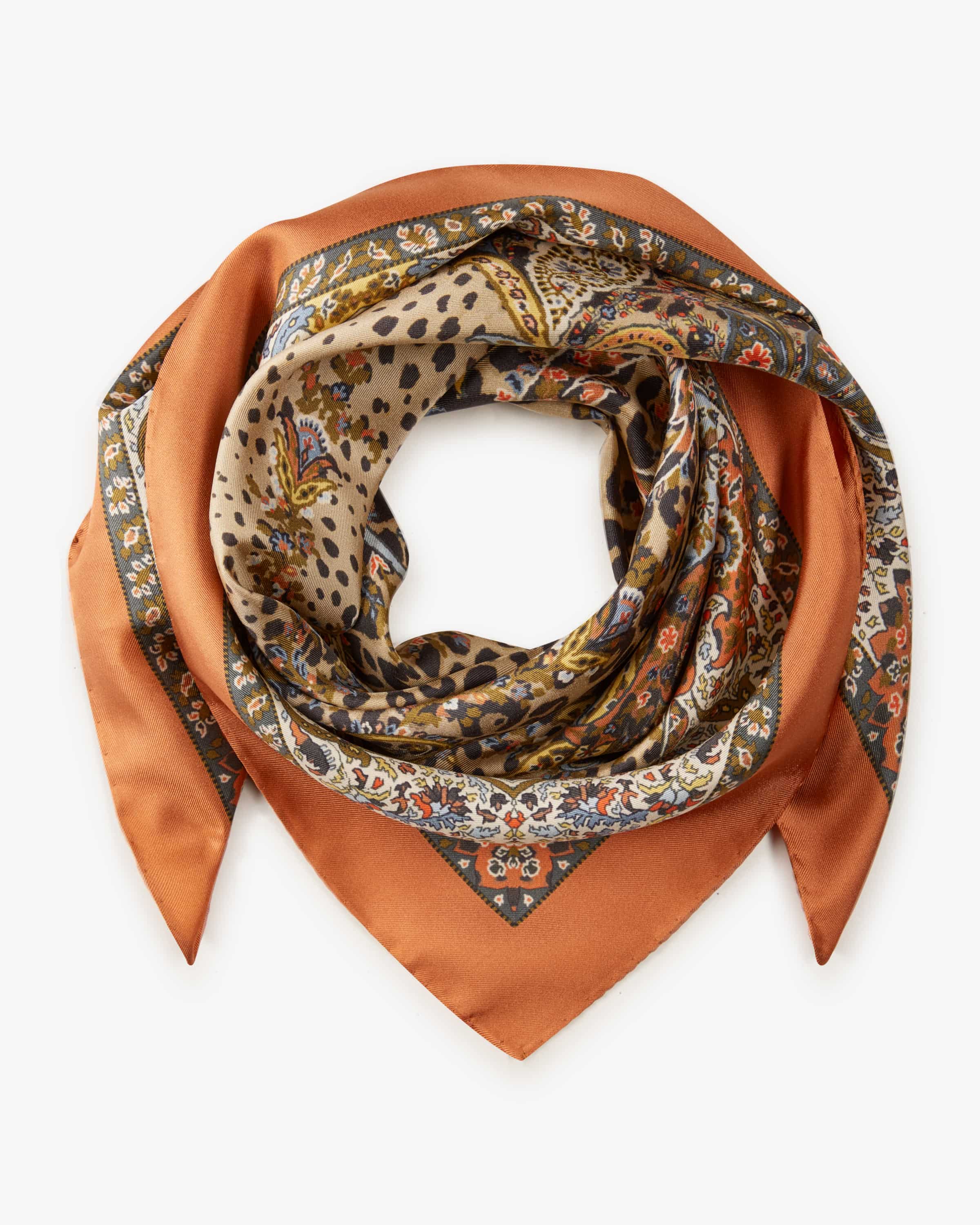 Seidentuch für Damen von Etro in Orange und Bunt. Made in Italy - Während das labeltypische Paisley-Muster mit Leo-Print einen modischen Eyecatcher kreiert, schmiegt sich die hochwertige Seiden-Qualität in leichter Haptik angenehm an Ihre Haut an.