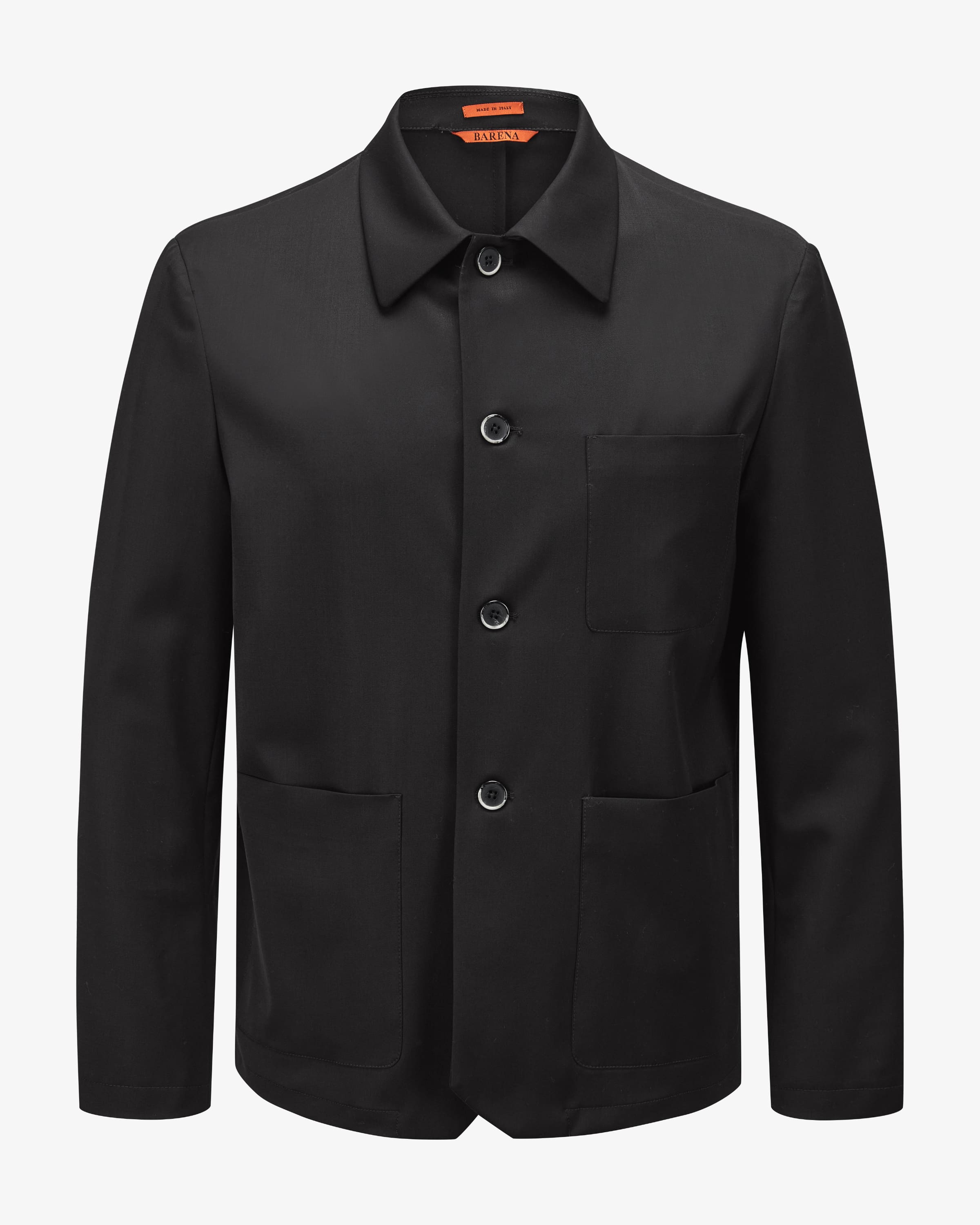 Shirtjacket für Herren von Barena in Schwarz. Das italienische Label aus Venedig ist inspiriert von traditioneller lagunenstädtischer Kleidung. Während die glatte Woll-Verarbeitung sowohl haptisch als auch optisch überzeugt, schafft die klassische Hemd-Aufmachung mit aufgesetzten Taschen einen stilvollen Begleiter mit maskulinem Charme.