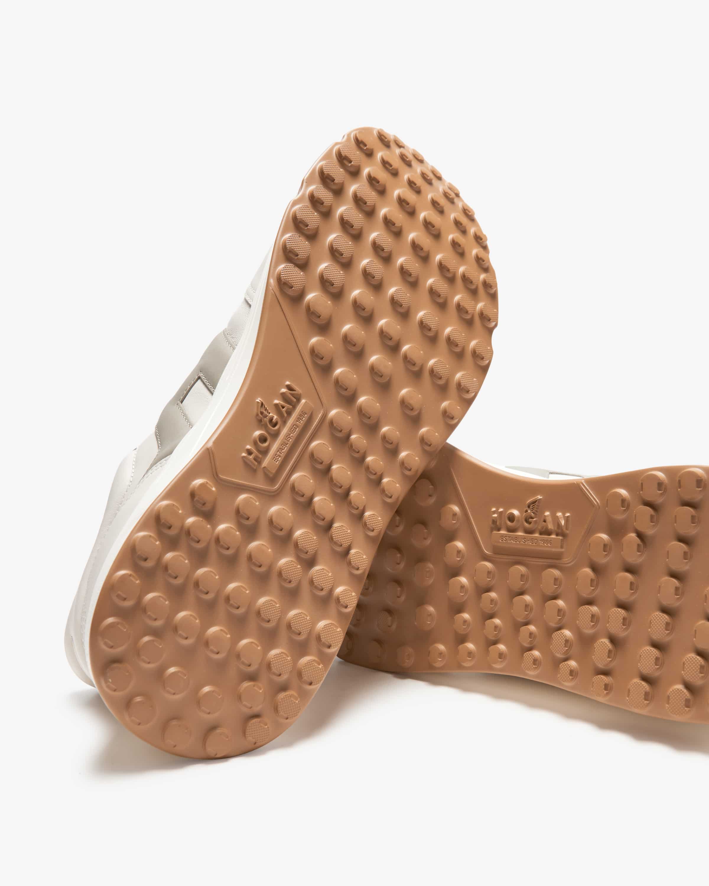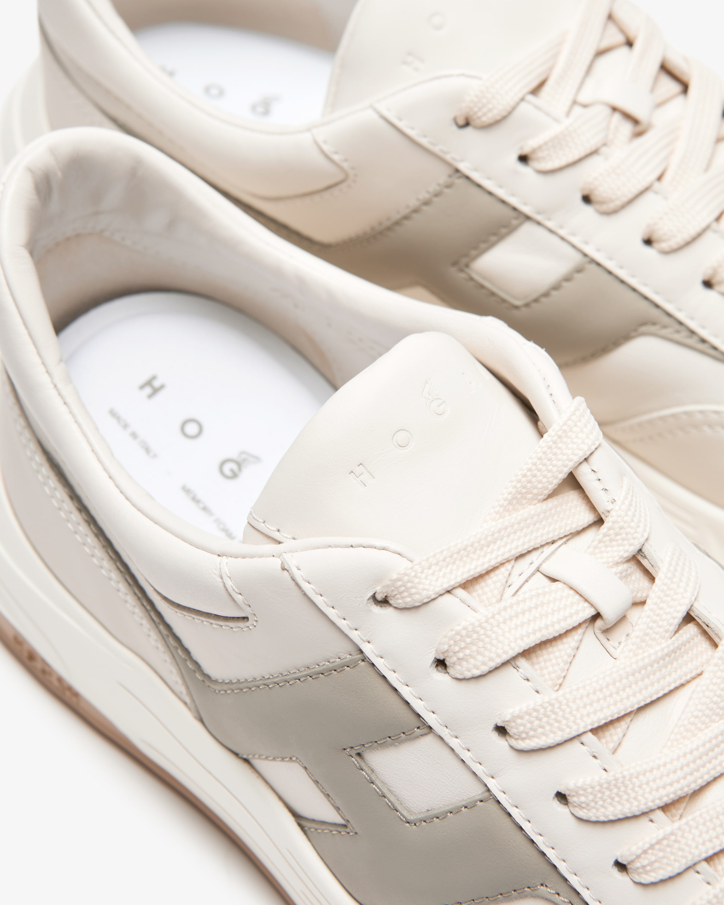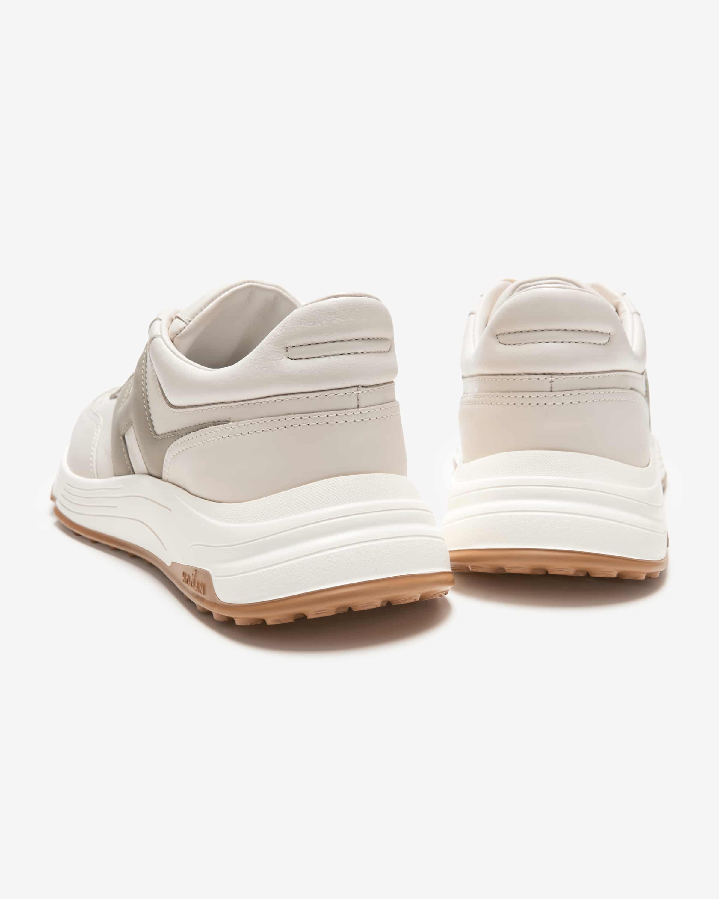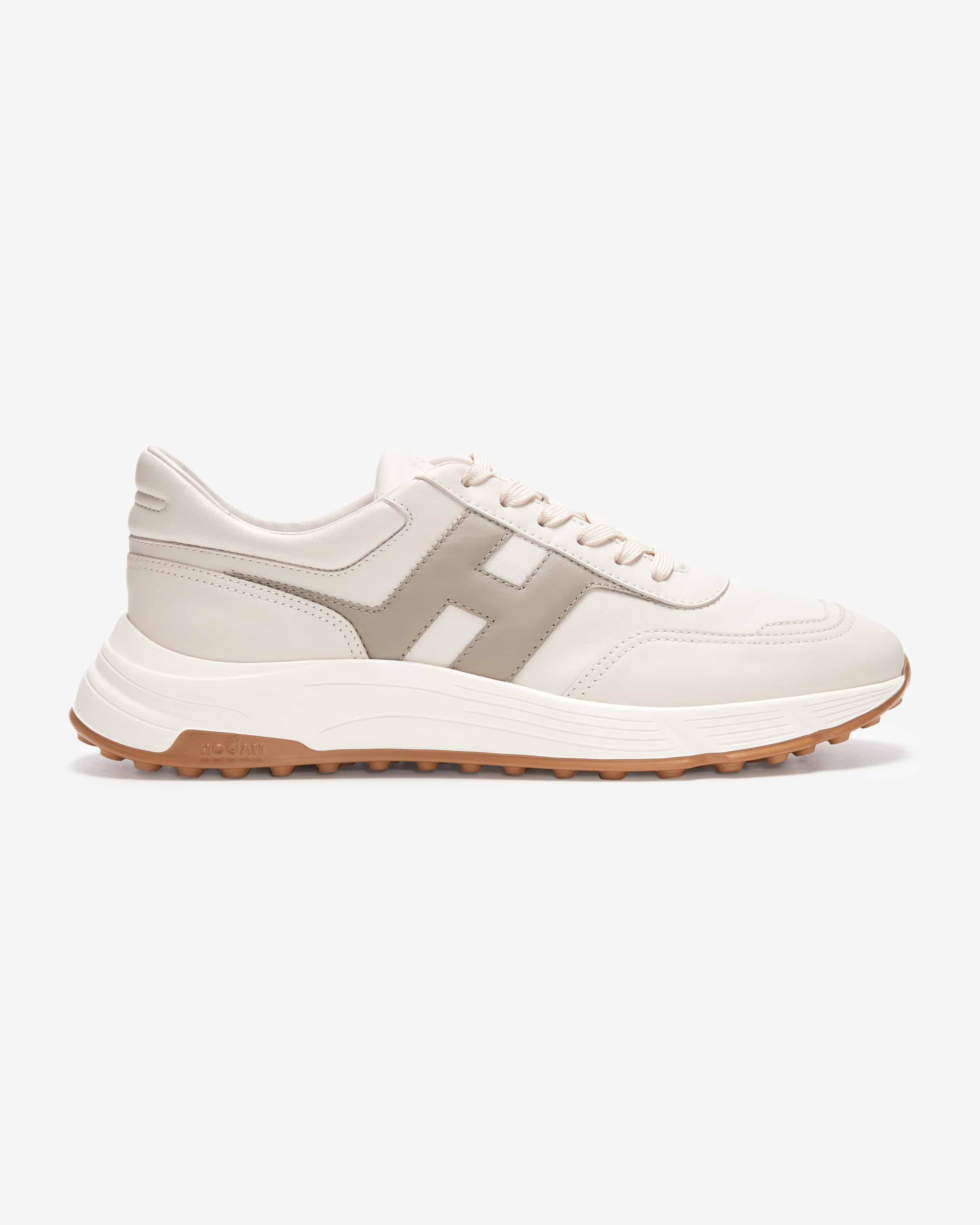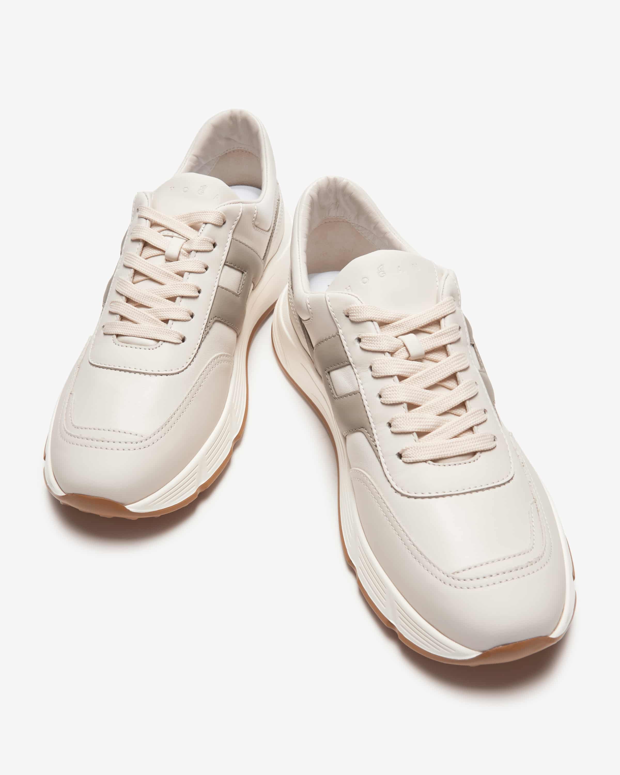 Sneaker Hyperlight für Herren von Hogan in Off-White, Stein und Grau. Das Label legt größten Wert auf hochwertige Verarbeitung und begeistert mit luxuriösem Design. Der ultraleichte Schuh besticht durch die Kombination aus sportivem Design und Glattleder-Aufmachung. Zugleich sorgt die weich gepolsterte Memory Foam-Innensohle für besonders hohen Tragekomfort.