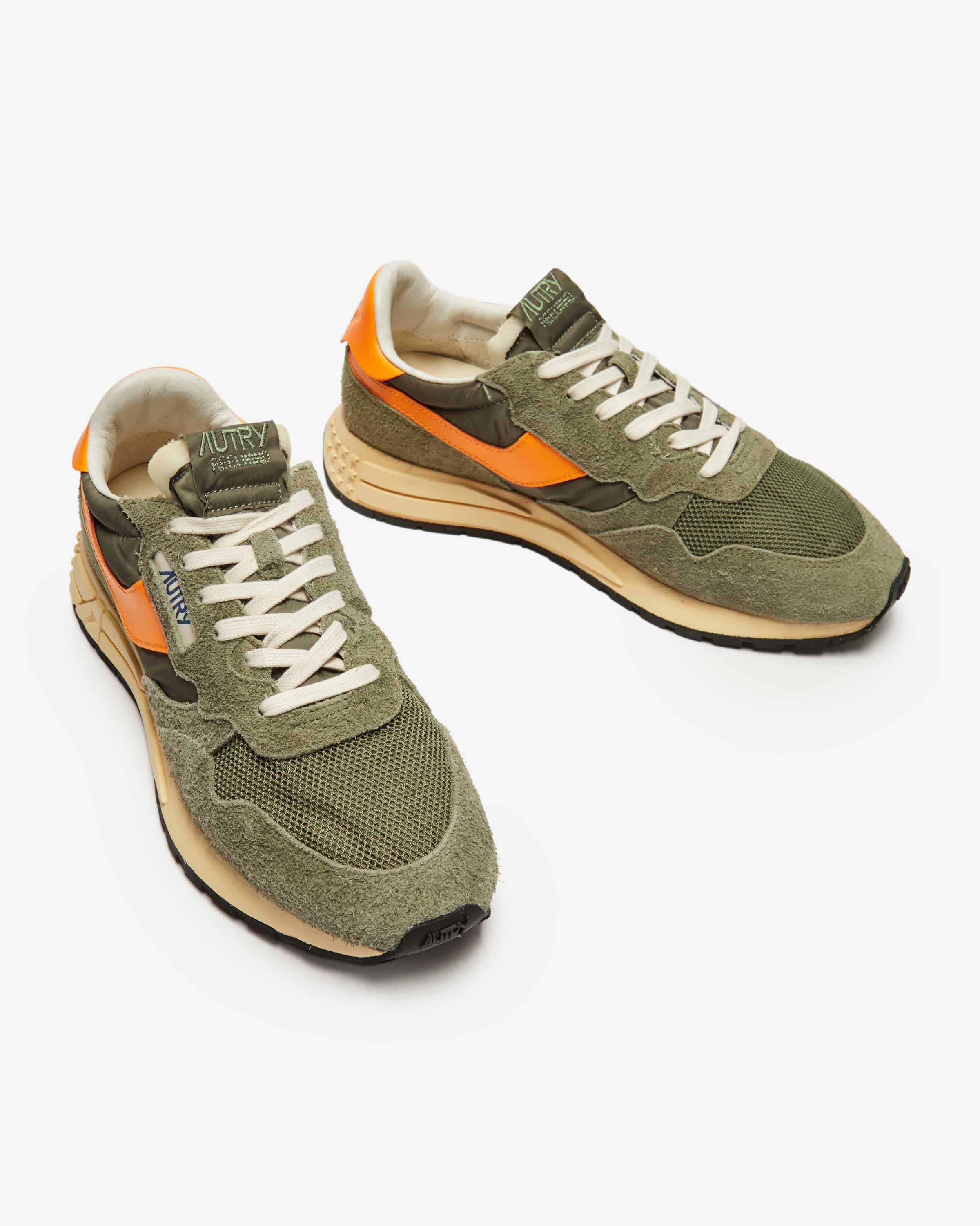 Reelwind Low Sneaker für Herren von Autry in Dunkwlgrün und Orange. Das 1982 in Dallas gegründete Label etablierte sich zu einem der beliebtesten Sneaker-Marken der 1980er Jahre und feierte 2019 sein Comeback. Für dieses Modell ließ sich die Marke von dem dynamischen Design der Runner inspirieren und verbindet fließend die Innovation von Performance-Schuhen mit der Ästhetik der 80er Jahre. Der aus Veloursleder und strapazierfähigem Textil gefertigte Reelwind ist eine außergewöhnliche Kombination aus Stil und Funktionalität.