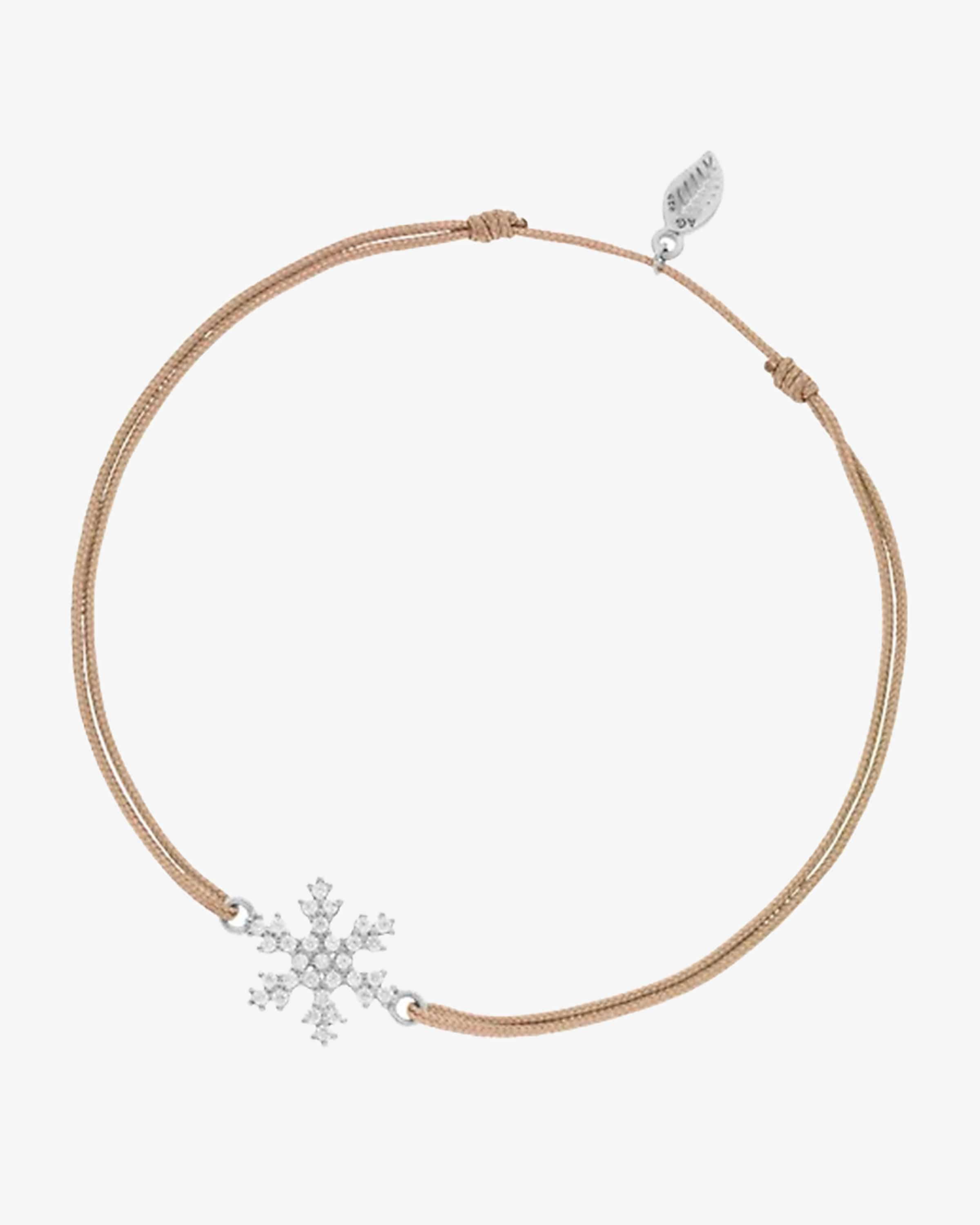 Snowflake Glücksbändchen für Damen von Leaf in Beige und Silber. Dank der silbernen Schneeflocke mit funkelndem Zirkonia-Besatz präsentiert sich das Modell als stilvolles Layering-Accessoire mit besonderem, winterlichem Charme, während das verstellbare Bändchen einen perfekten Sitz verspricht.
