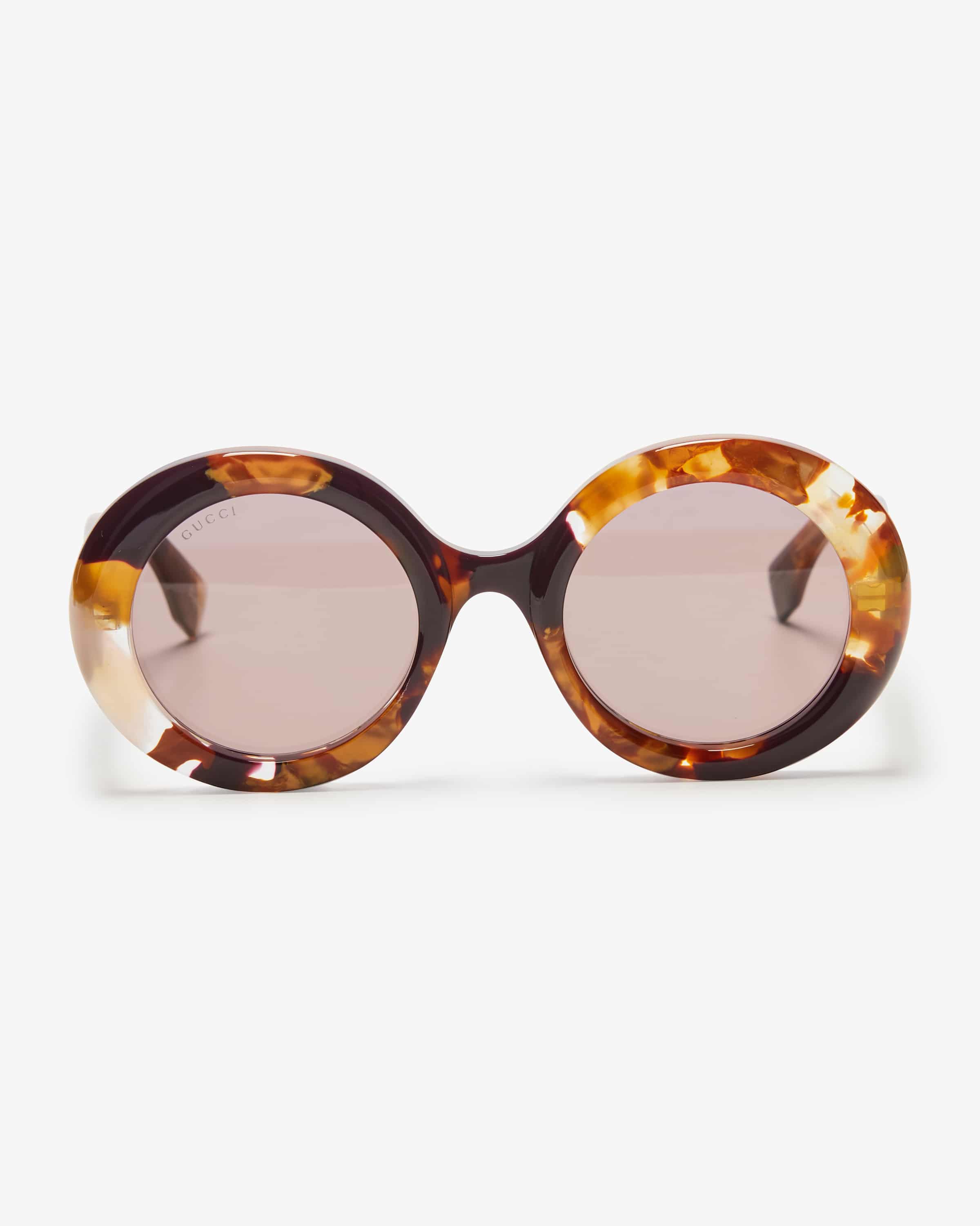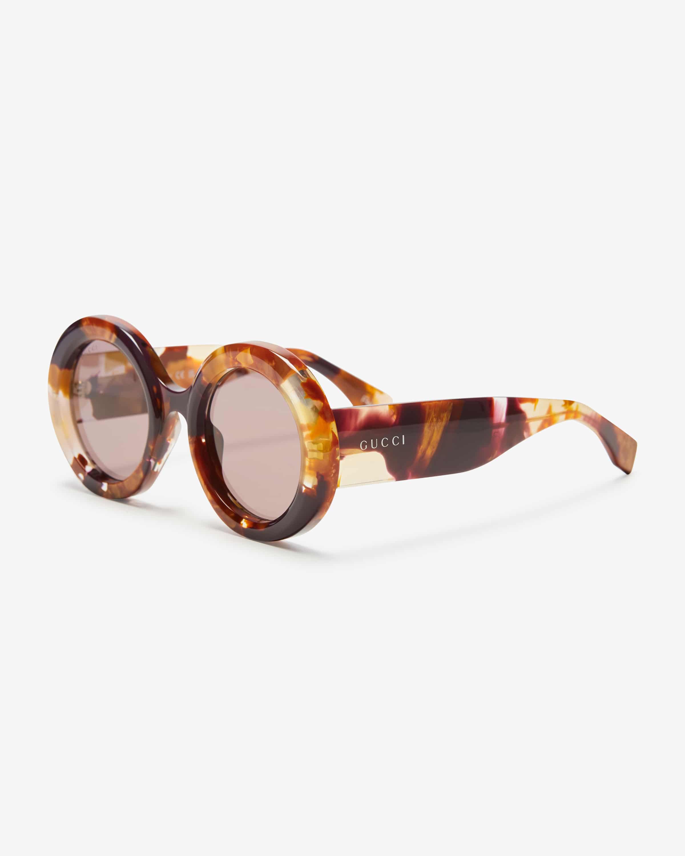 Sonnenbrille für Damen von Gucci Eyewear in Orange, Violett und Ocker. Dank der extravaganten, runden Form mit breiten Bügeln überzeugt das Modell als besonderer Hingucker im Oversize-Look, welchem das nachhaltige ReAce-Design im marmoriertem Farbverlauf einen modischen Touch verleiht.