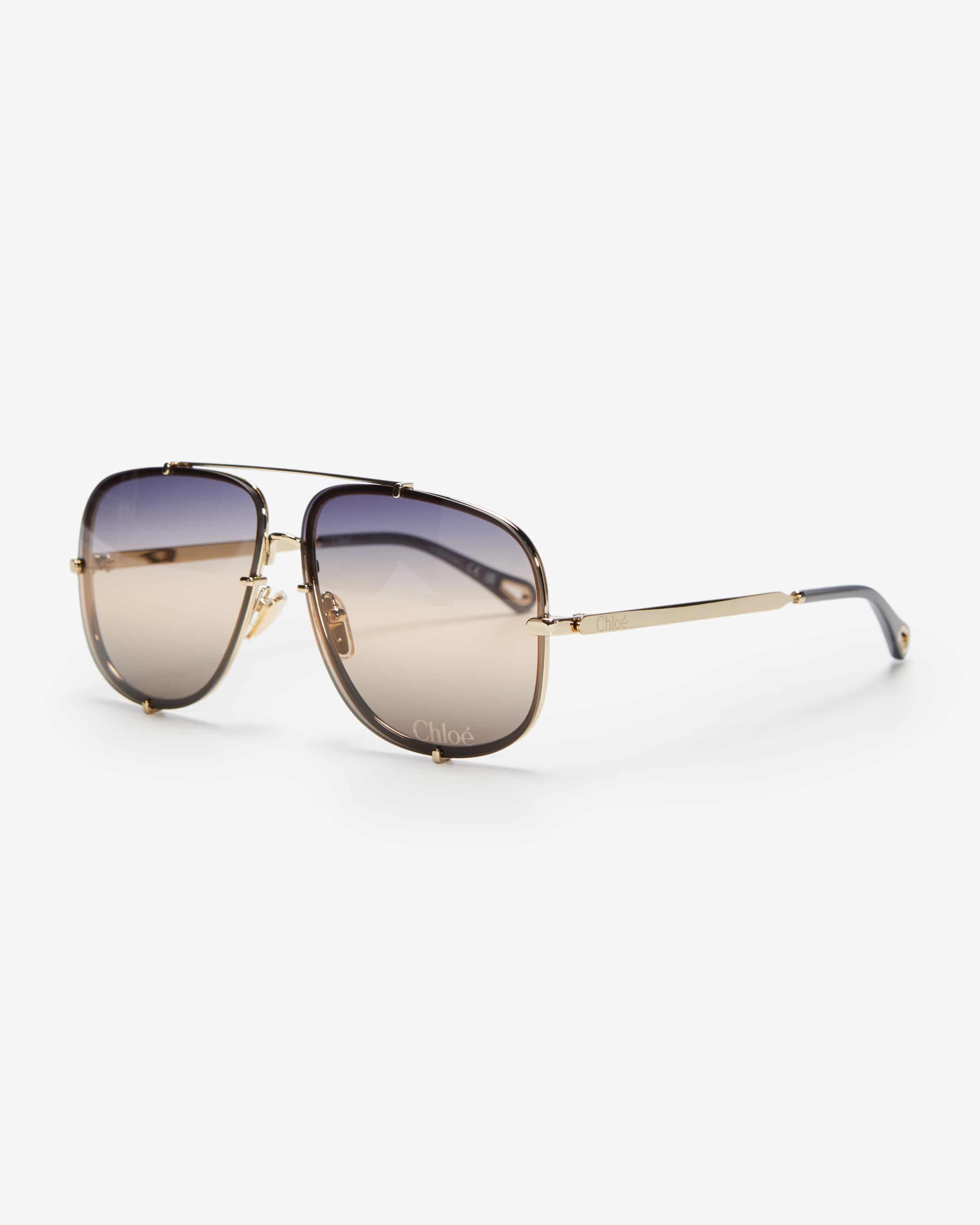 Sonnenbrille für Damen von Chloé Eyewear in Blau, Braun und Gold. Dank abgerundeter Gläser mit schmalen Bügeln avanciert das Modell im Piloten-Stil zum modernen Begleiter für den Sommer, während der semi-transparente Farbverlauf den sonnigen Charakter gekonnt vollendet.