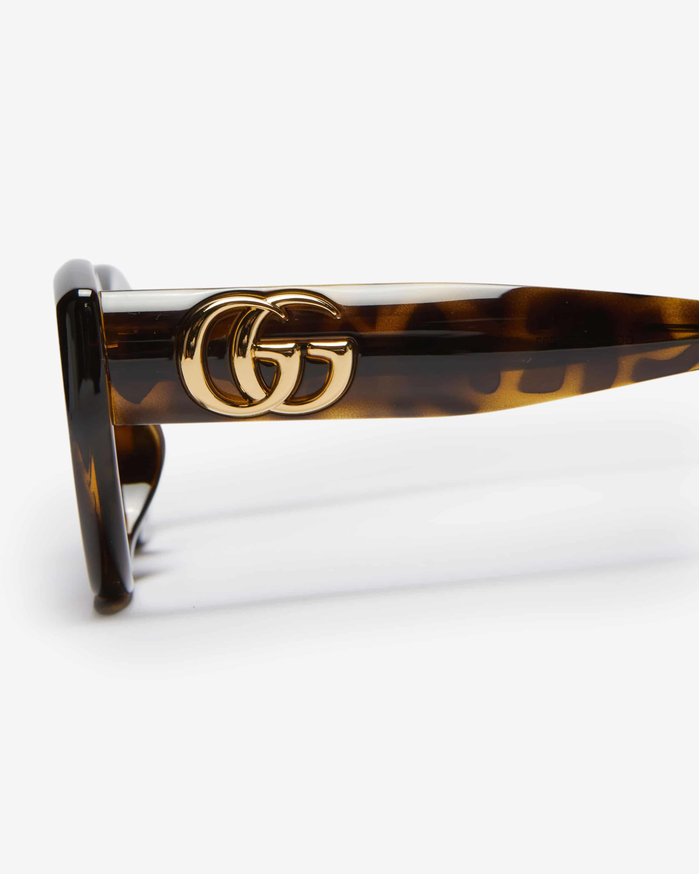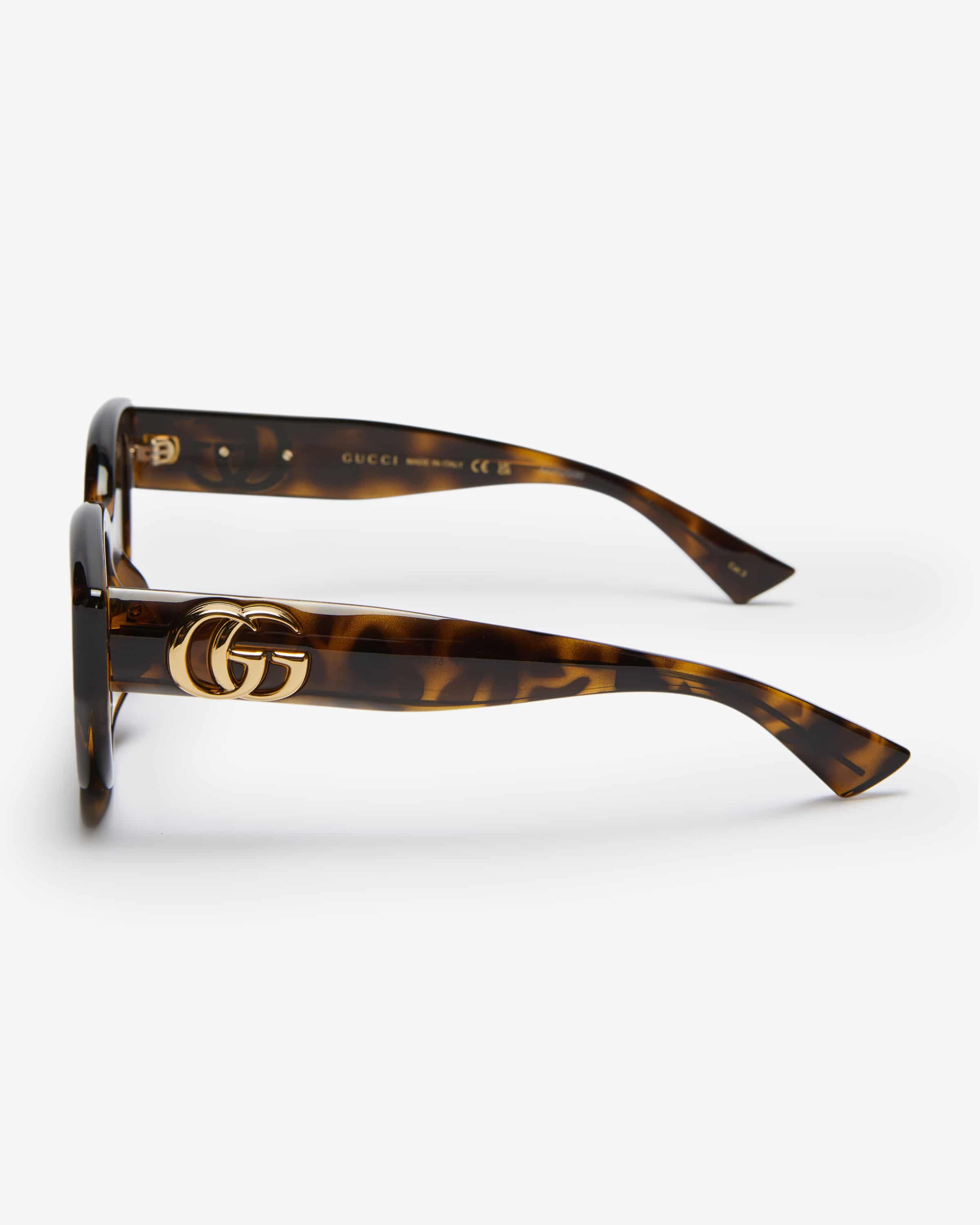 Sonnenbrille für Damen von Gucci Eyewear in Braun. Dank abgerundeter, klassischer Form avanciert das Modell mit breitem Rahmen in Havana-Aufmachung zum modernen Begleiter für sonnige Tage. Die seitlichen, goldfarbenen Logo- Applikationen runden die Brille charakteristisch ab.