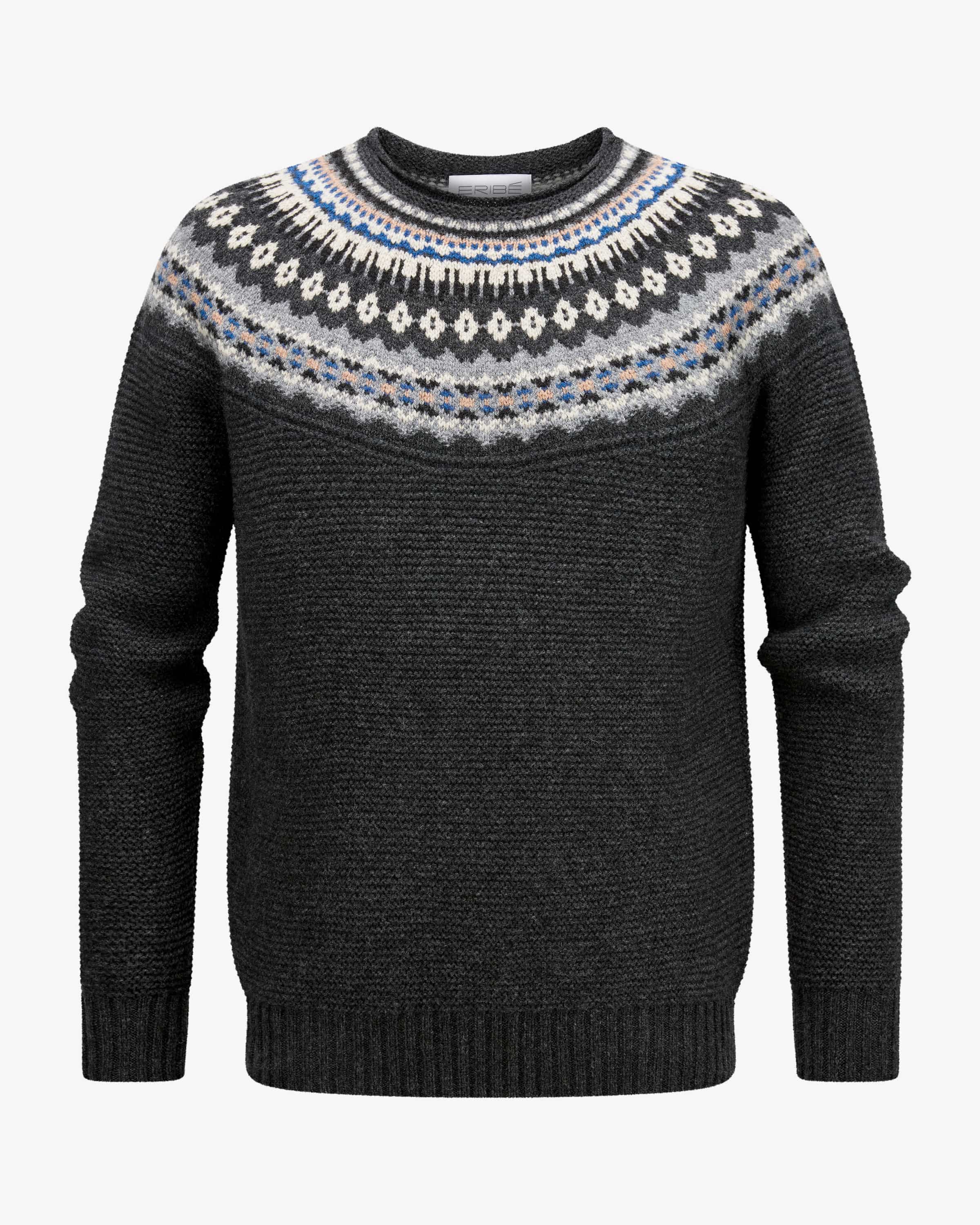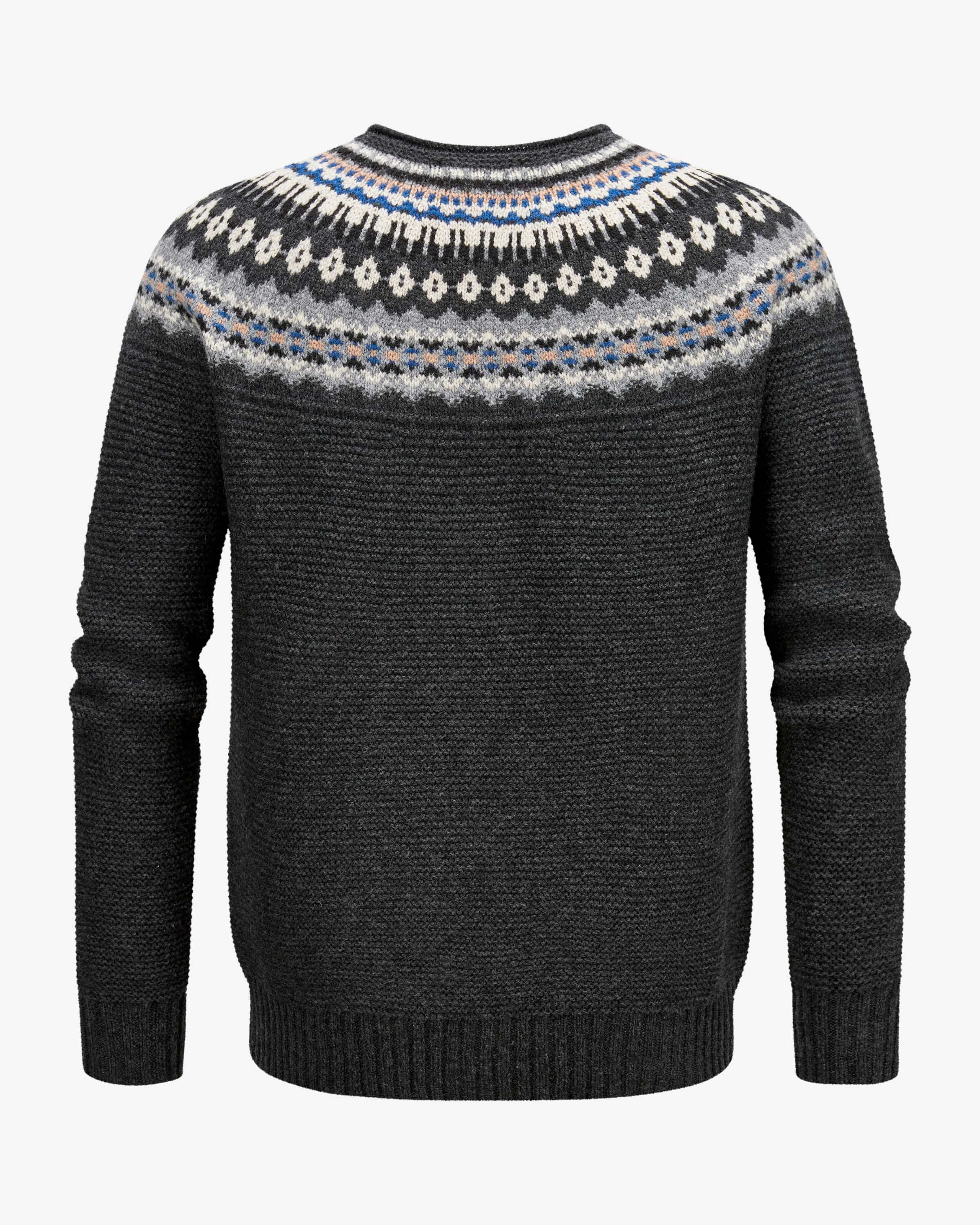 Stoneybrek Pullover für Herren von ERIBE KNITWEAR in Anthrazit, Ecru und Blau. Leger und modisch zugleich – so präsentiert sich das maskuline Modell in hochwertiger Woll-Verarbeitung, während das klassische Norweger-Muster in Kontrastfarben einen kombistarken Favoriten schafft.