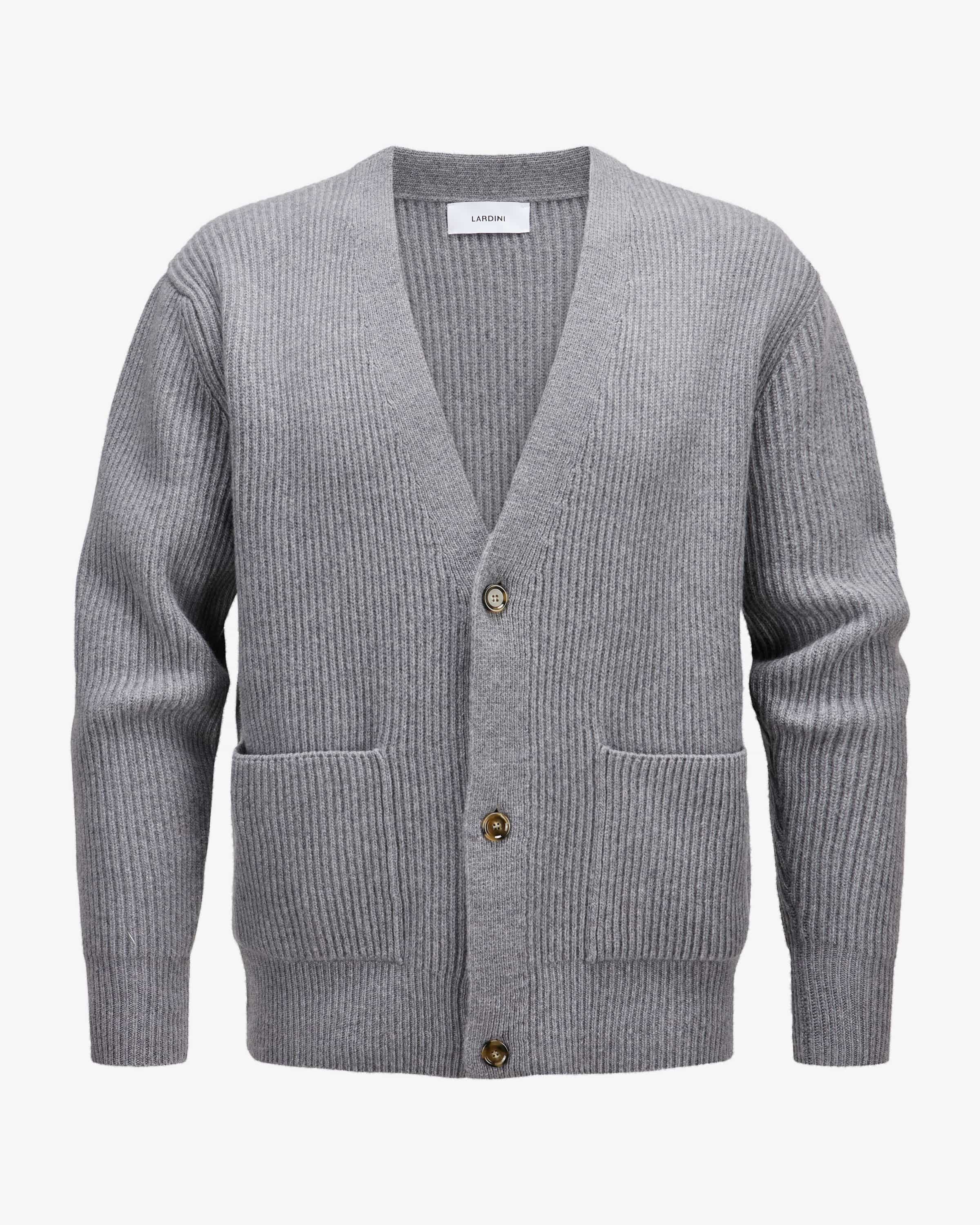 Strickjacke für Herren von Lardini in Grau. Mas Modell aus hochwertiger Schurwolle in Rippstrick-Qualität punktet mit einem besonders weichen Griff. Zugleich schafft die legere Schnittführung einen vielseitigen Alltagsbegleiter.