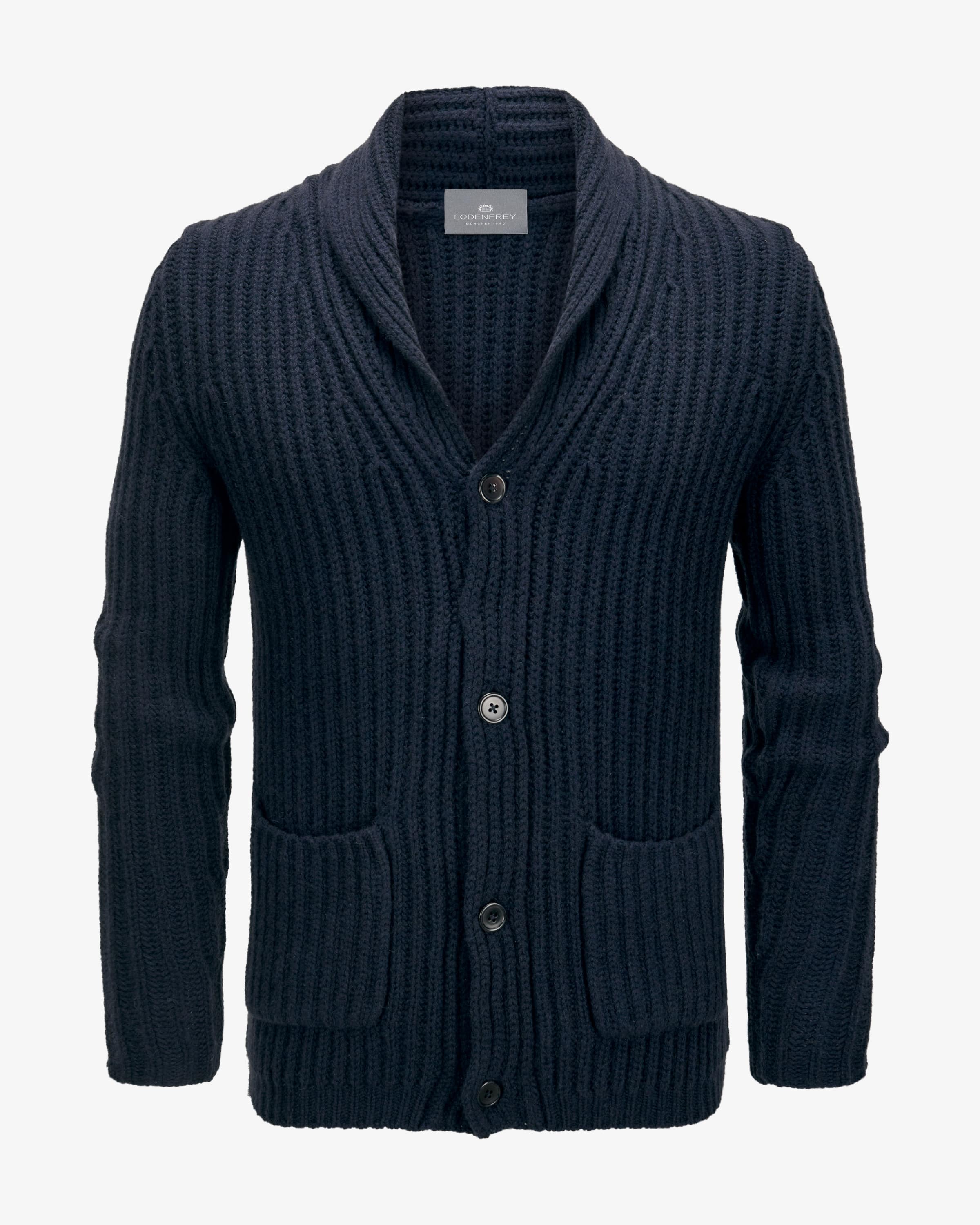 Strickjacke für Herren von LODENFREY in Navy. Das Modell überzeugt dank hochwertiger Cashmere-Qualität mit besonders weicher Haptik, während das gerippte Grobstrick-Design mit aufgesetzten Taschen einen legeren Strick- Begleiter schafft.