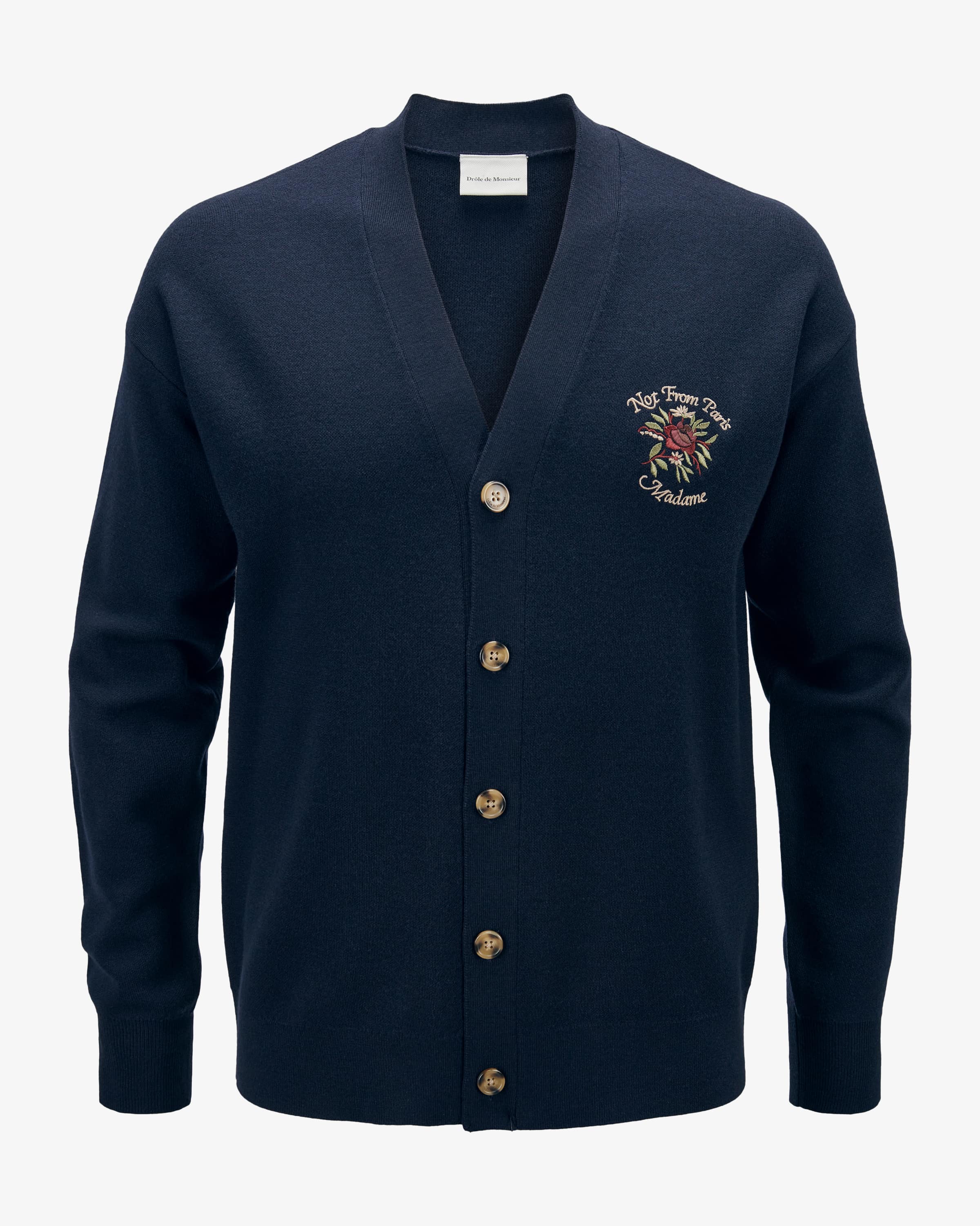 Strickjacke für Herren von Drole de Monsieur in Navy. Das Label wurde 2014 in Dijon gegründet und steht für einzigartige, tragbare Designs mit retro- inspirierter Ästhetik. Auch dieses Modell präsentiert sich mit schwerer Merinowolle-Qualität, während die florale Slogan-Stickerei und legere Details die Oversize-Silhouette gekonnt abrunden.