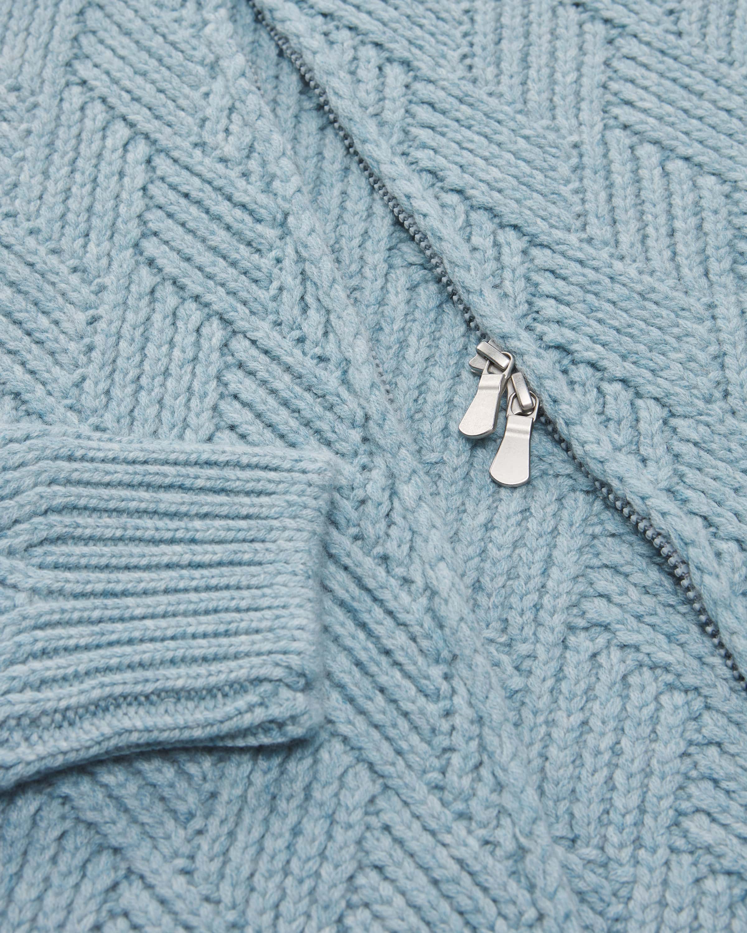 Gitterstrickmuster als auch klassische Rippstrick-Elemente lassen das Modell zu