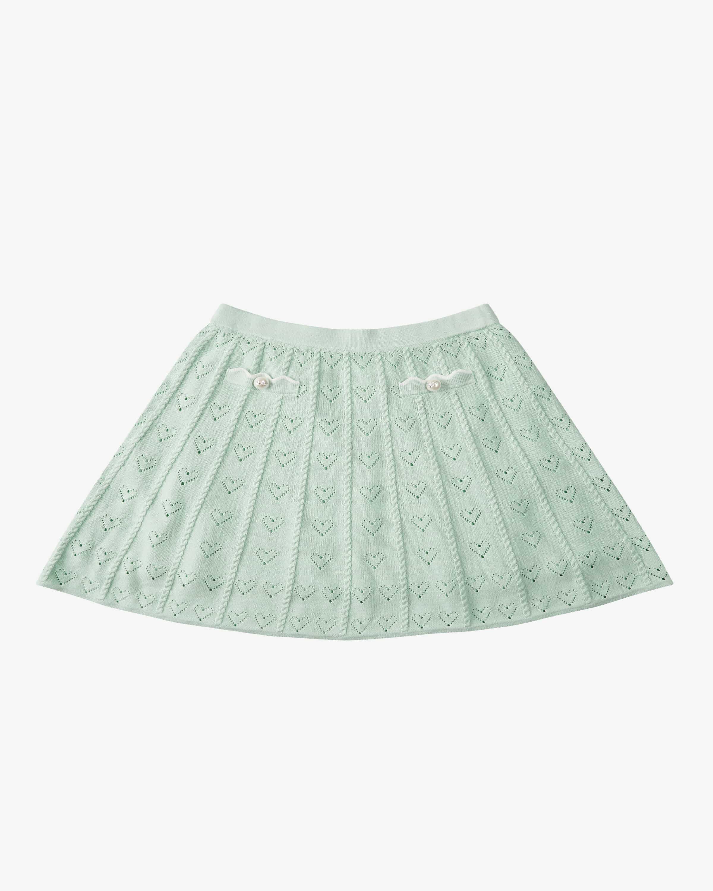 Stickrock für Mädchen von Self-Portrait Kids in Mint. Die Londoner Marke bringt ihren eleganten Stil nun auch in die Kindermode – verspielt, mädchenhaft, besonders. Das Modell in angenehmer Haptik überzeugt mit niedlicher Aufmachung, während die Kugelknöpfe für optische Akzente sorgen. Perfekt für festive Anlässe.
