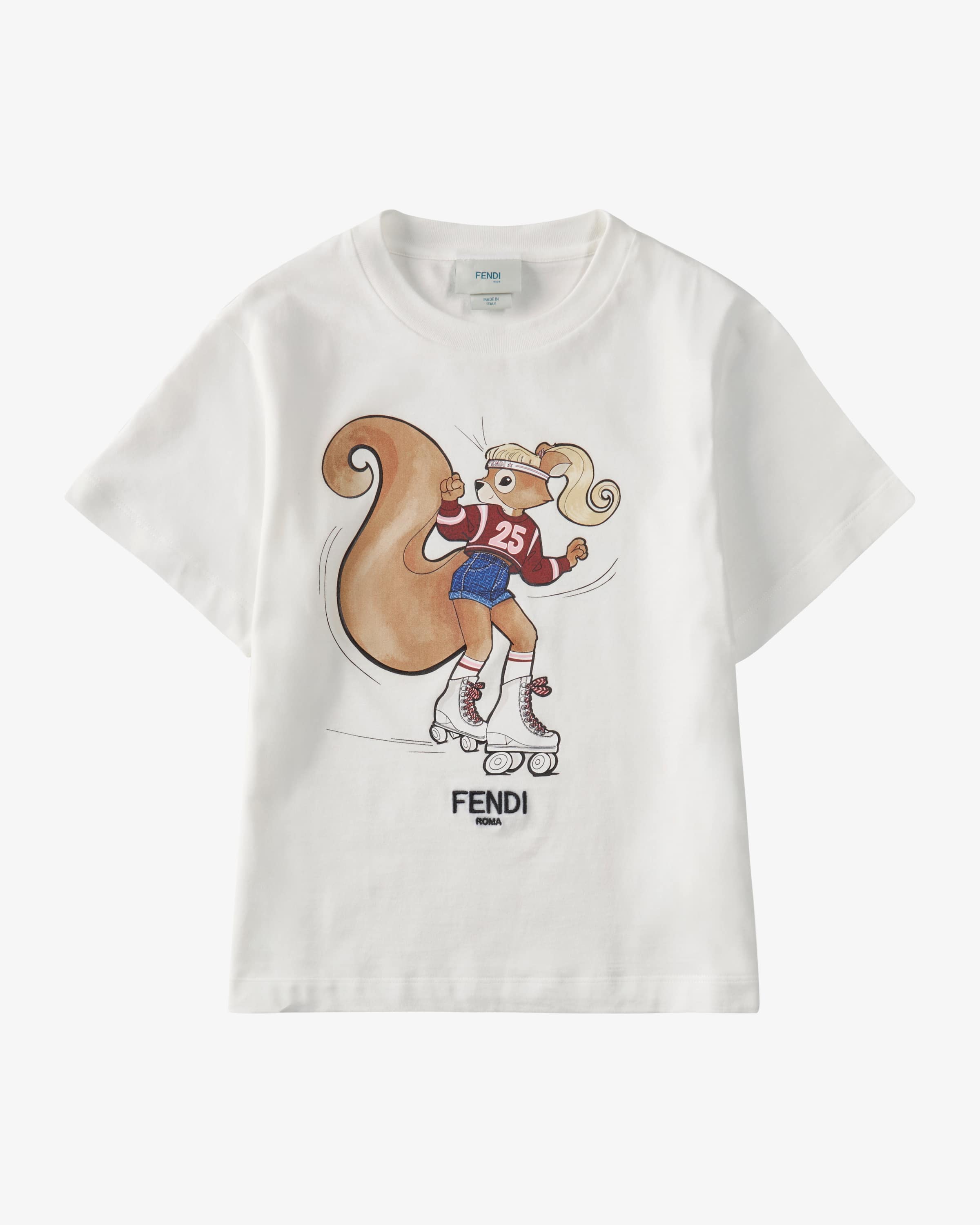 T-Shirt für Mädchen von Fendi Kids in Weiß und Bunt. Das Modell in hochwertiger Baumwoll-Qualität überzeugt mit angenehmen Tragemomenten, während der niedliche Eichhörnchen-Skate-Print den Gesamtlook harmonisch vollendet.