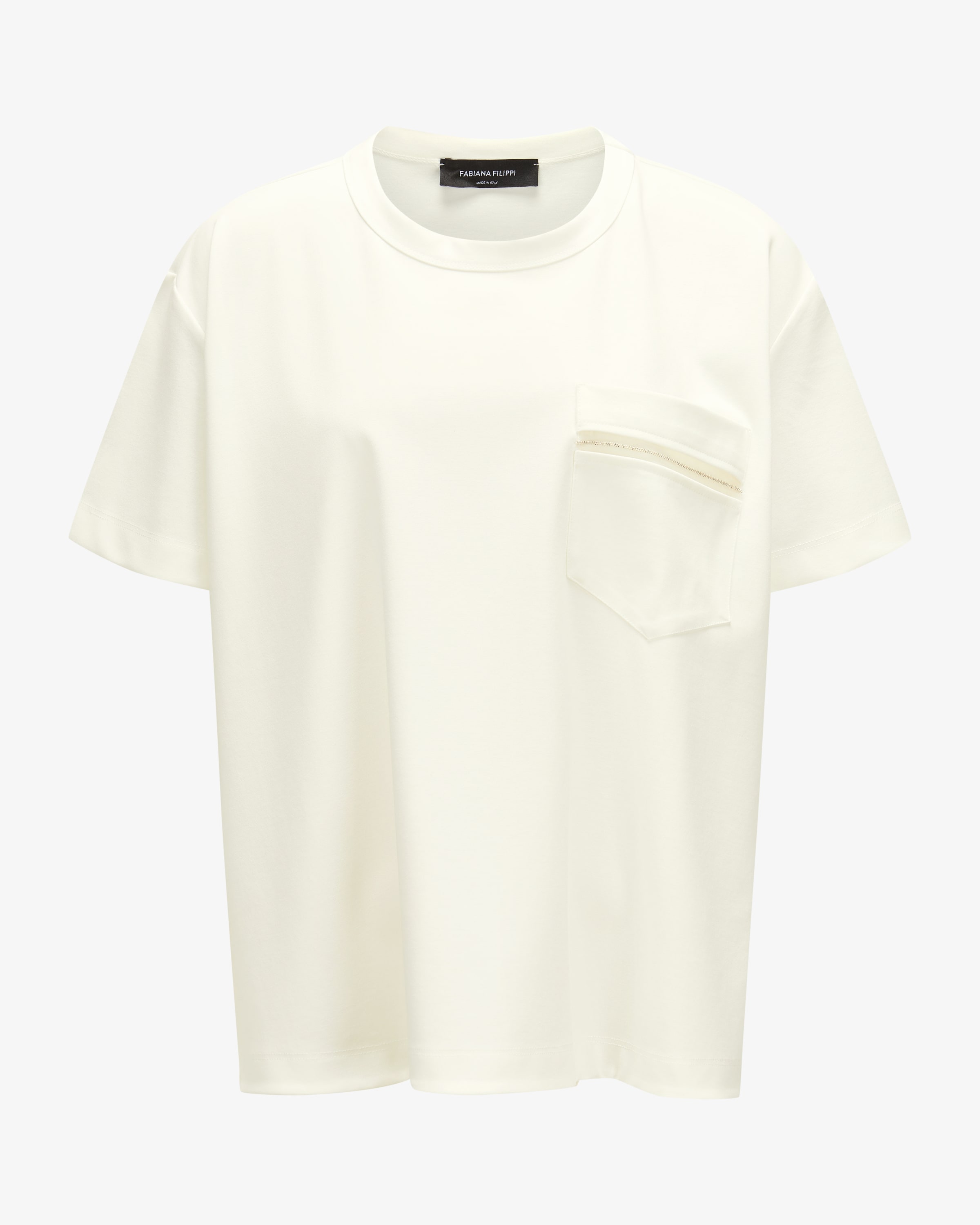 T-Shirt für Damen von Fabiana Filippi in Weiß. Das Modell präsentiert sich dank der ausgestellten Oversize-Passform in modischer Aufmachung, während die Brusttasche mit Schmuckketten-Detail dem Gesamtbild den letzten Schliff verleiht.