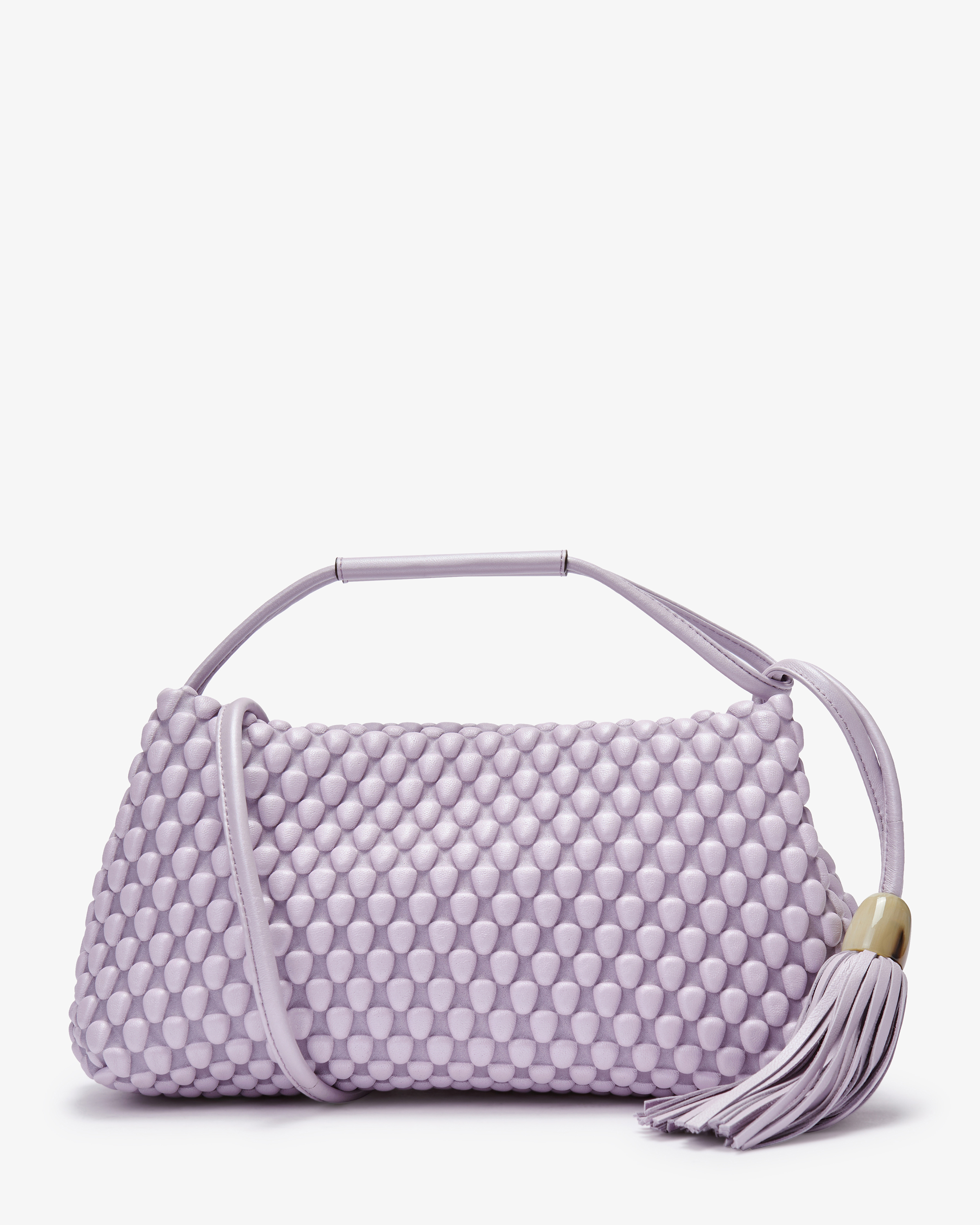 Tango Umhängetasche von Tissa Fontaneda in Flieder. Das 2010 gegründete Label vereint Handwerkliches Können und Liebe zum Detail. Die sofort erkennbare „Bubble Bag“ ist zum Markenzeichen der Kollektion Tissa Fontaneda geworden. Auch dieses Modell begeistert in charakteristischer Aufmachung mit strukturierter Optik, während die Quasten-Applikation den letzten Schliff verleiht.