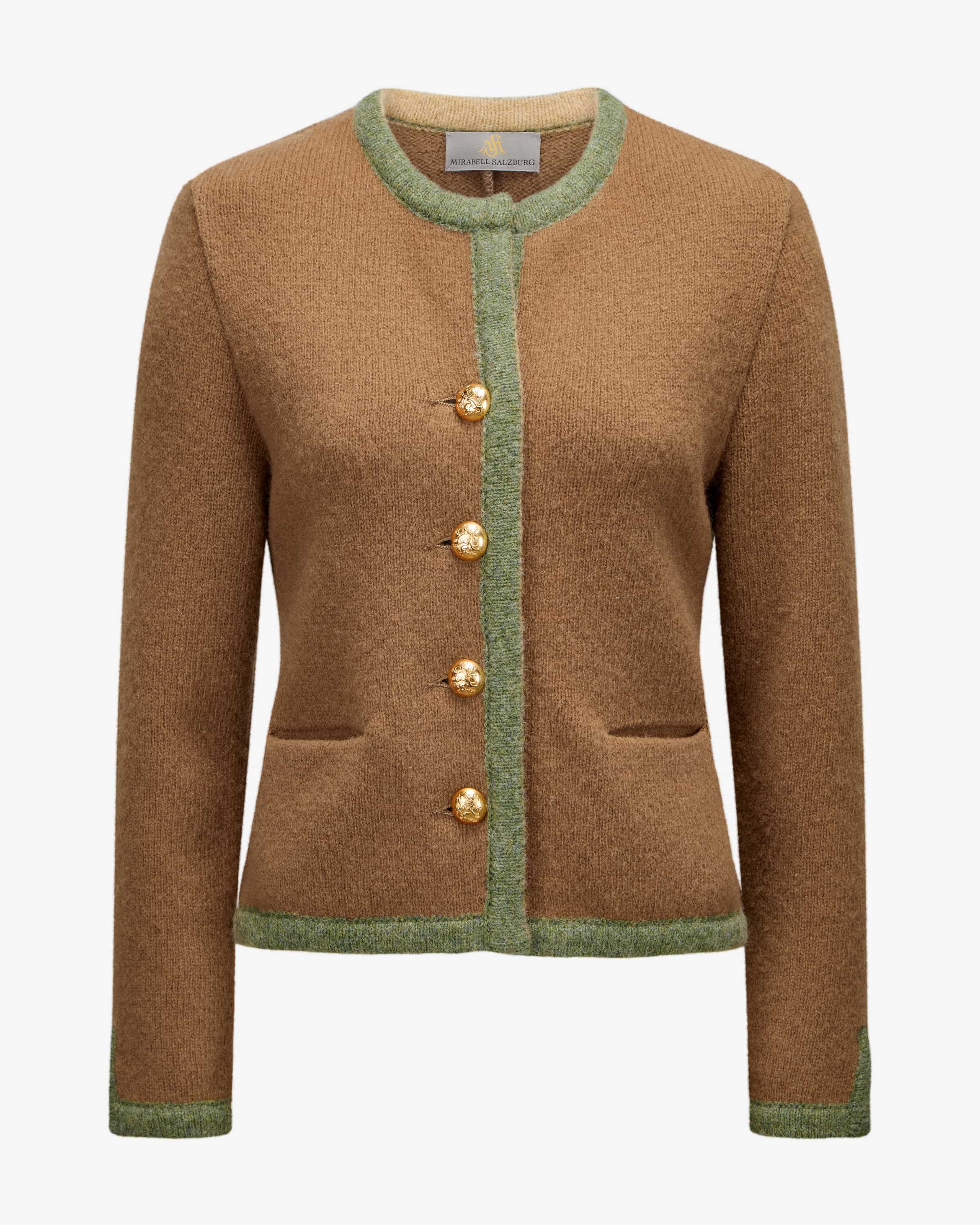 Trachten-Strickjacke für Damen von Mirabell in Camel und Grün. Die hochwertige Schurwoll-Qualität verleiht dem klassischen Modell eine unverwechselbare Haptik, während goldfarbene Wappenknöpfe sowie kontrastierende Elemente einen traditionellen Look mit moderner Note schaffen.