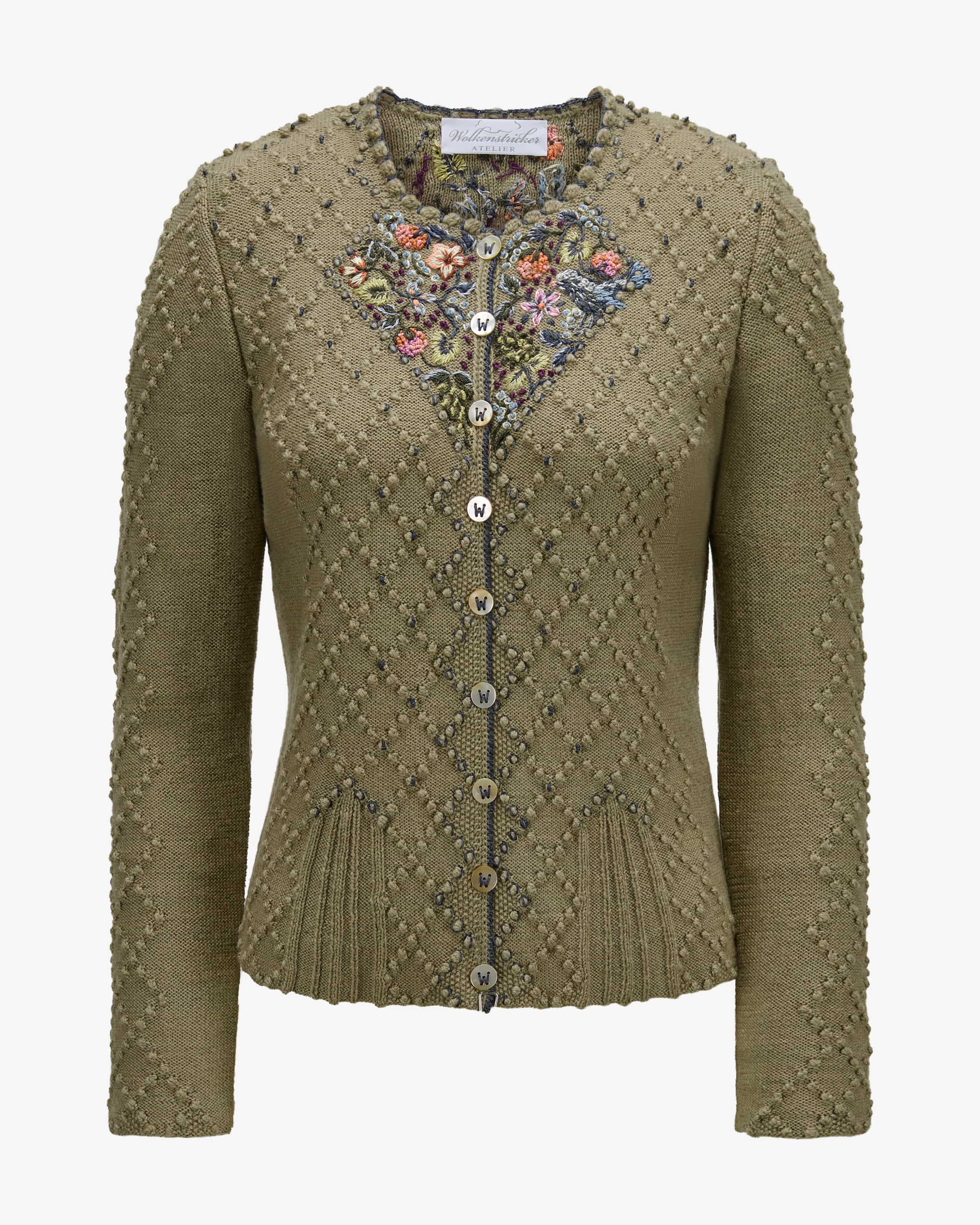 Trachten-Strickjacke für Damen von Wolkenstricker in Khaki und Bunt. Dank der feinen Strick-Qualität und der Verwendung von hochwertiger Merino-Lyocell-Wolle überzeugt das Modell mit weicher Haptik, die für besonders angenehme Tragemomente sorgt. Zugleich rundet das besondere Strick-Design das Gesamtbild harmonisch ab.