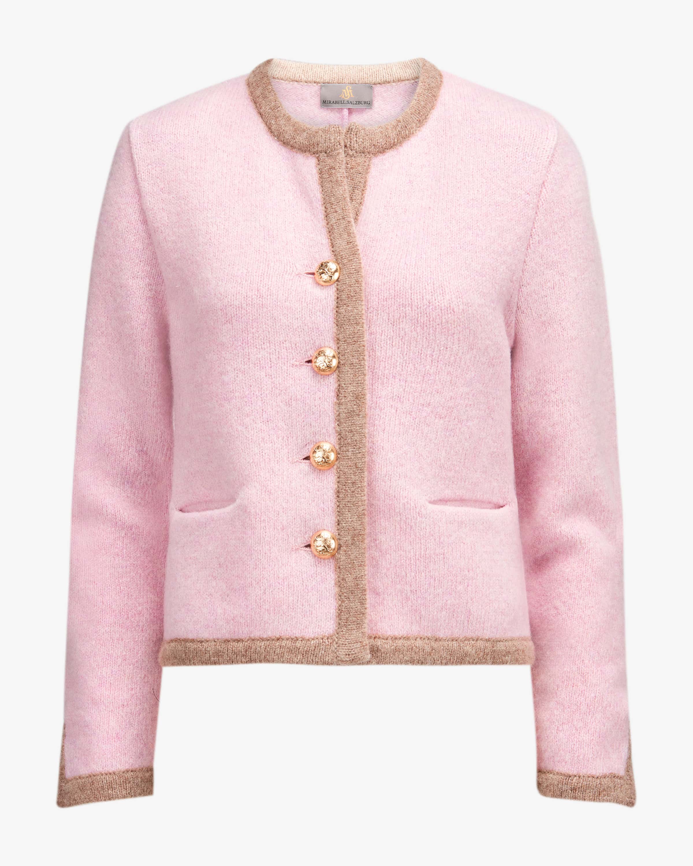 Trachten-Strickjacke für Damen von Mirabell in Rosé und Beige. Die hochwertige Schurwoll-Qualität verleiht dem klassischen Modell eine unverwechselbare Haptik, während goldfarbene Wappenknöpfe sowie kontrastierende Elemente einen traditionellen Look mit moderner Note schaffen.