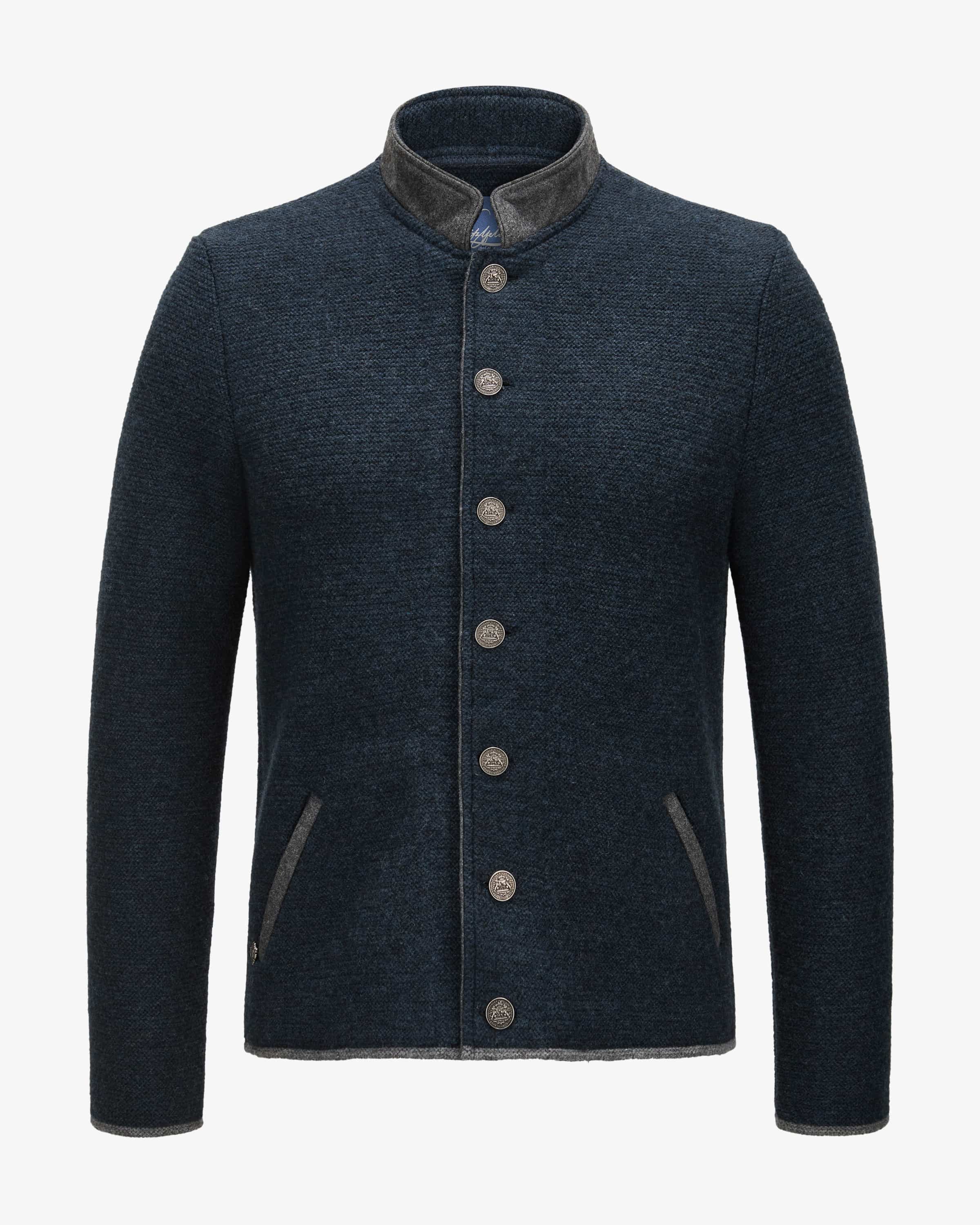 Trachten-Strickjacke für Herren von Litzlfelder Strickmoden in Marine und Grau. Klassisch gestrickt und aus hochwertiger Merinowolle gefertigt, überzeugt das Modell in traditioneller Aufmachung. Kontrastpaspeln als auch rustikale Wappenknöpfe vollenden das Gesamtbild gekonnt.