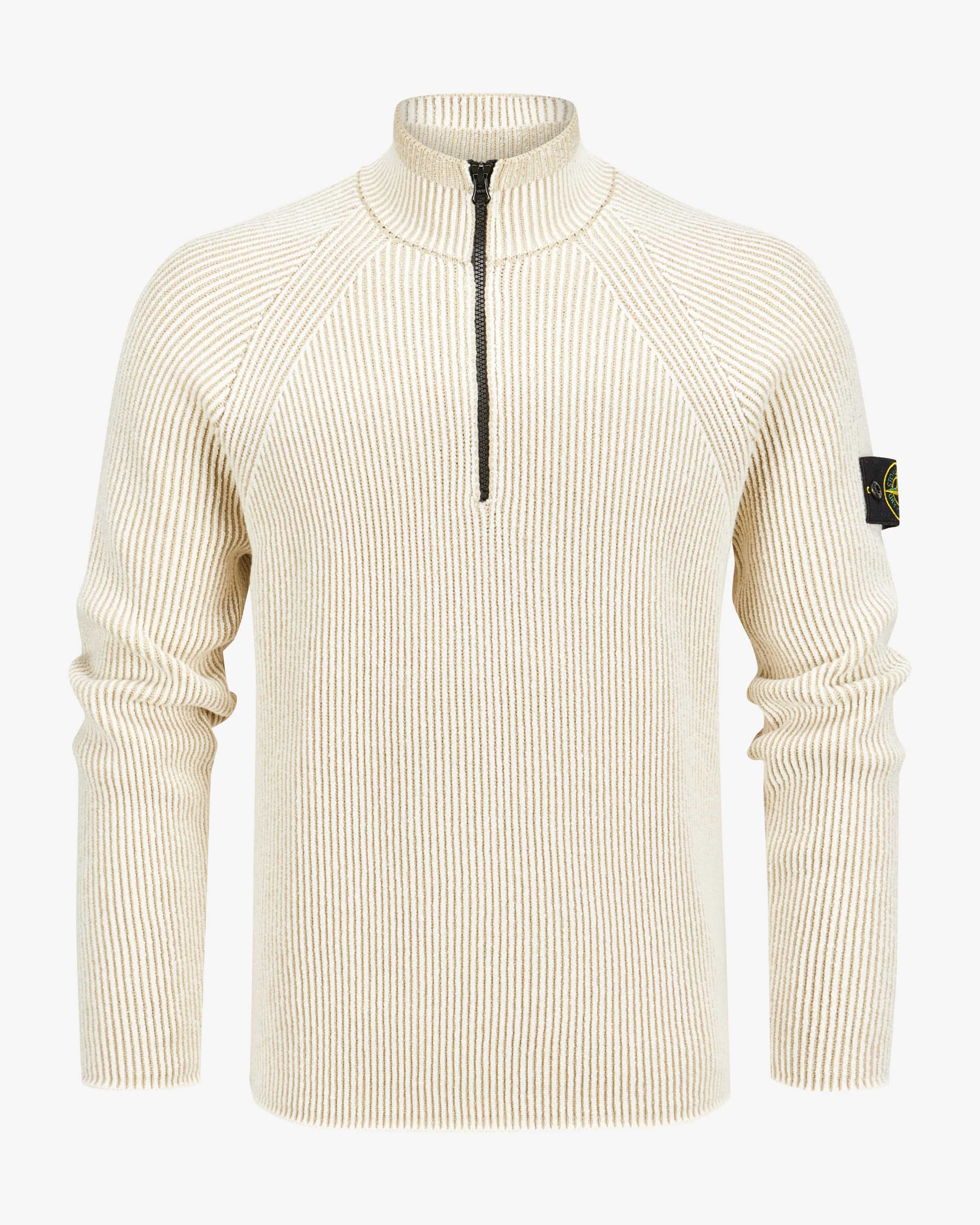Troyer für Herren von Stone Island in Creme und Beige. Das Modell präsentiert sich in modischem Bicolor-Design und schwerer Strick-Haptik aus elastischem Schurwoll-Baumwoll-Mix, während die labeltypische Logo-Plakette am Ärmel charakteristische Akzente setzt.