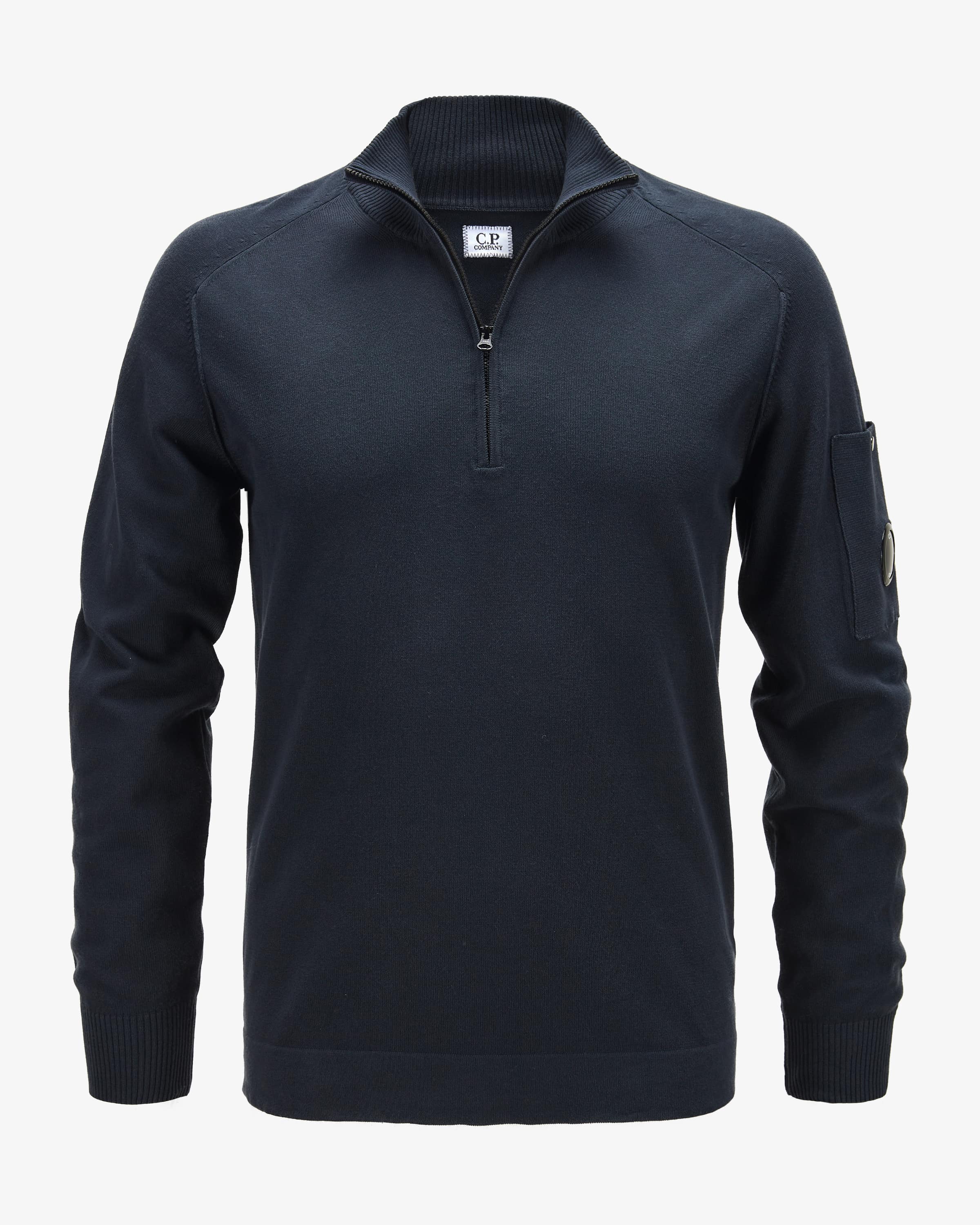Troyer für Herren von C.P. Company in Navy. Die italienische Marke verbindet Militärästhetik mit Funktion und ist bekannt für innovative Materialien und Färbetechniken. Dieses Modell punktet dank leichter Baumwoll-Qualität mit angenehmer Strick-Haptik, während die Troyer-Aufmachung mit markanten Nähten sowie die Ärmeltasche mit charakteristischer Logo-Applikation den Look sportiv unterstreichen und die Ästhetik gekonnt widerspiegeln.