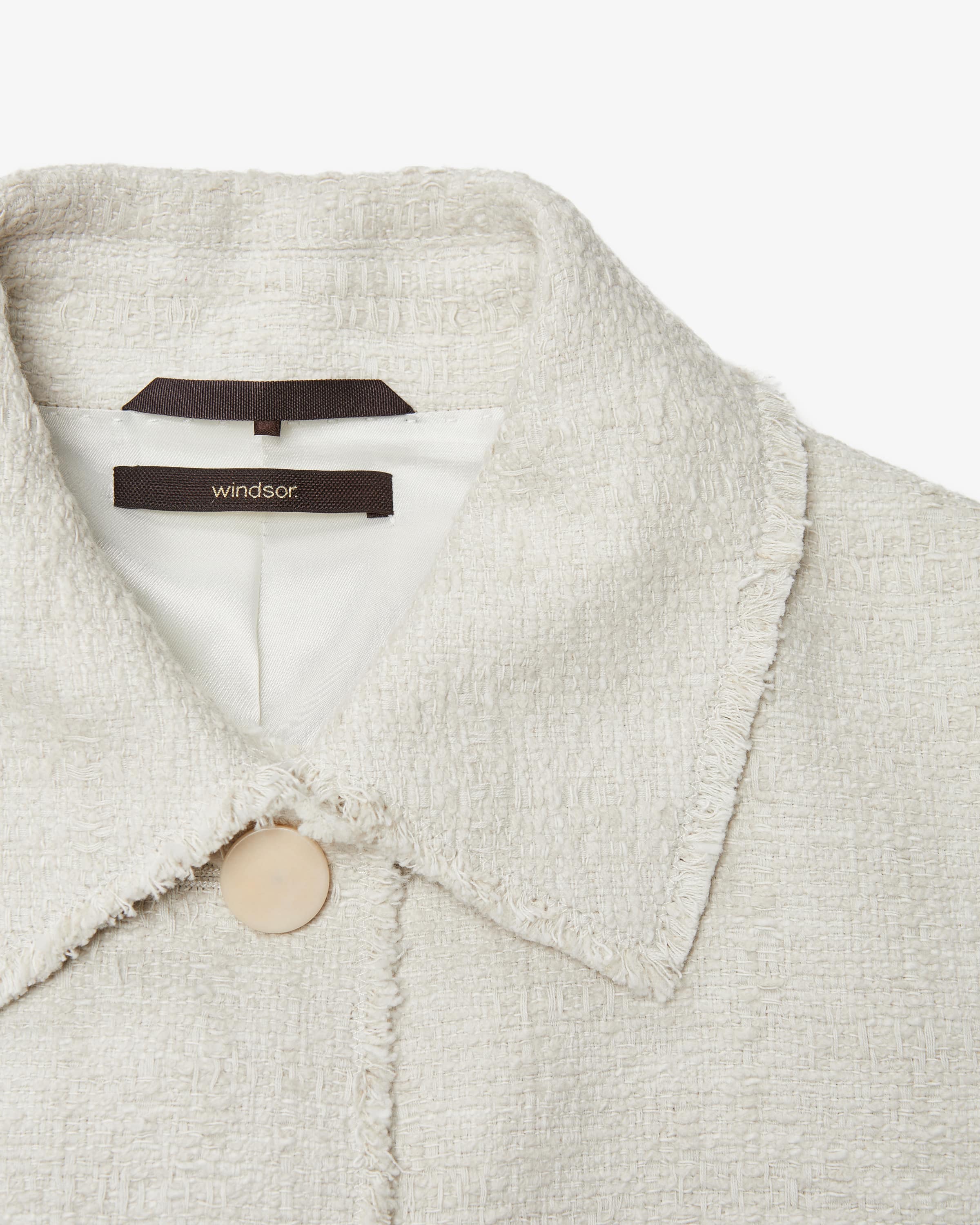 Tweedblazer für Damen von Windsor in Creme. Das Schweizer Label steht für elegante Businessmode und urbane Klassiker mit dezentem Luxusanspruch. Das Modell zeichnet sich durch den hochwertigen Baumwoll-Mix in edler Tweed- Aufmachung aus, während die kastige Silhouette einen stilsicheren Begleiter für feminine Looks kreiert.