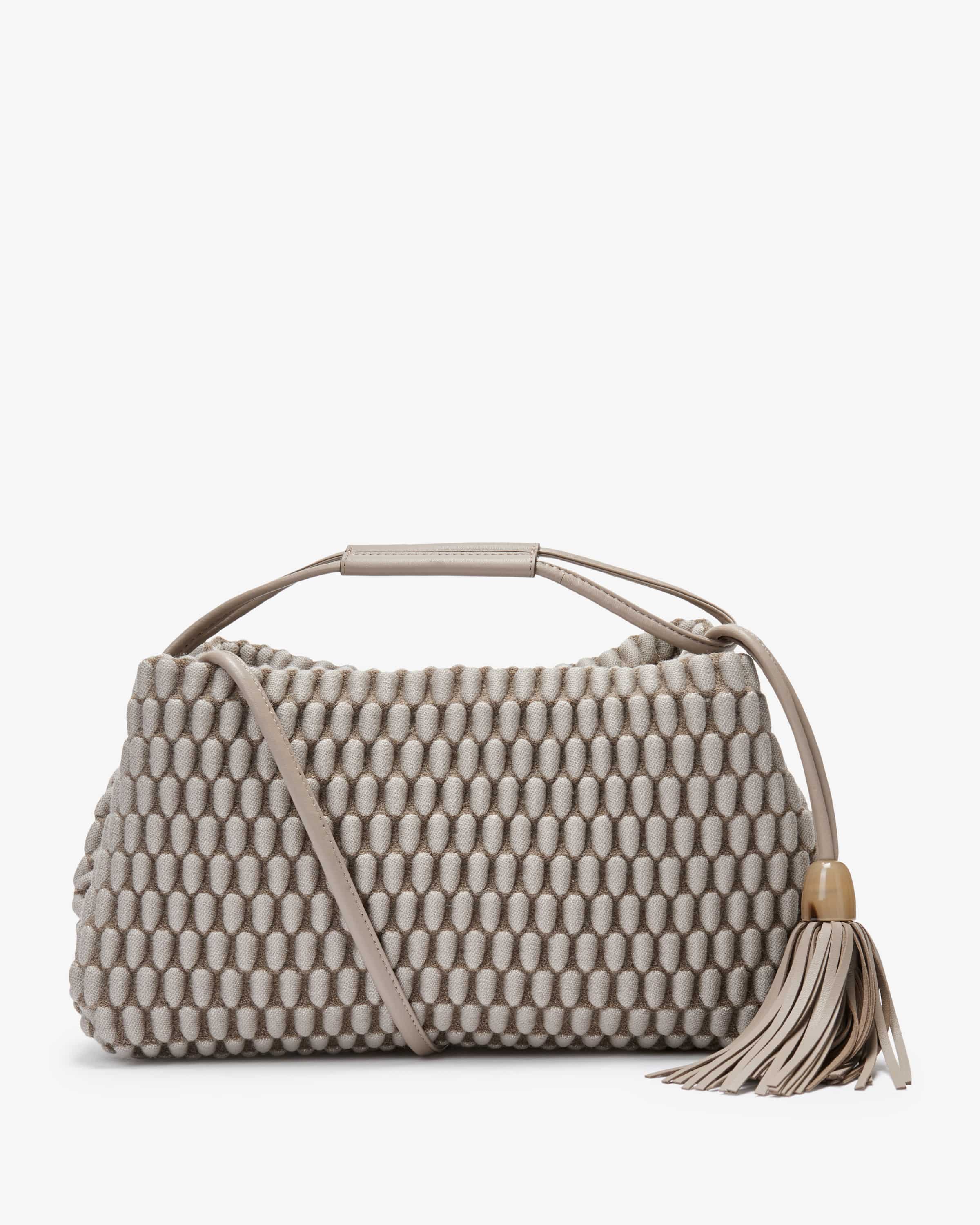 Umhängetasche Tango Large von Tissa Fontaneda in Taupe und Grau. Das 2010 gegründete Label vereint Handwerkliches Können und Liebe zum Detail. Die sofort erkennbare „Bubble Bag“ ist zum Markenzeichen der Kollektion Tissa Fontaneda geworden. Auch dieses Modell begeistert in charakteristischer Aufmachung mit strukturierter Optik in Textil-Qualität, während Leder-Details zusammen mit der stilvollen Quaste den letzten Schliff verleihen.