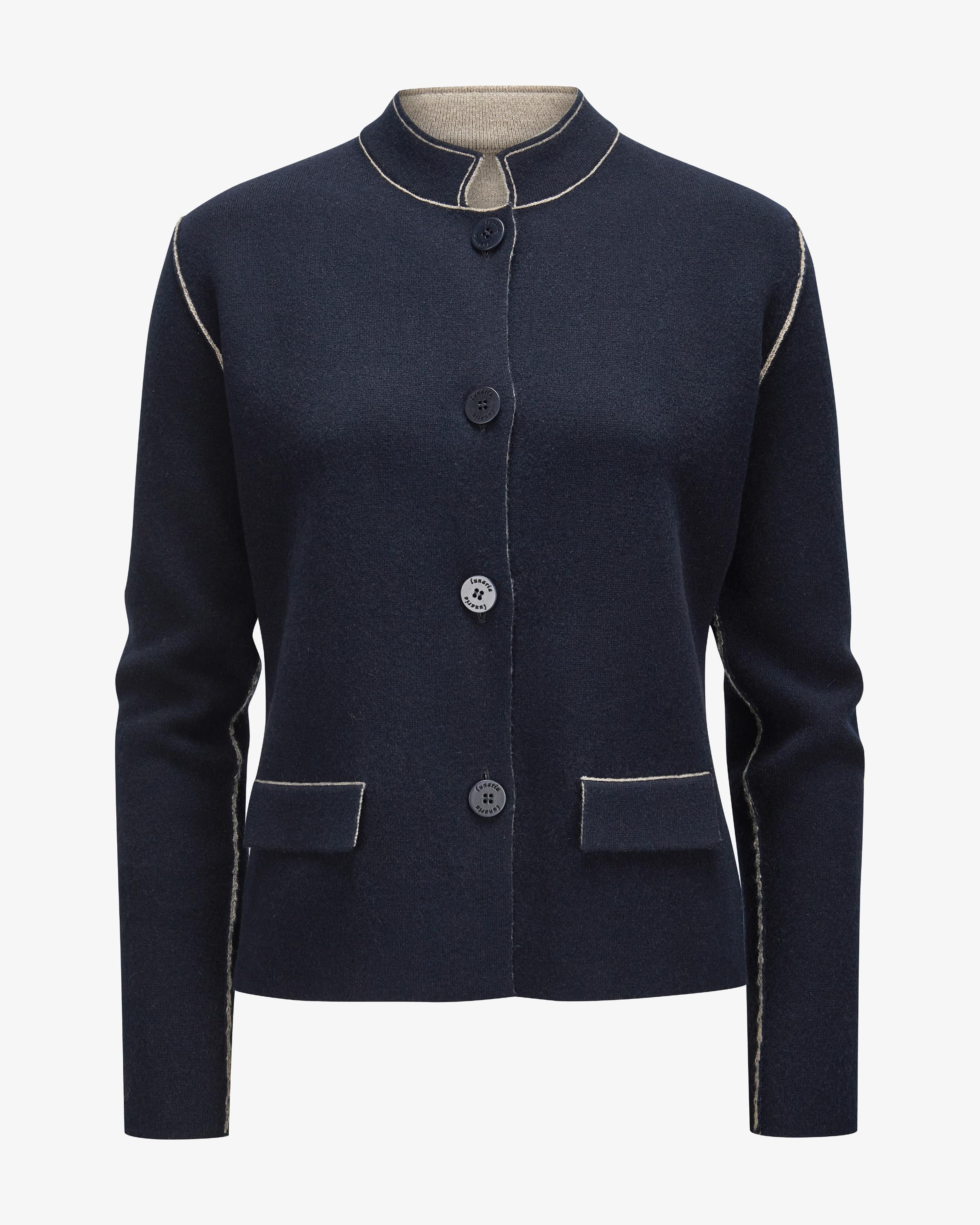 Cashmere-Wende-Strickjacke für Damen von Lunaria in Navy und Beige. Dank der Verwendung von hochwertiger Cashmere-Wolle besticht das Modell mit besonders weichem Griff, während die Inside-Out-Nähte modische Akzente setzen. Zugleich kann die Jacke dank der Wende-Funktion vielseitig kombiniert werden.