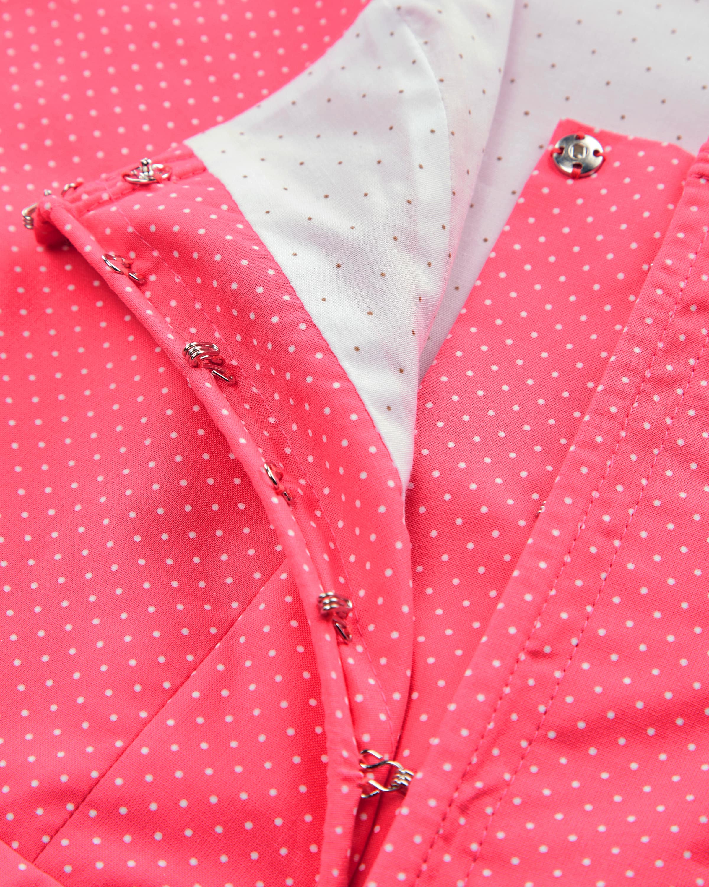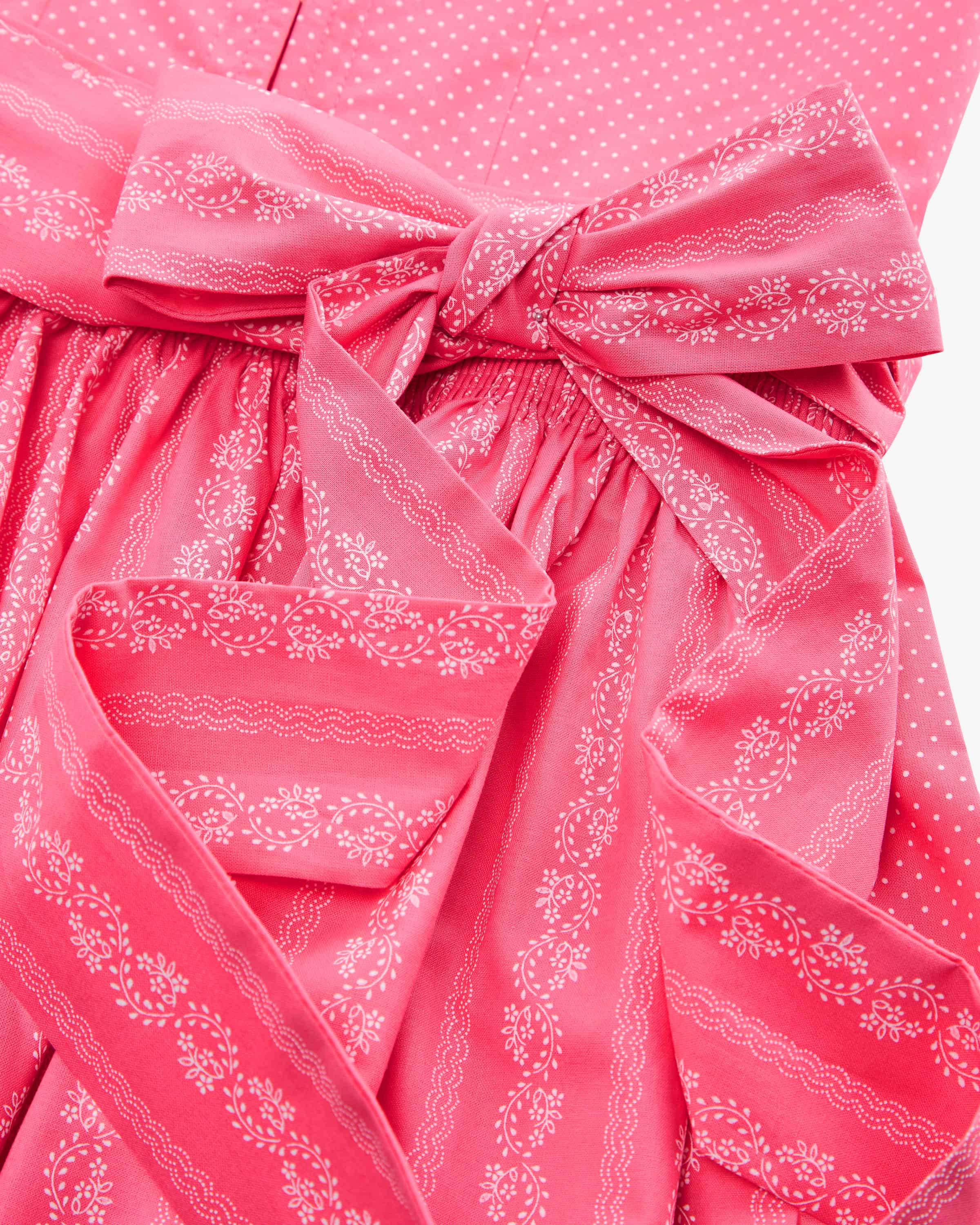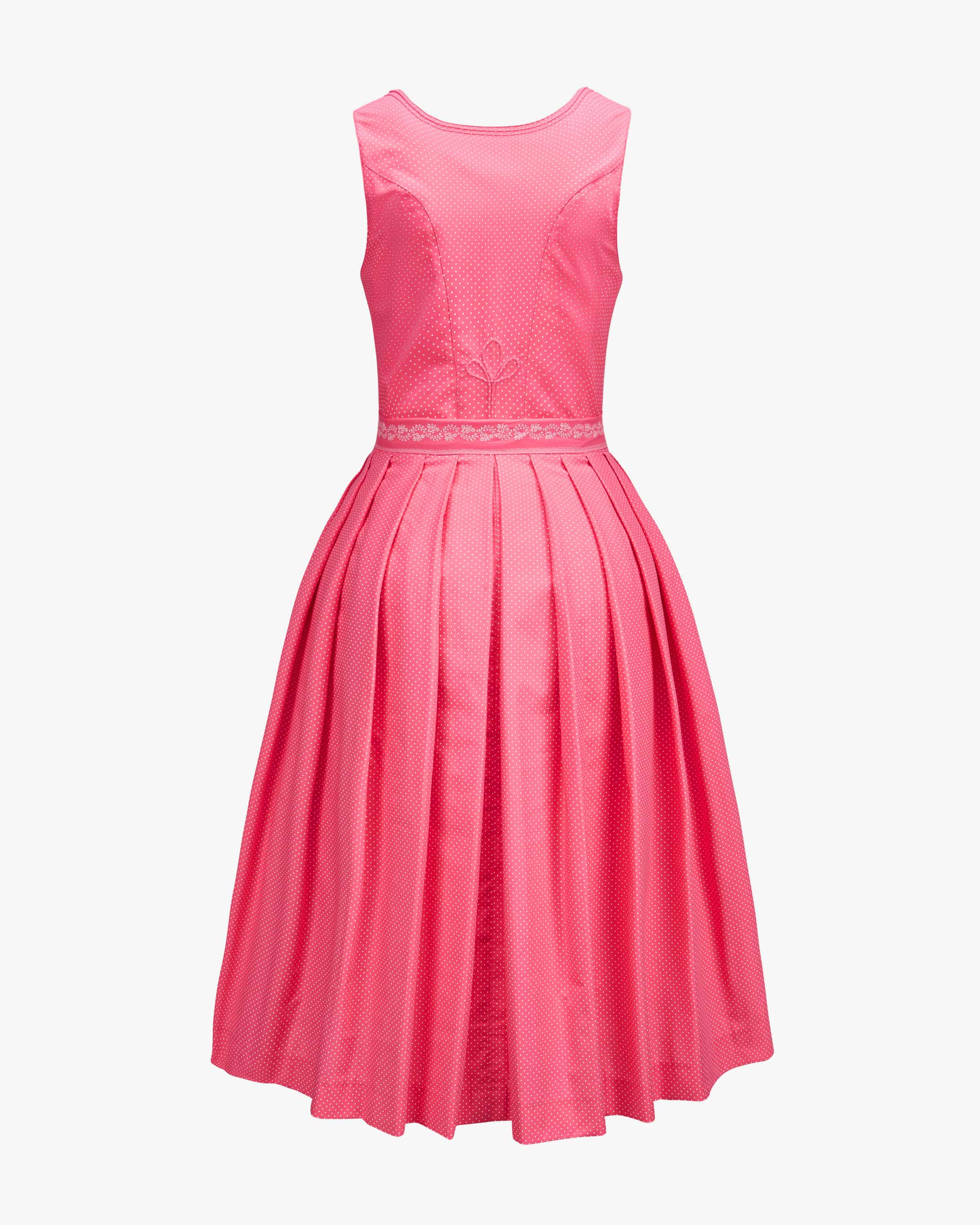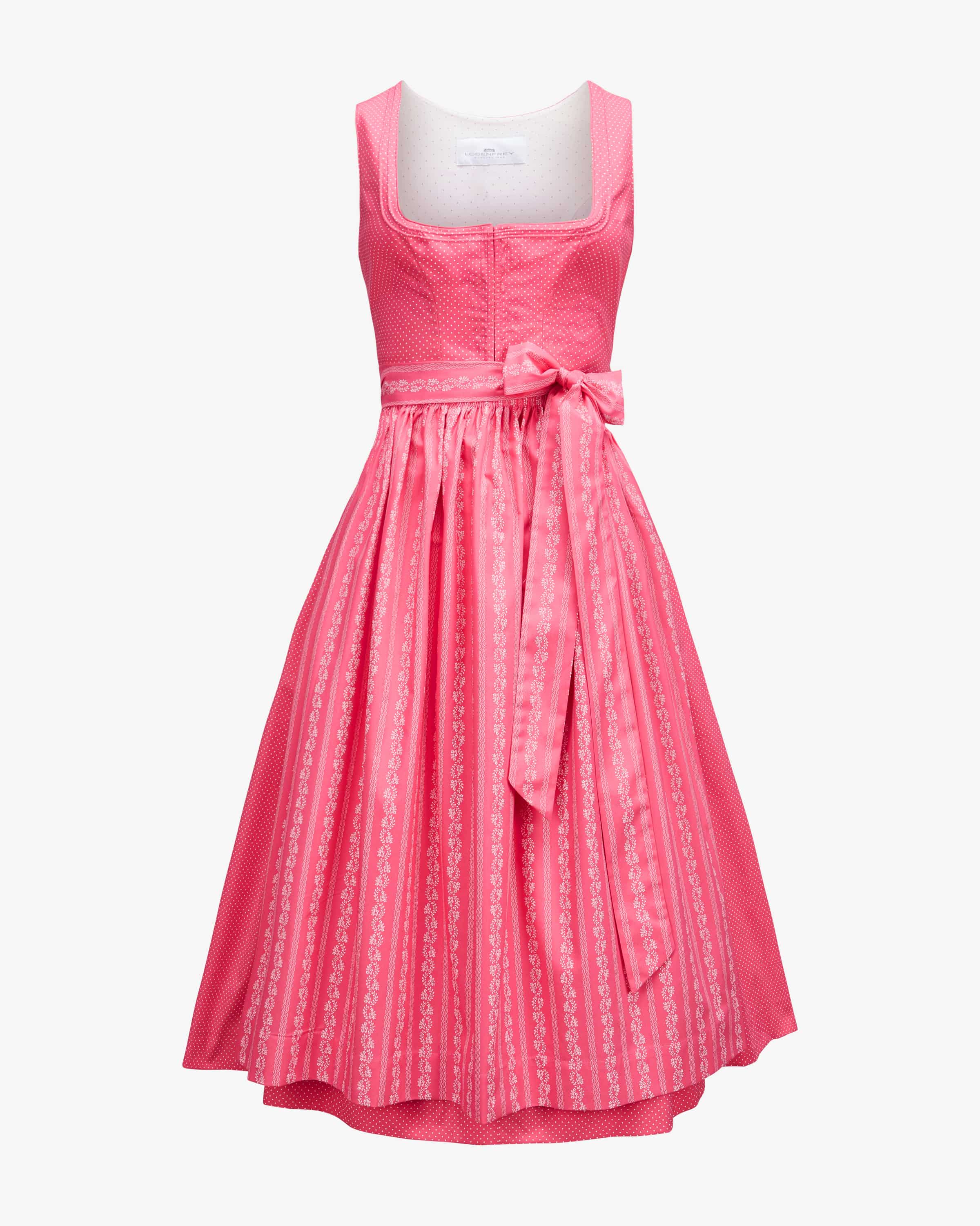 Wiesndirndl lang mit Schürze für Damen von LODENFREY in Pink und Weiß. Dank der Verwendung von leichter Baumwoll-Qualität und der Kombination von feinem Punkte- Muster und floralem Print wird ein traditioneller Favorit mit femininem Charme kreiert. Klassische Trachten-Details runden das stilvolle Gesamtbild harmonisch ab.