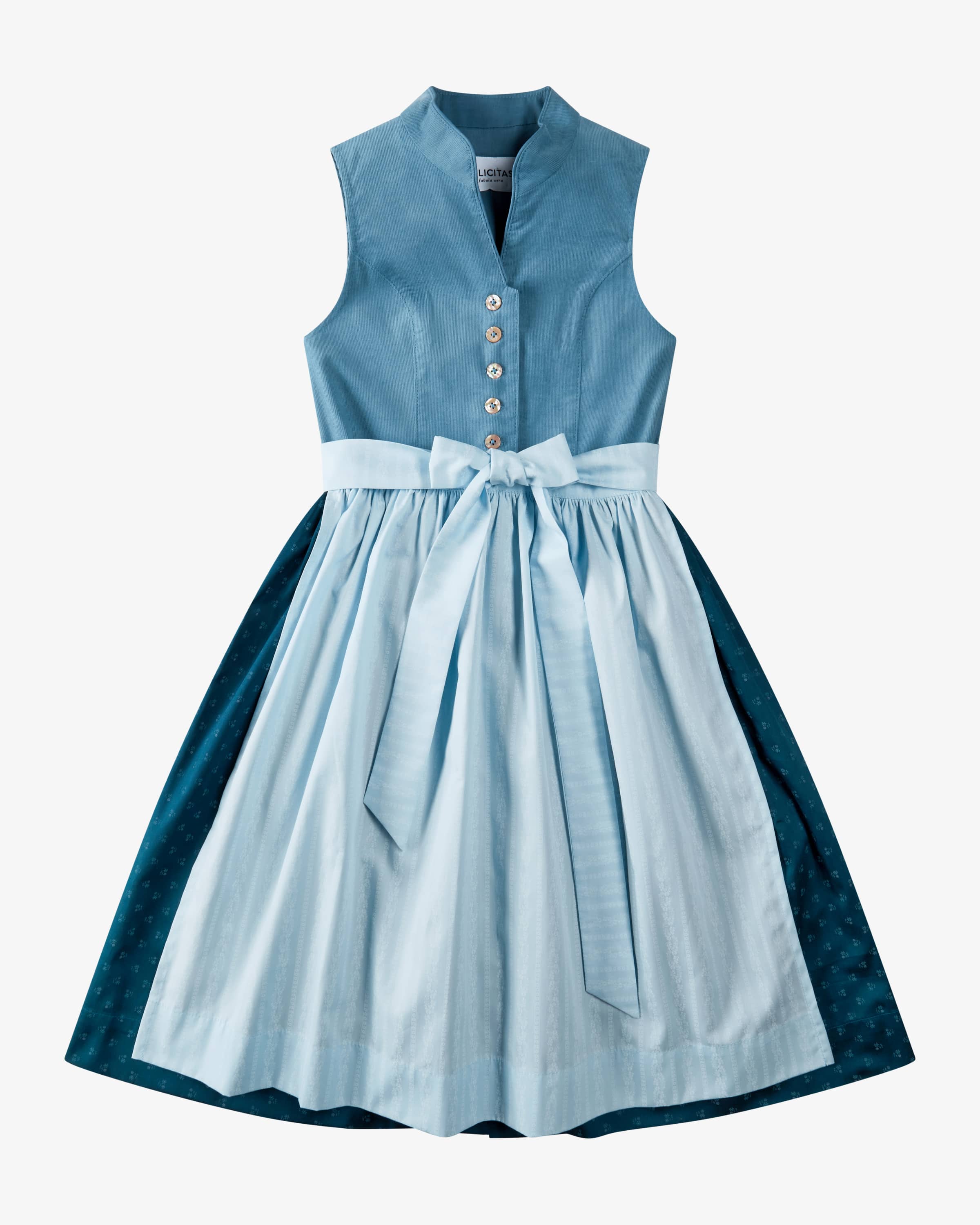Zenzi Dirndl mit Schürze für Mädchen von Feli und Hans in Hellblau, Petrol und Eisblau. Das hochgeschlossene Modell begeistert dank der Kombination aus feiner Cord-Aufmachung und filigran gemusterter Baumwoll-Schürze mit verspieltem und zugleich traditionellem Charme, während Knöpfe in Perlmutt-Optik besondere Akzente setzen.