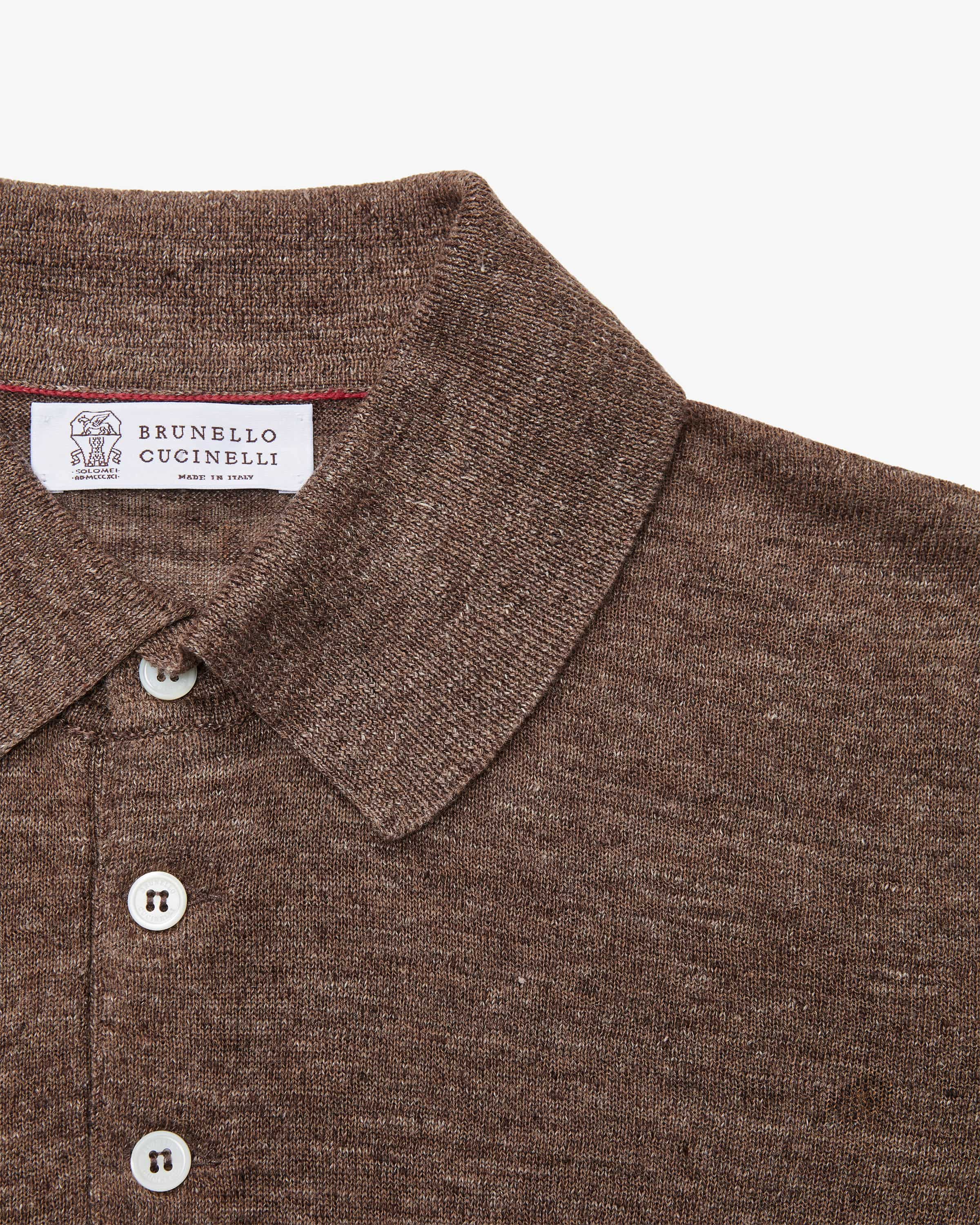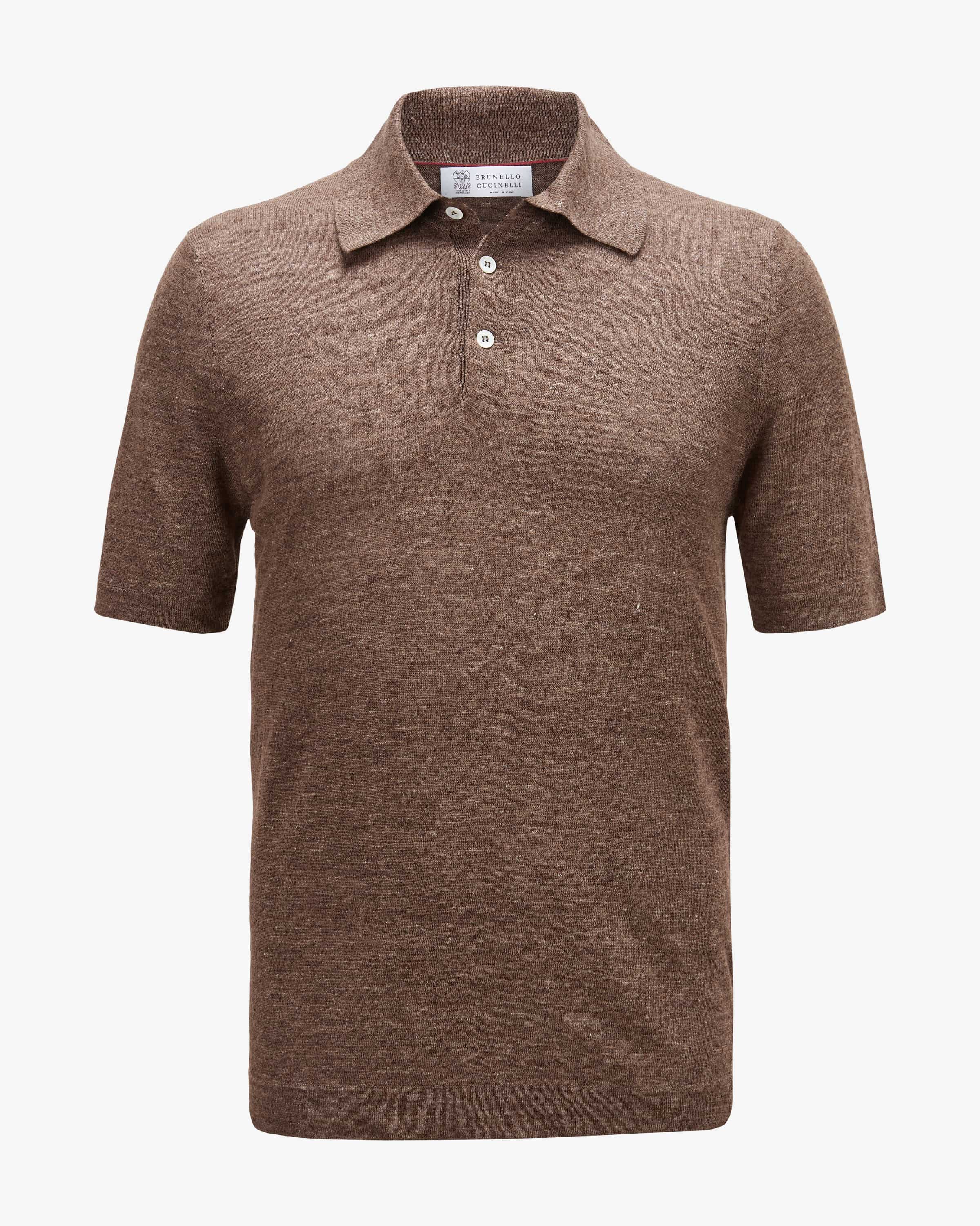 Polo shirt for men from Brunello Cucinelli in brown. Italian luxury label based in Solomeo, known for the finest cashmere workmanship. The mottled model impresses thanks to its high-quality linen-cotton quality with pleasant comfort, while the classic details skillfully underline the clean overall look. underline the clean overall look.
