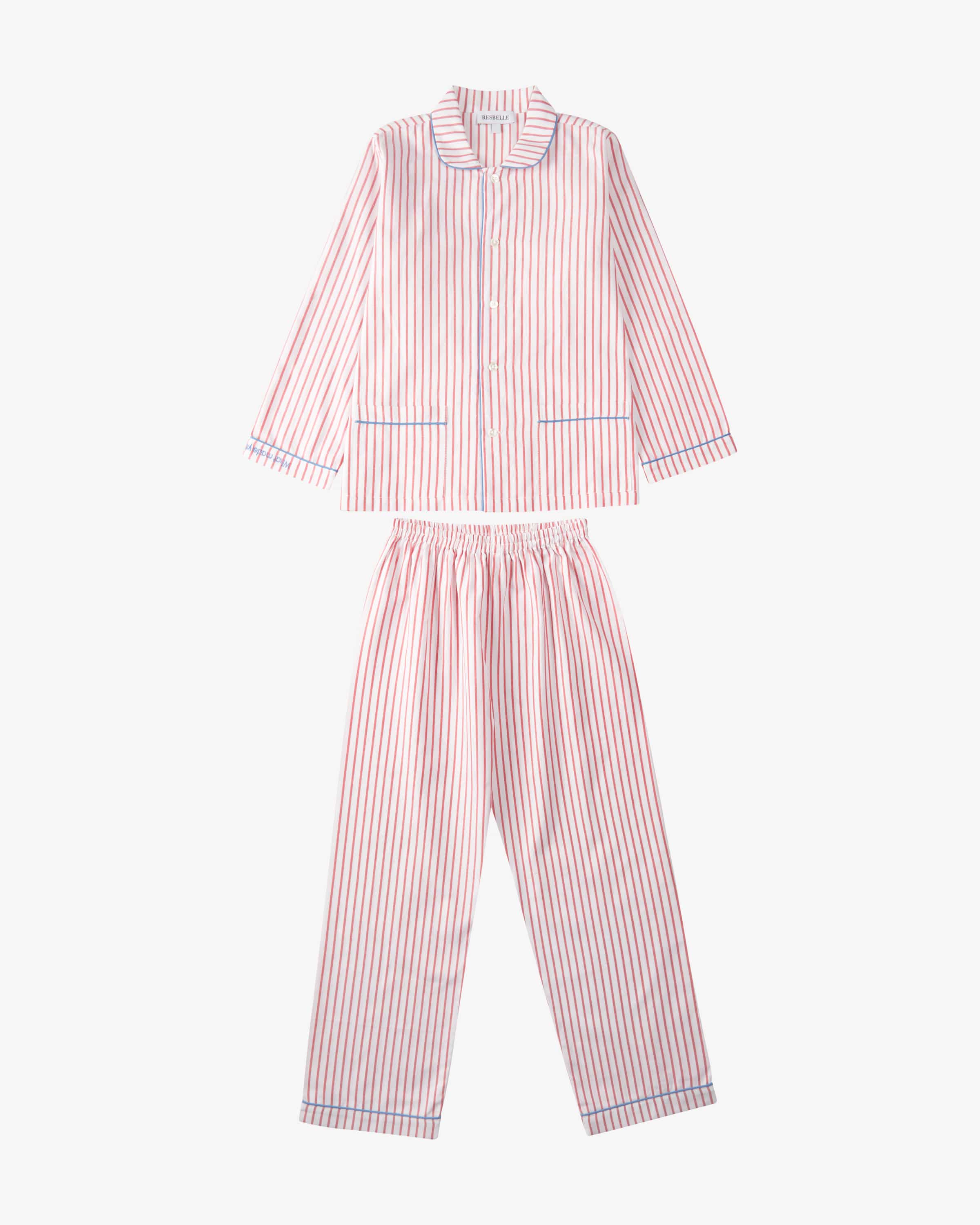 Pajamas for children by RESBELLE in red, white and blue. The pyjama set impresses thanks to the high-quality oxford fabric with pleasant wearing comfort, while the striped pattern together with contrasting piping and the original embroidery on the sleeves create a cute overall look.