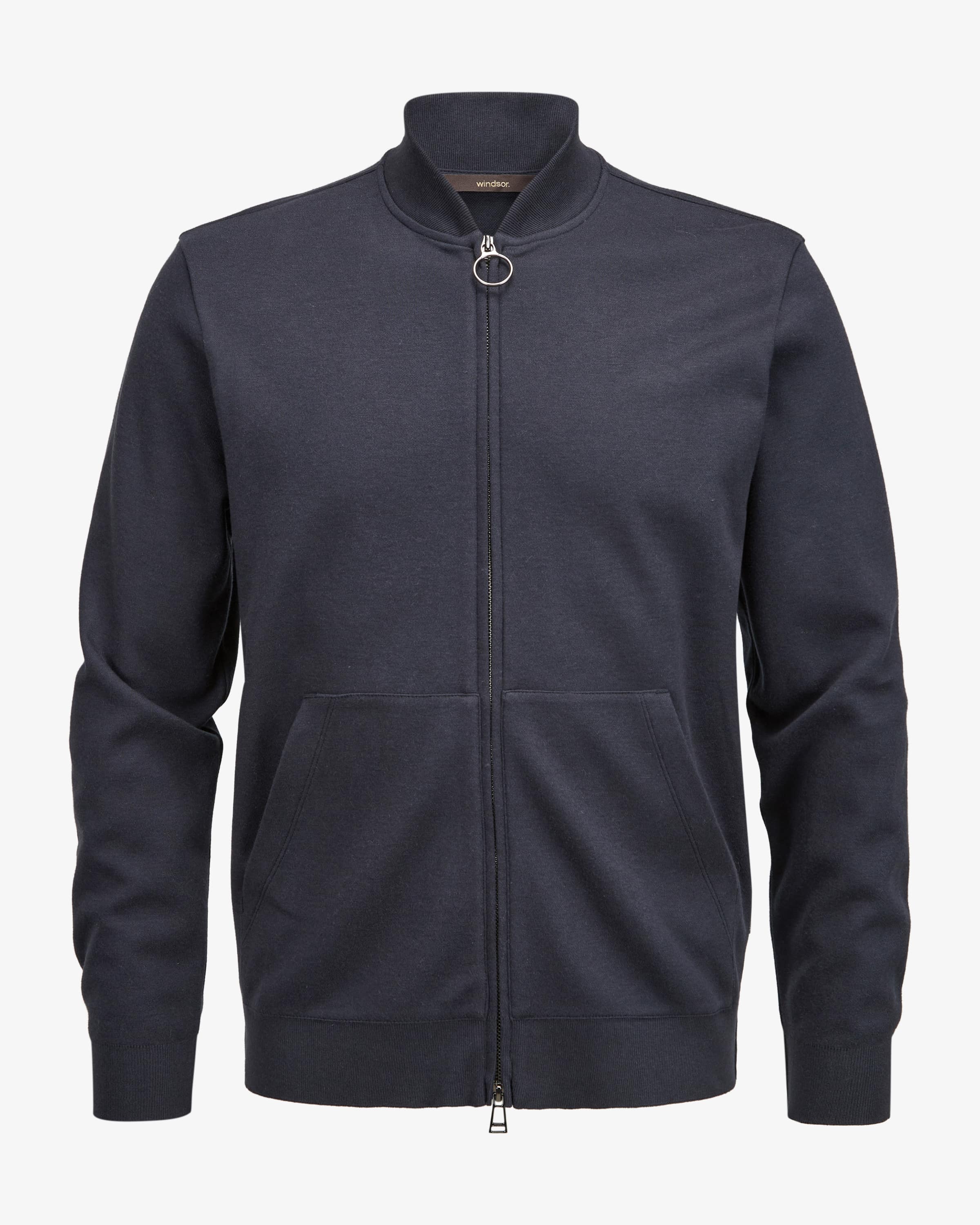 Florino sweat jacket for men from Windsor in navy. The Swiss label stands for elegant elegant business fashion and urban classics with a discreet claim to luxury. This This model also impresses thanks to its casual design with a college collar and rib-knit details, while the lightweight cotton-cashmere blend ensures a comfortable fit. wearing comfort.