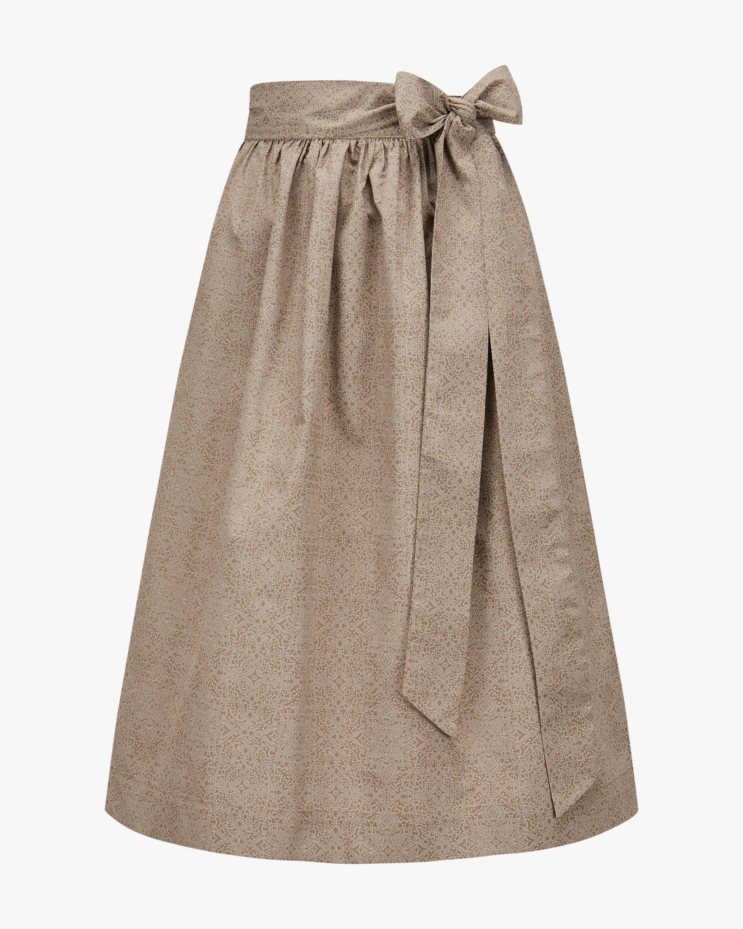 Apron for women from LODENFREY in taupe. The model presents itself with light cotton quality and a fine ornamental pattern - a feminine companion for for versatile traditional looks.