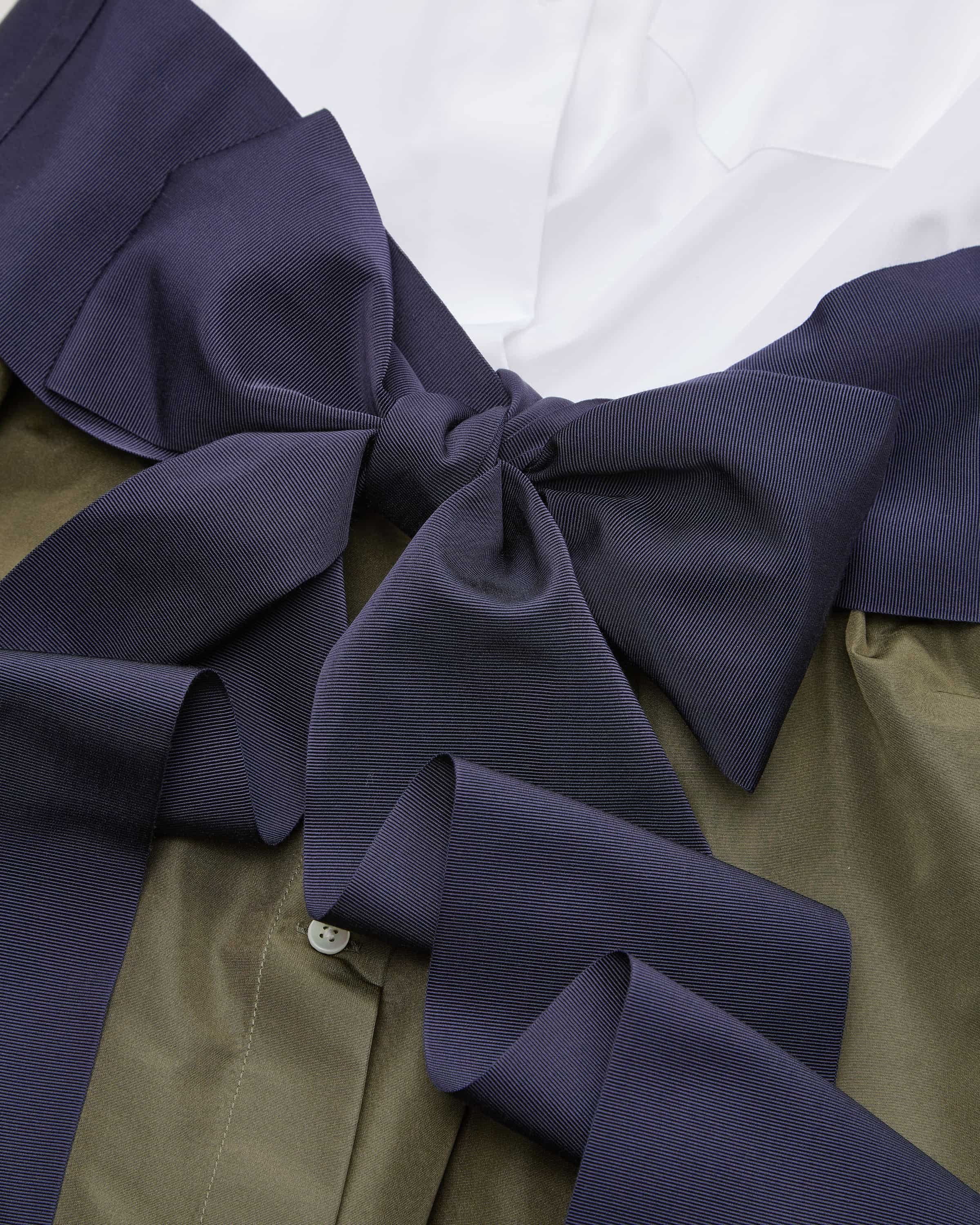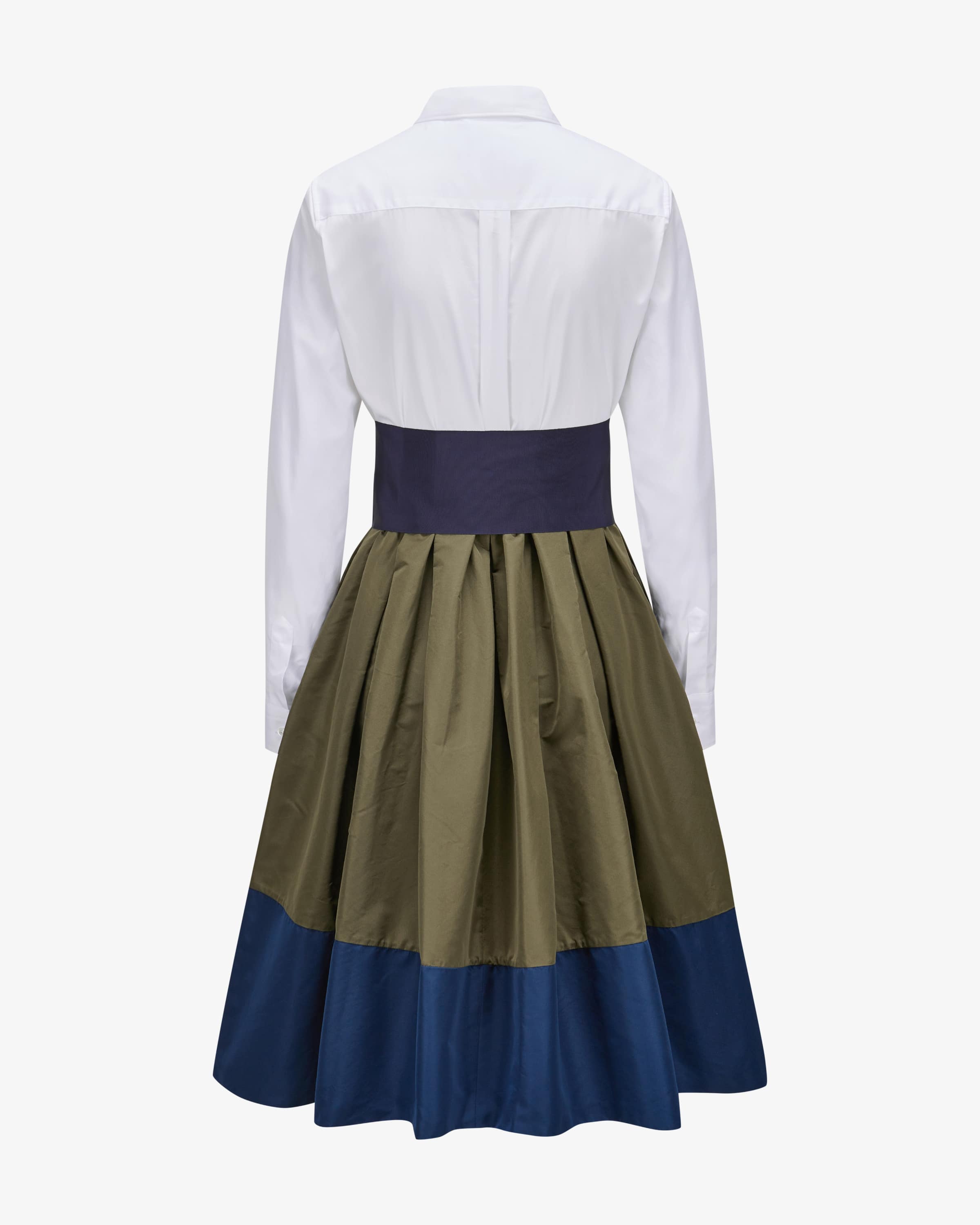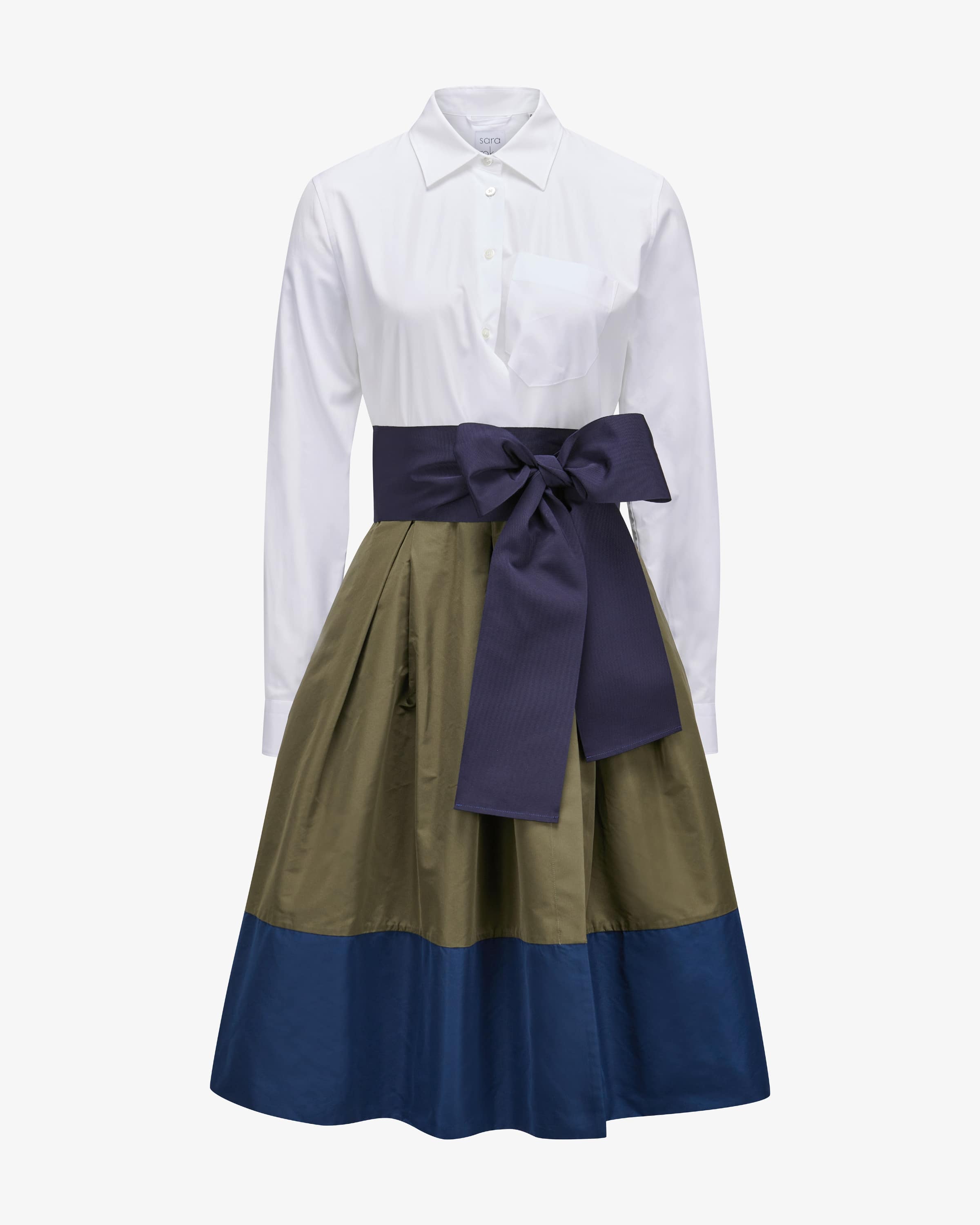 Elena dress for women from Sara Roka in olive, white and navy. Feminine designs with with that certain something. The origin of the collections can be found in the classic men's shirt, from which the typical blouse dresses are inspired. This This model also features a sophisticated mix of materials and classic shirt details. shirt details. The detachable waistband conjures up a feminine silhouette and skilfully rounds off the stylish look.