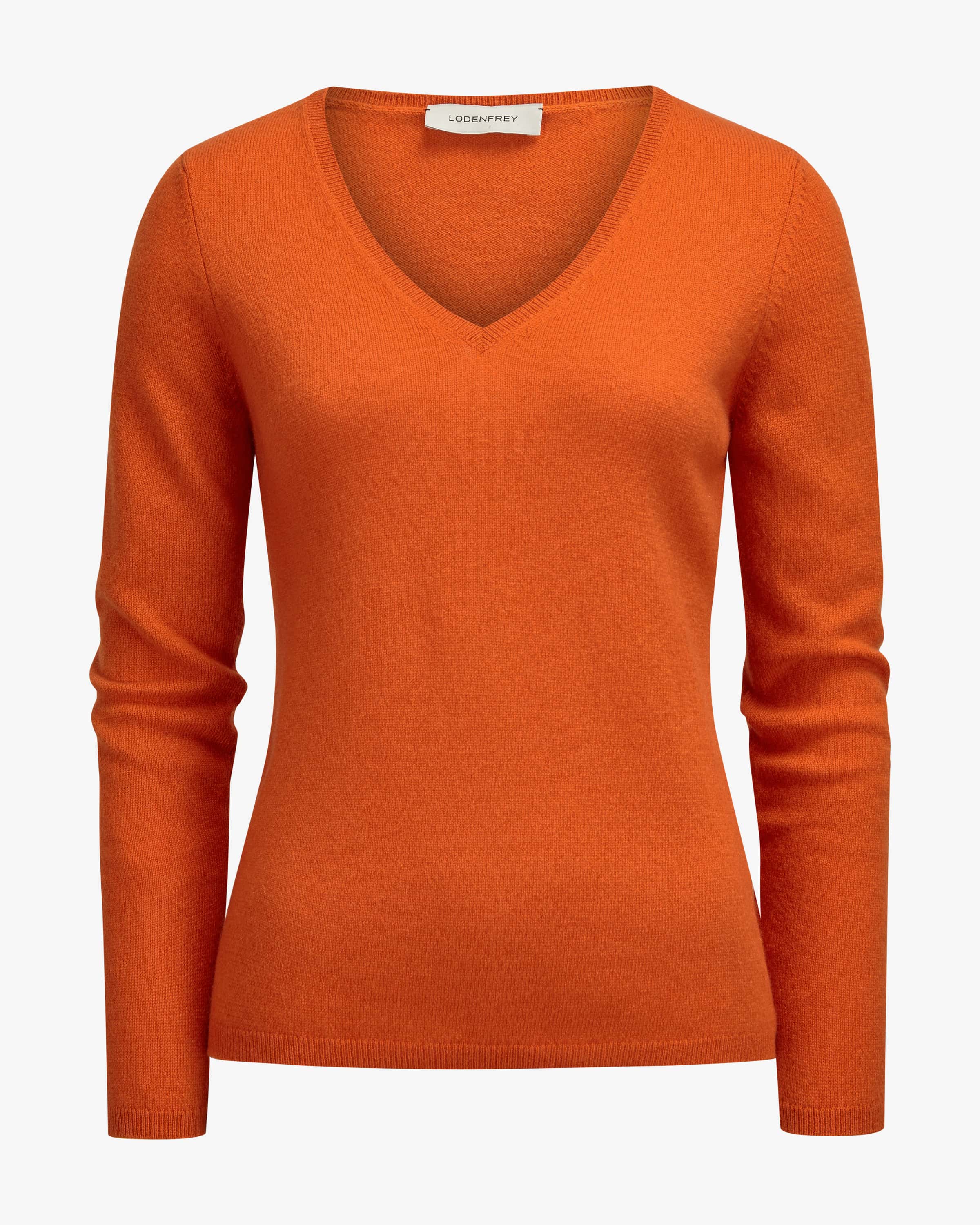 Cashmere sweater for women from LODENFREY in orange. Thanks to the high-quality cashmere quality, this model impresses with its light wearing comfort and soft feel, while the fitted silhouette creates a feminine knitwear essential. creates.