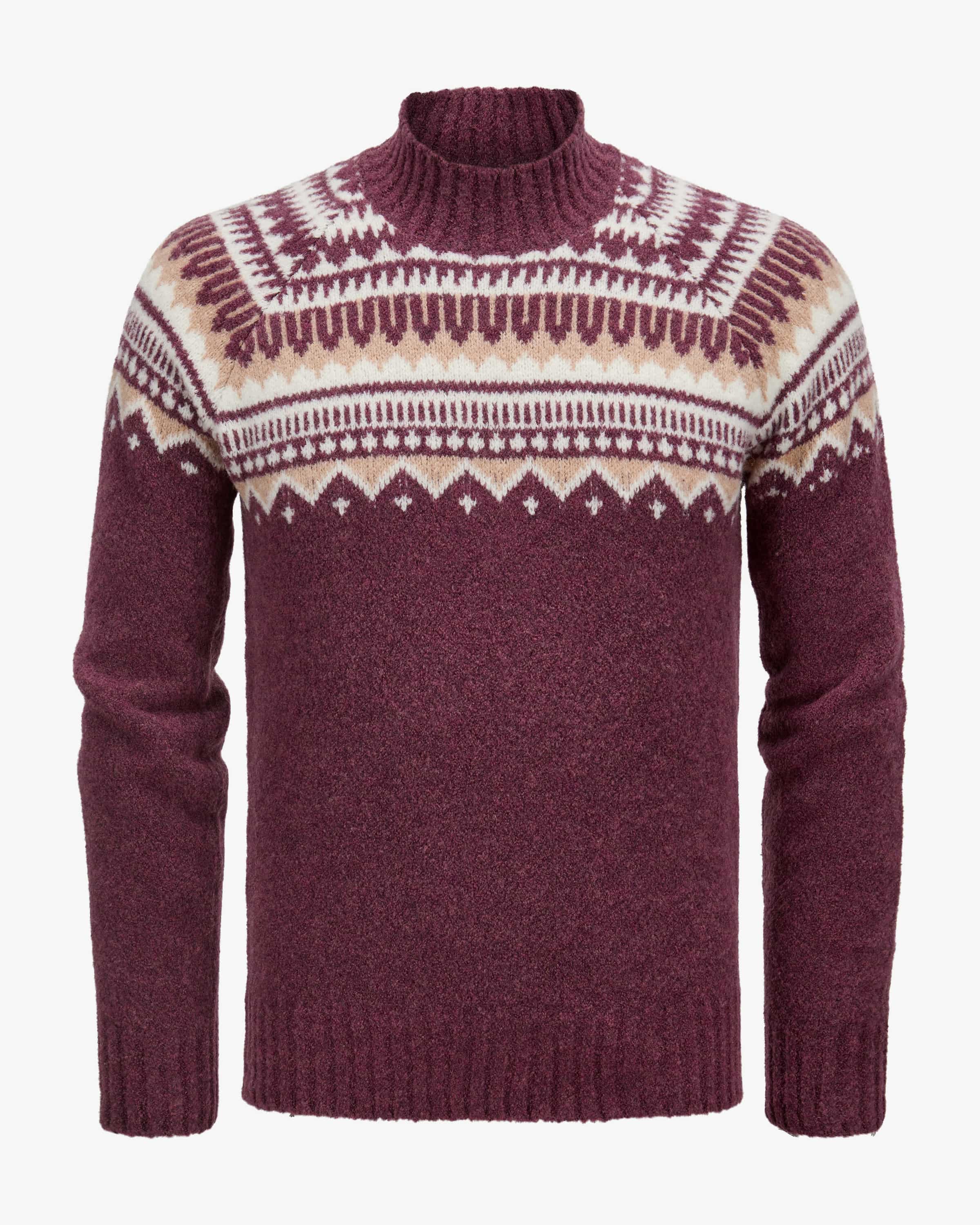 Pullover for men by Gran Sasso in plum, sand and cream. The model made from high-quality virgin wool blend becomes a modern casual favorite with alpine chic flair thanks to the characteristic design makes it a modern casual favorite with an alpine-chic flair, while the bouclé finish gives it a soft feel.