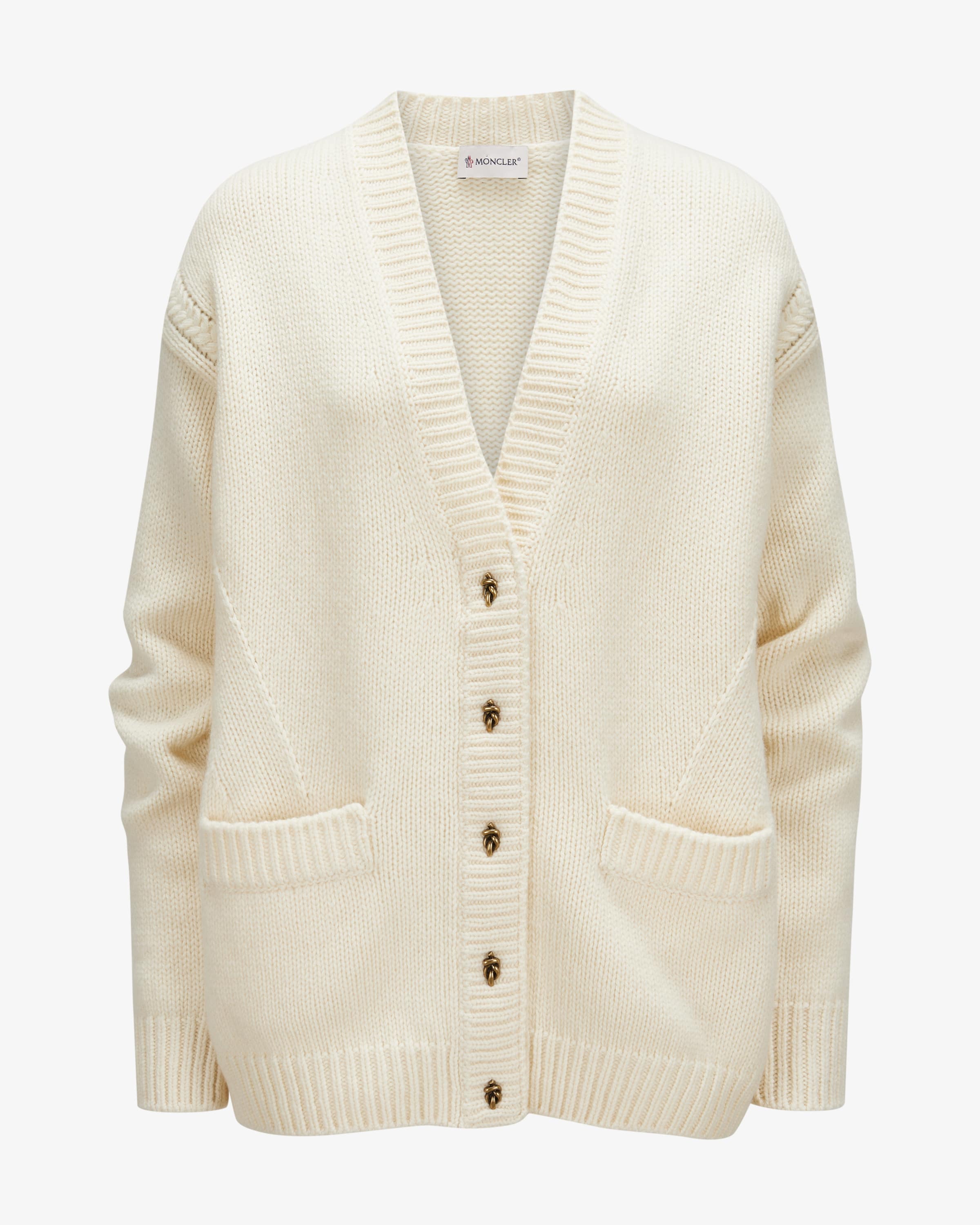 Cardigan for women from Moncler in cream. This model impresses thanks to its casual fit and high-quality wool-cashmere fabrication make it extremely comfortable to wear, while the mix of different knit structures with the gold buttons creates a creates a fashionable favorite.