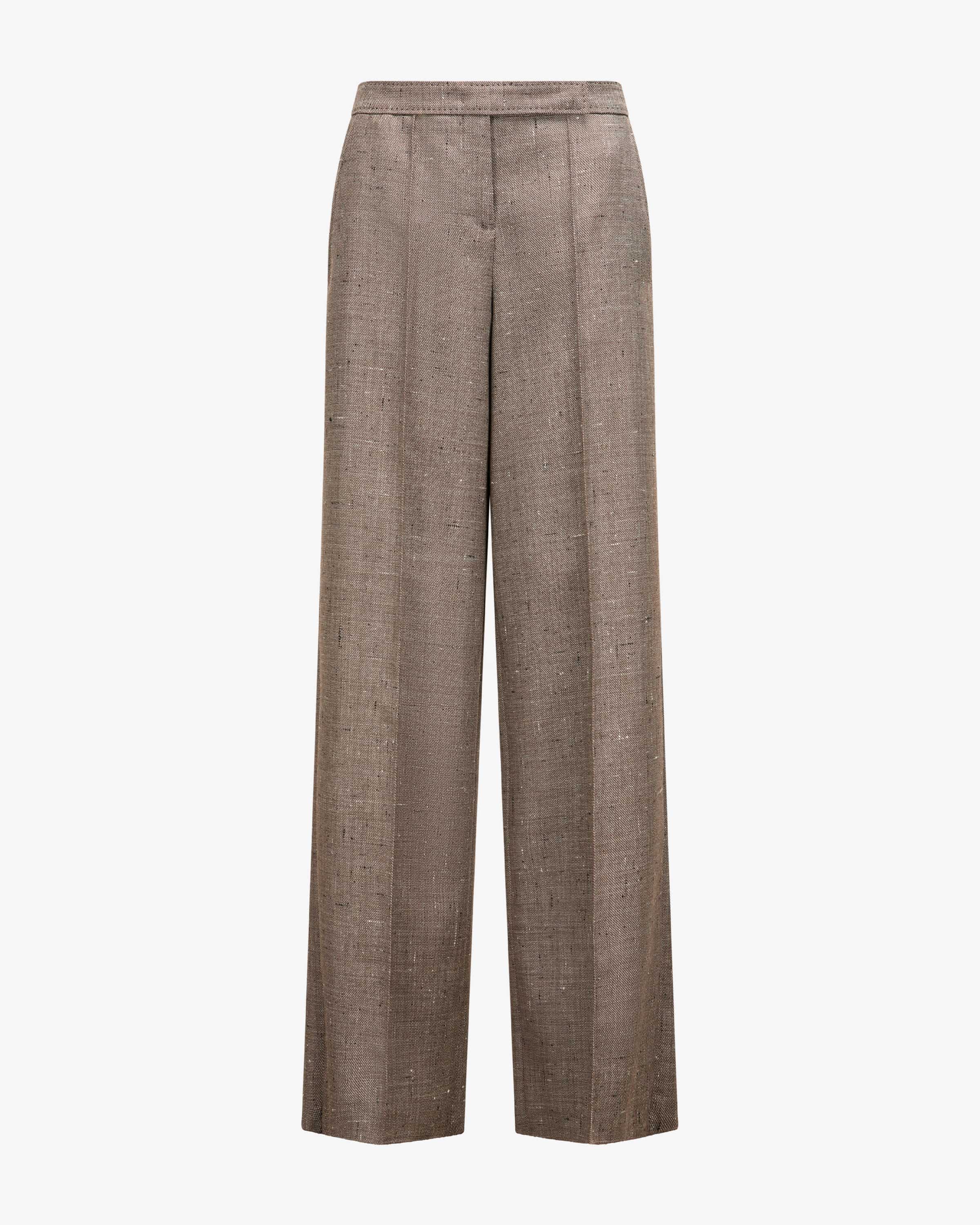 Casual Attraction trousers for women from Dorothee Schumacher in taupe, black and white. white. The model has a fashionably wide fit, while the variable leg ends and the variable leg ends and the textured wool add elegant accents.