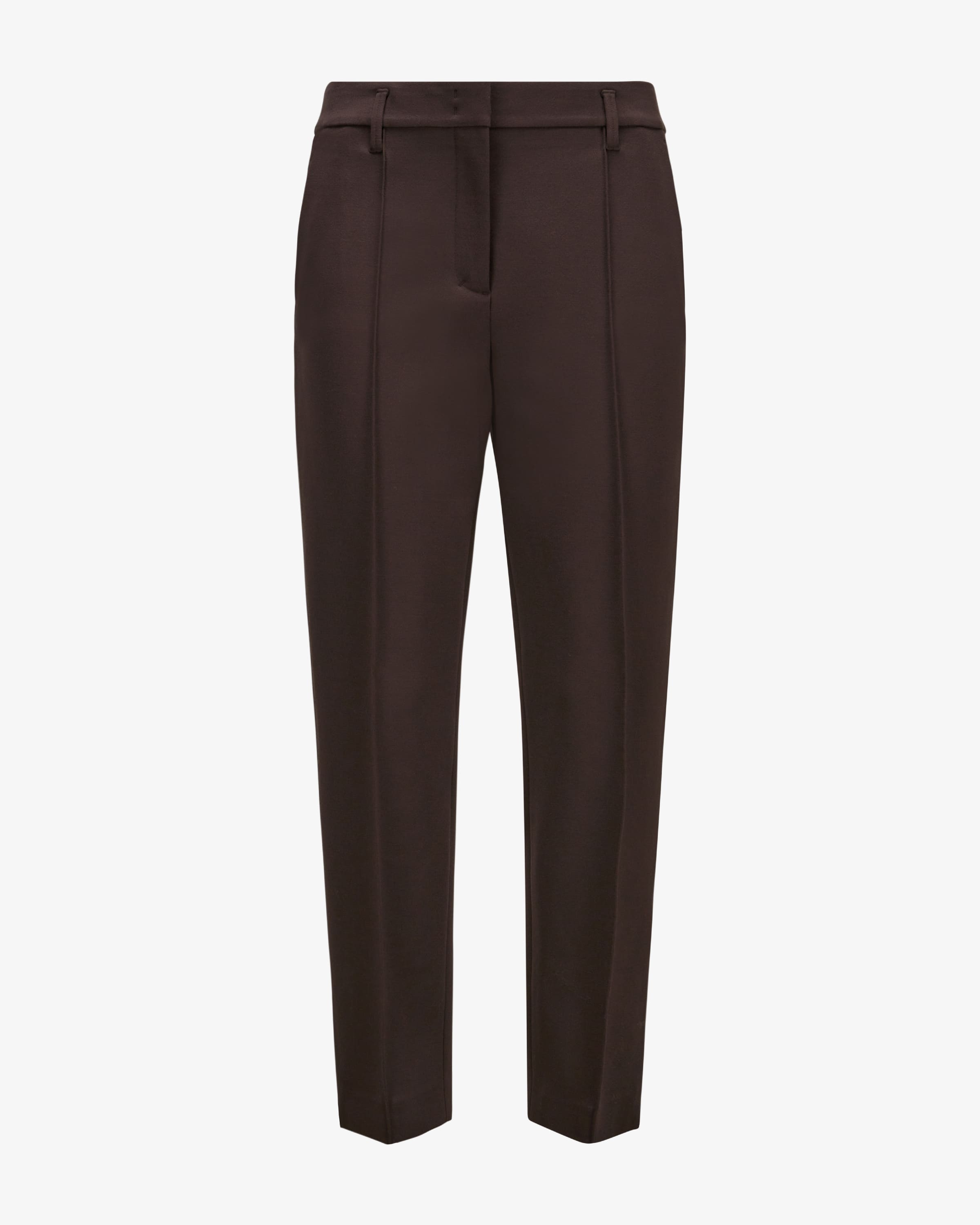 Emotional Essence 7/8 jersey trousers for women from Dorothee Schumacher in chocolate. A comfortable companion with style - this model comes in a cropped silhouette silhouette with a tapered leg and stitched creases, while the elasticated the stretchy Punto Milano fabric ensures a high level of comfort.