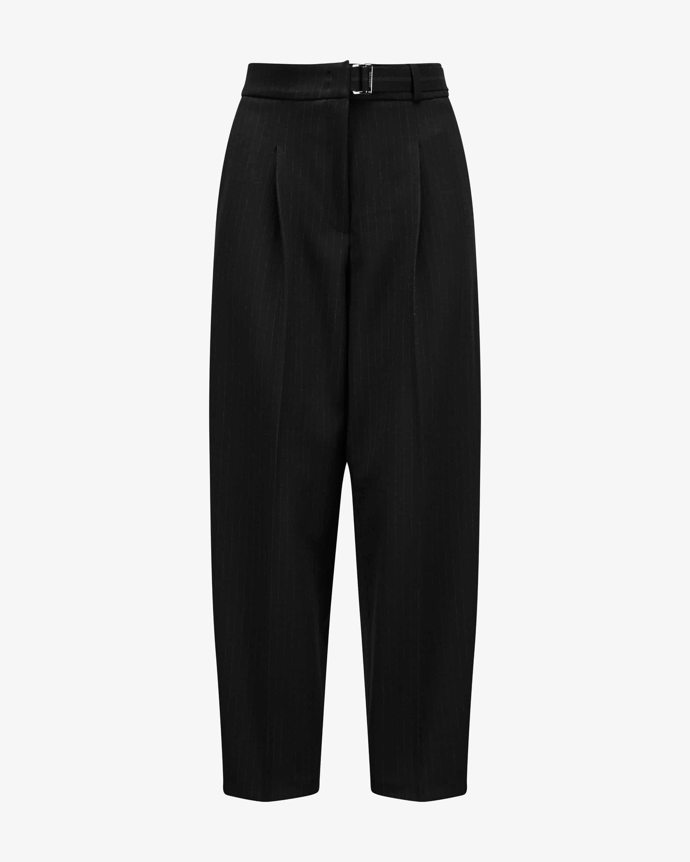 tapered fit in an O-shape and the fine pinstripe pattern create a