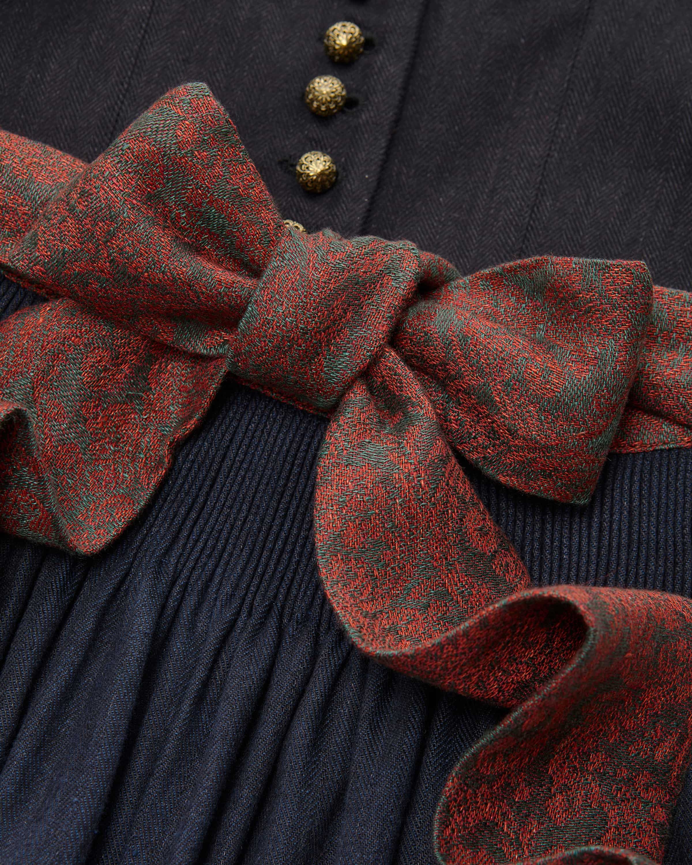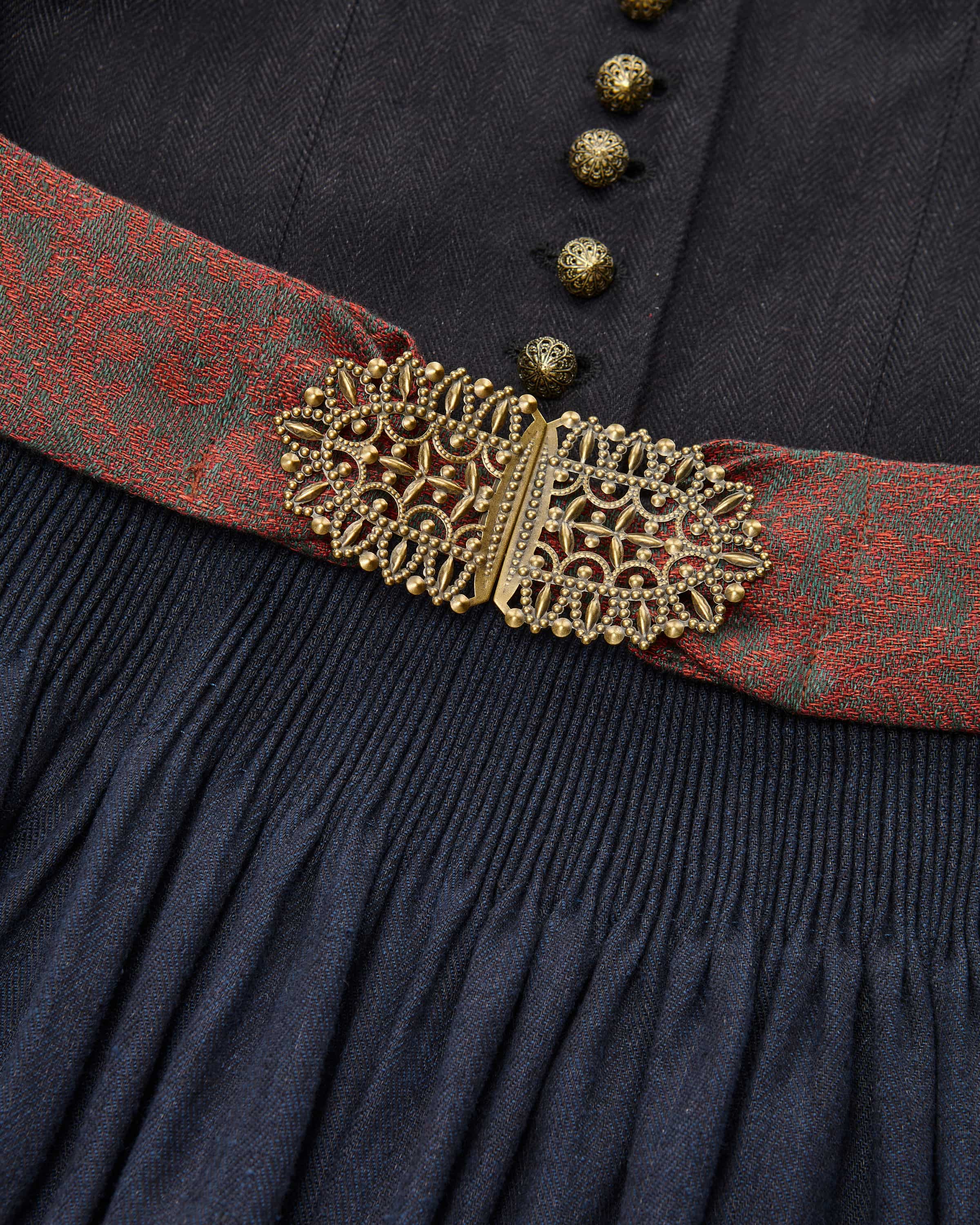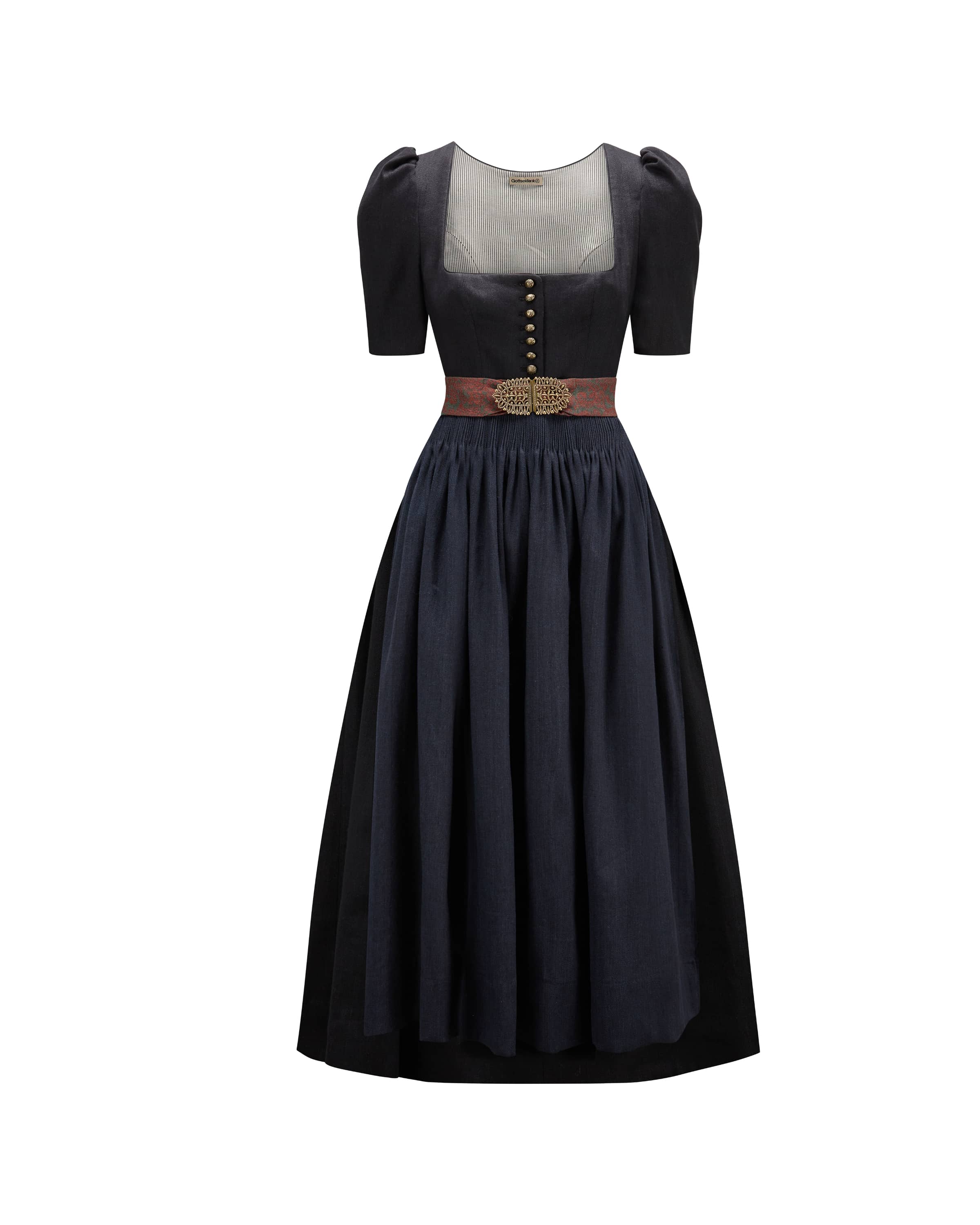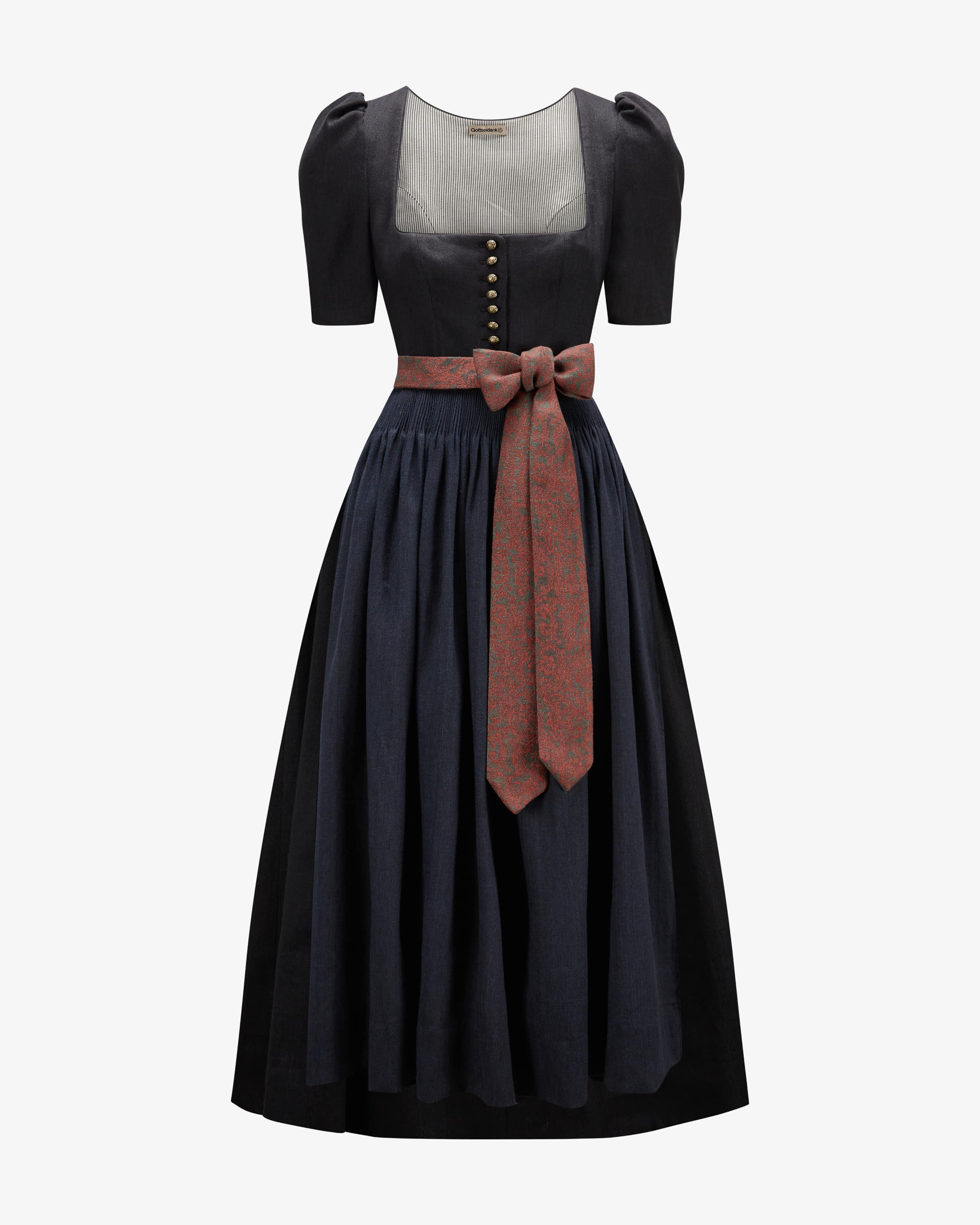 Hanni dirndl long with apron for women from Gottseidank in carbon blue, midnight blue and red. Traditional costume with a modern twist - thanks to the high-quality linen mix, this traditional look and a romantic touch thanks to the feminine puffed sleeves. feminine puffed sleeves. At the same time, the pinned apron with label-typical, interchangeable apron strings skilfully round off the look.
