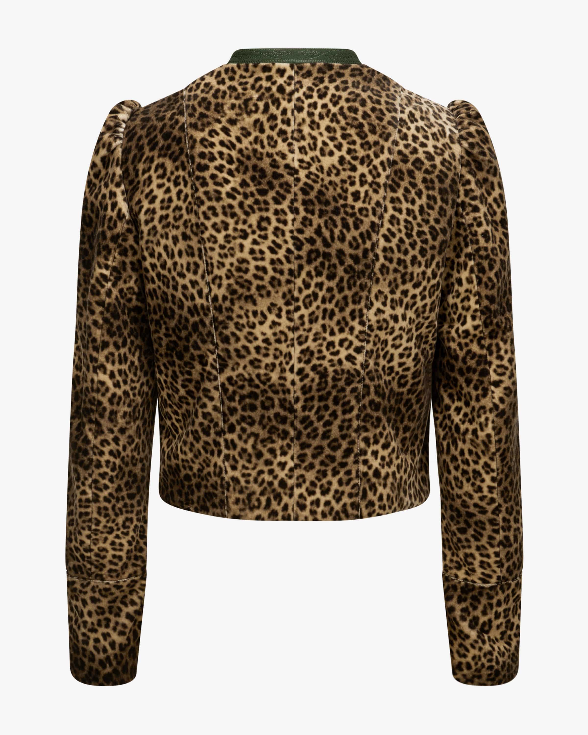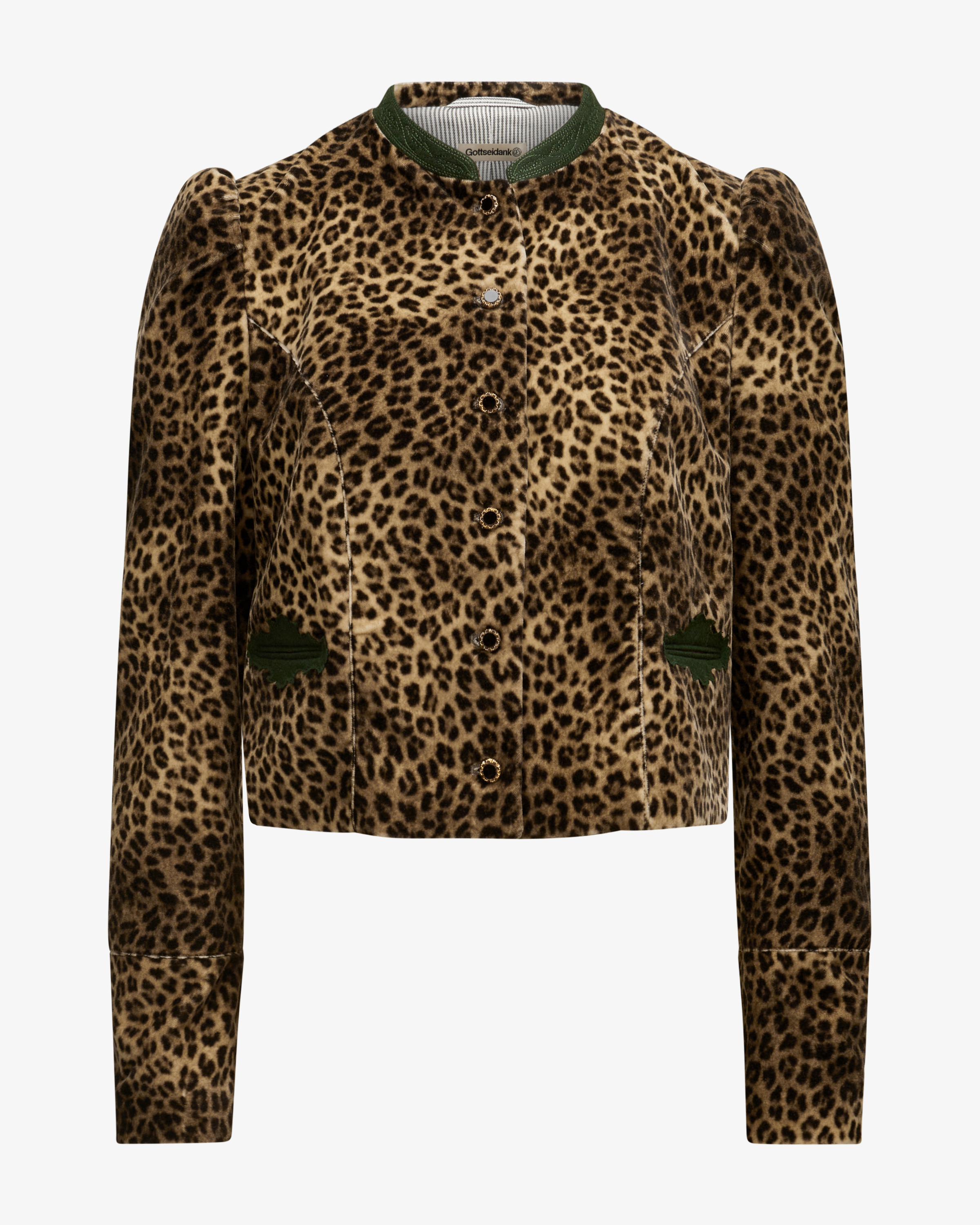 Flora traditional blazer for women from Gottseidank in black, beige and dark green. A Munich-based traditional costume brand that presents classic dirndls and jackets with a clear aesthetics and high-quality fabrics. This model stands out thanks to the leopard all-over design, this model is a traditional favorite with a feminine while the classic details and contrasting elements make it a stylish create a stylish favorite for traditional appearances.