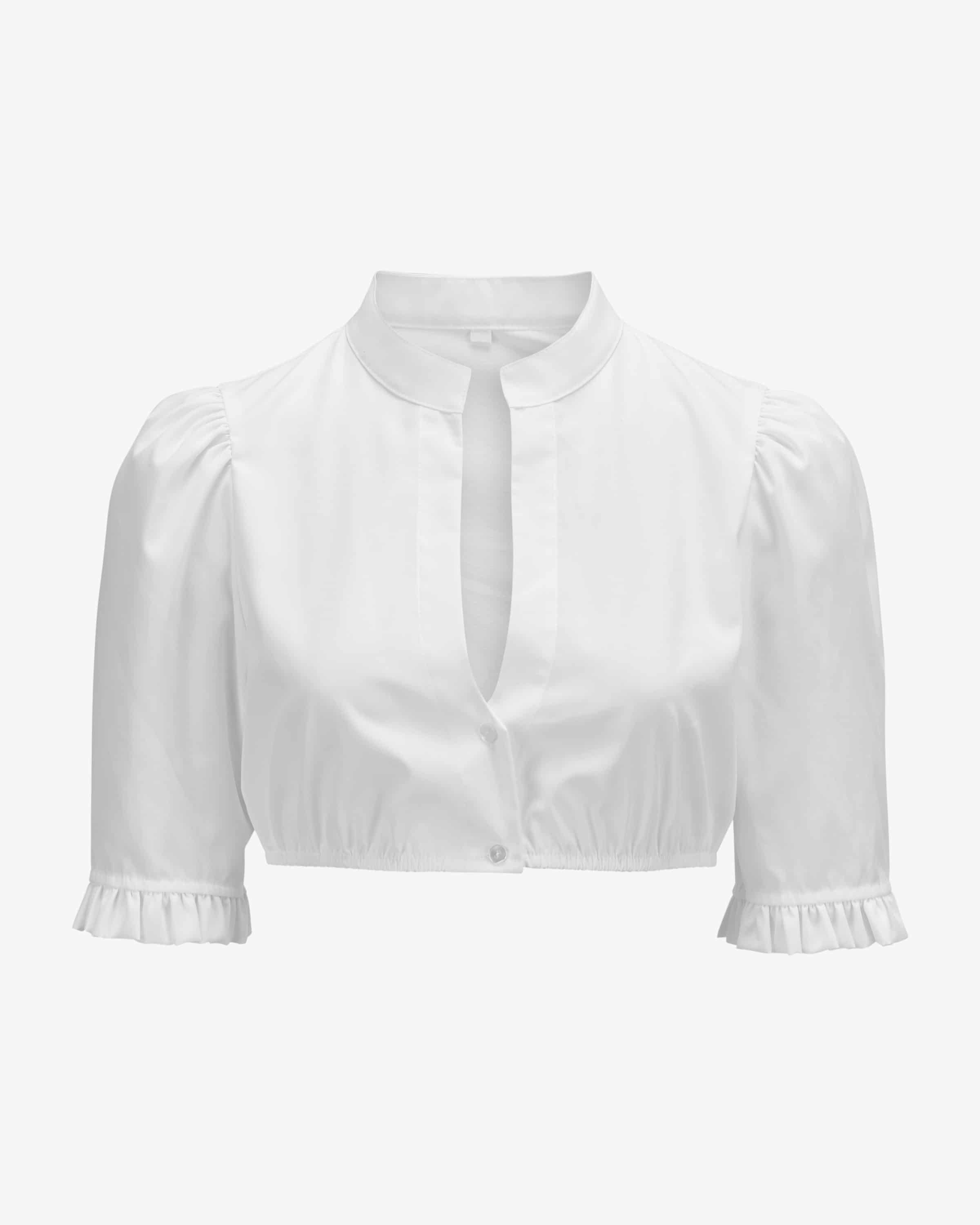 Livia dirndl blouse for women from Giacomelli Trachten in white. The model scores thanks to the feminine puff sleeves in a stylish design, while the discreet stand-up collar stand-up collar in combination with the deep slit neckline stylishly accentuate the traditional stylish overall look.