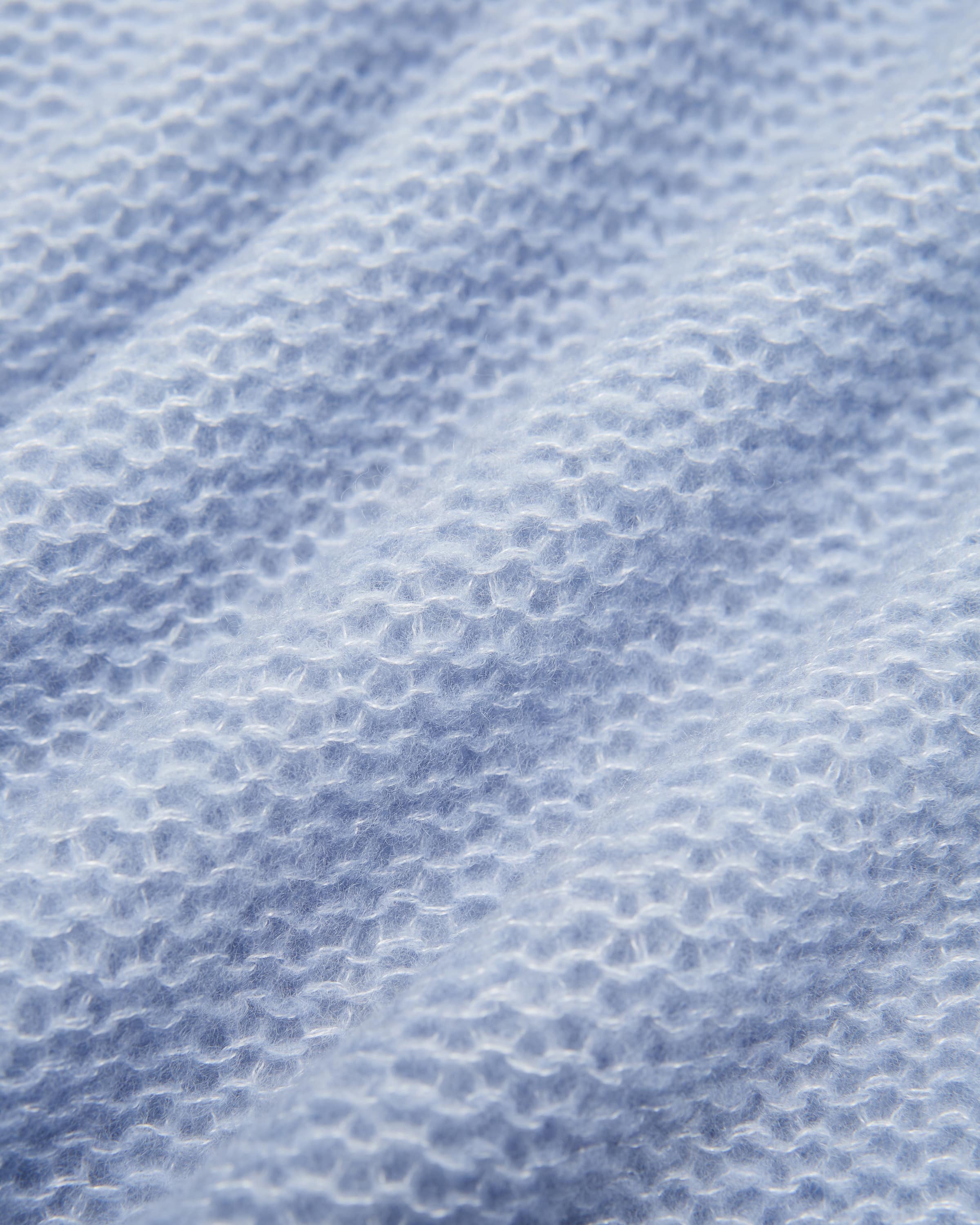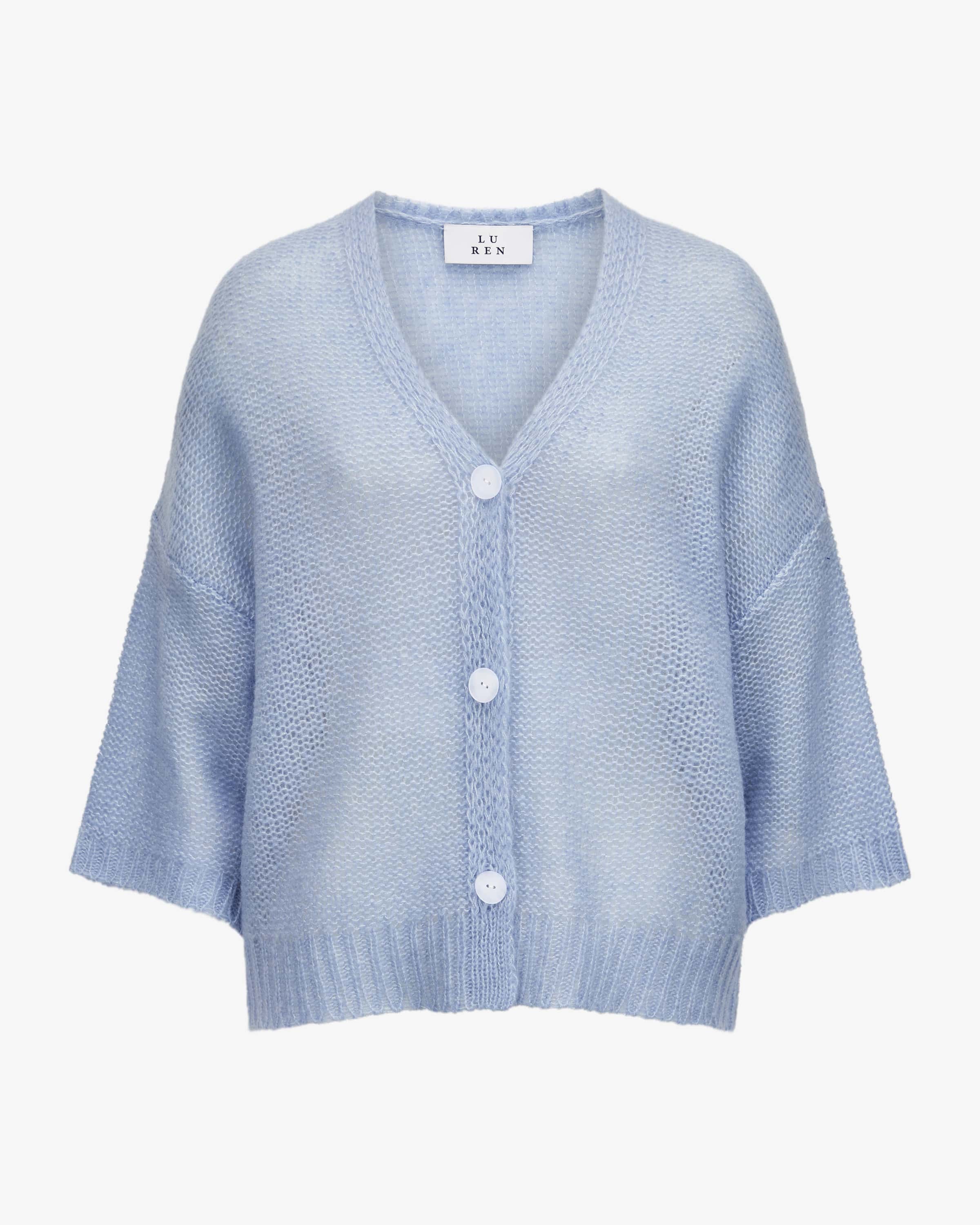 Alegra cardigan for women from Lu Ren in Sky Blue. The German label stands for for high-quality, minimalist fashion with a focus on fine materials and clean silhouettes. silhouettes. Thanks to the use of a high-quality cashmere and silk blend in a semi-transparent in a semi-transparent chunky knit, the model impresses with its particularly soft feel and lightweight feel, while the oversized silhouette with shortened sleeves has a casual sleeves lends it a casual character. The organically shaped buttons also add also add a stylish accent.