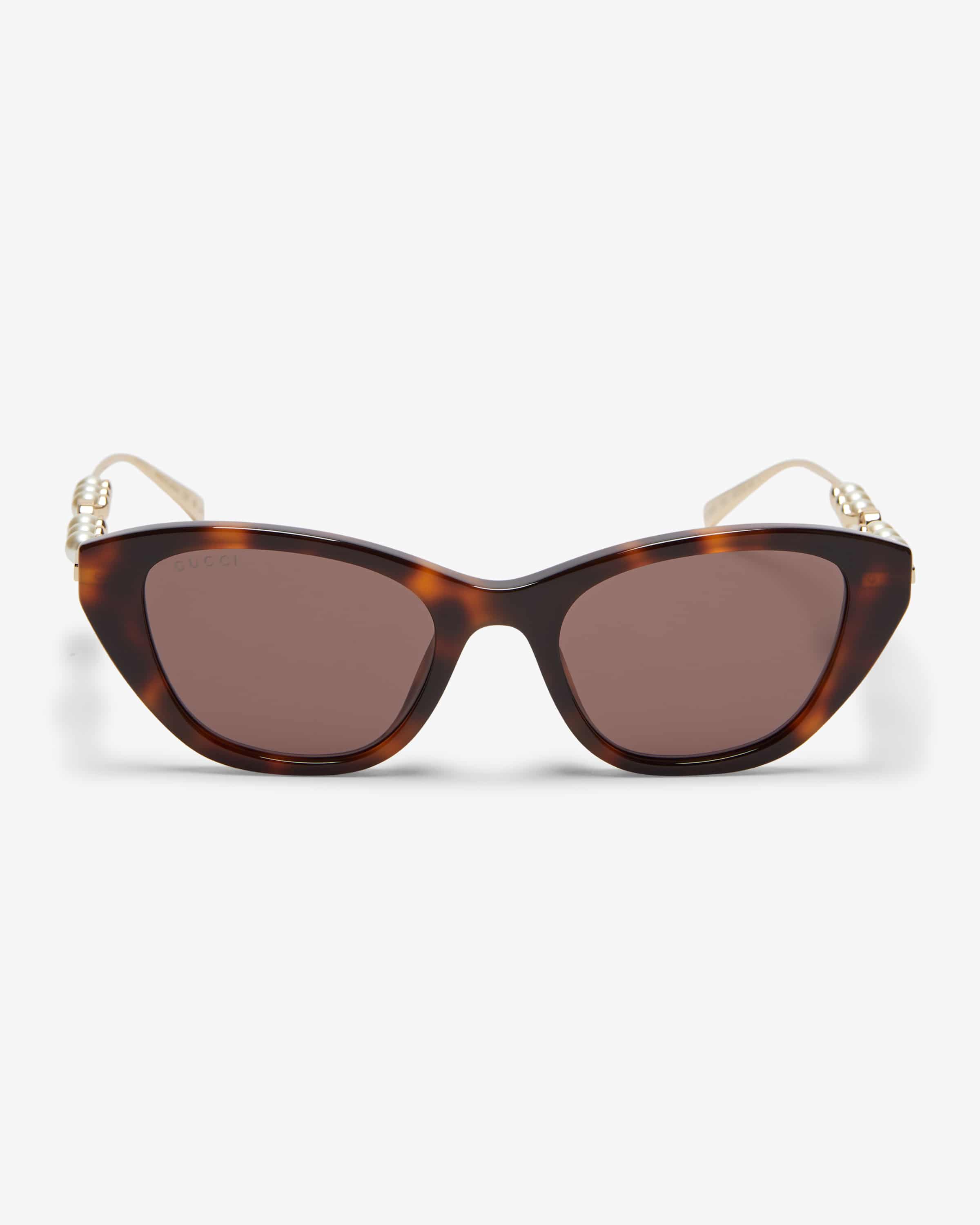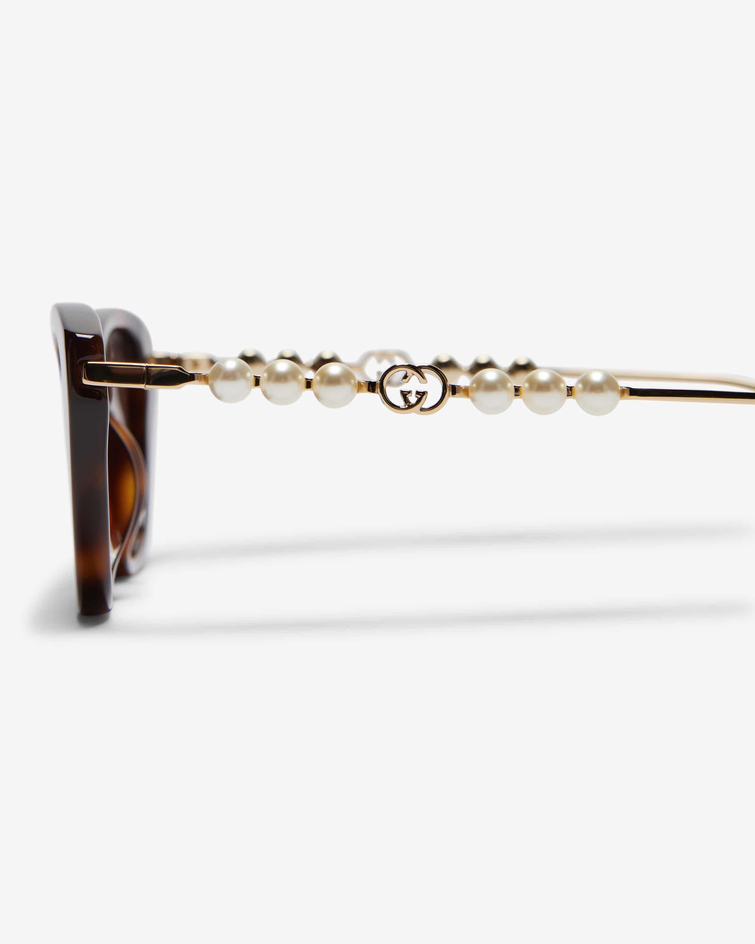 Sunglasses for women from Gucci Eyewear in brown, antique pink and gold. Thanks to classic cateye silhouette, the Havana-look model is a modern companion on sunny days. companion on sunny days. The narrow, gold-colored metal temples with iridescent decorative beads and characteristic monogram also add that that certain something.