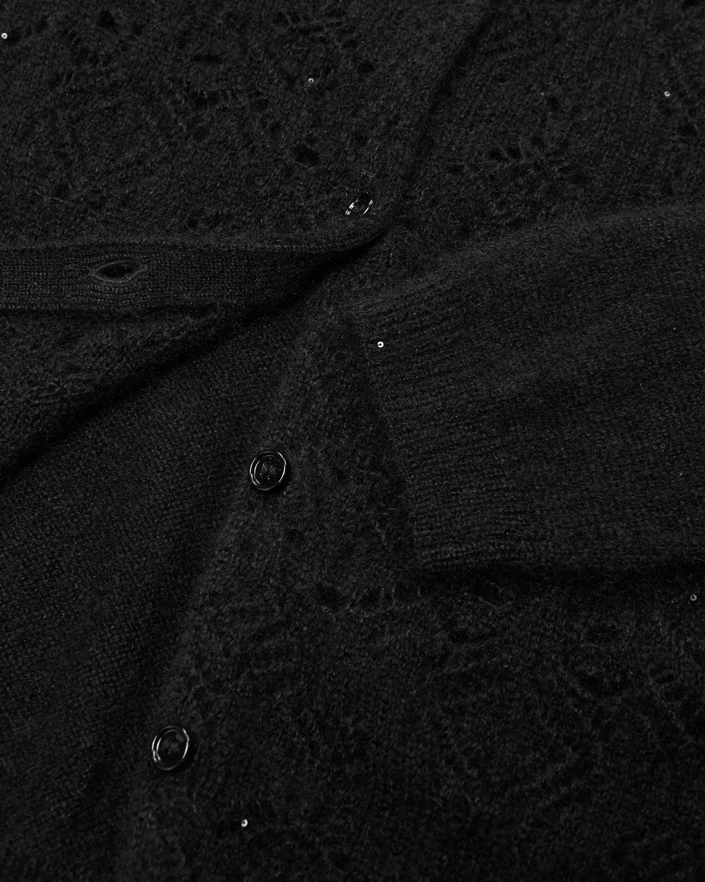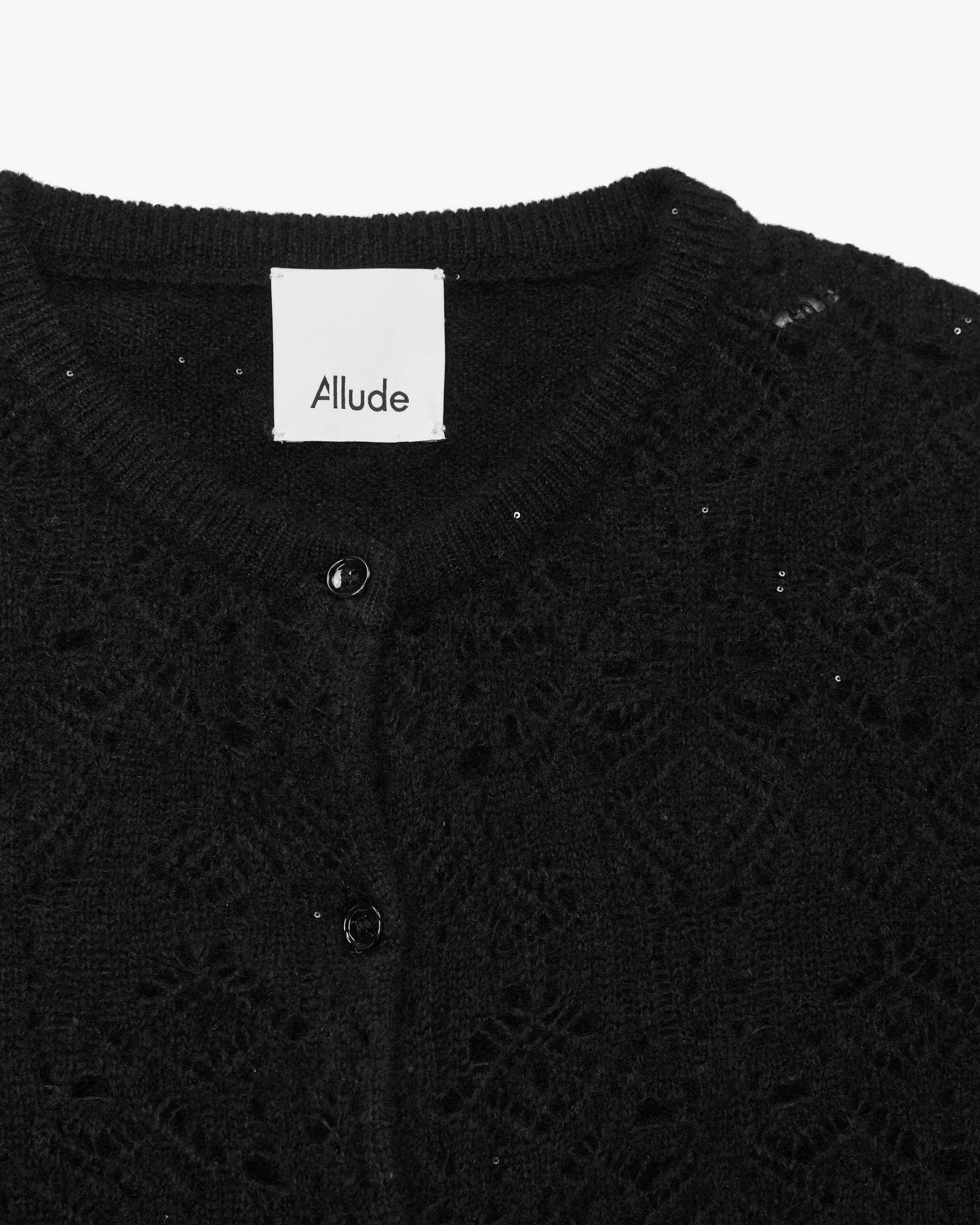 Cardigan for women from Allude in black. The Munich-based company Allude stands stands for fashion that radiates self-confidence and timeless individuality. Made from a high-quality cashmere-silk blend, this style impresses with its pleasant feel, while the fashionable perforated knit pattern and iridescent sequin sequin appliqués create a stylish overall look.