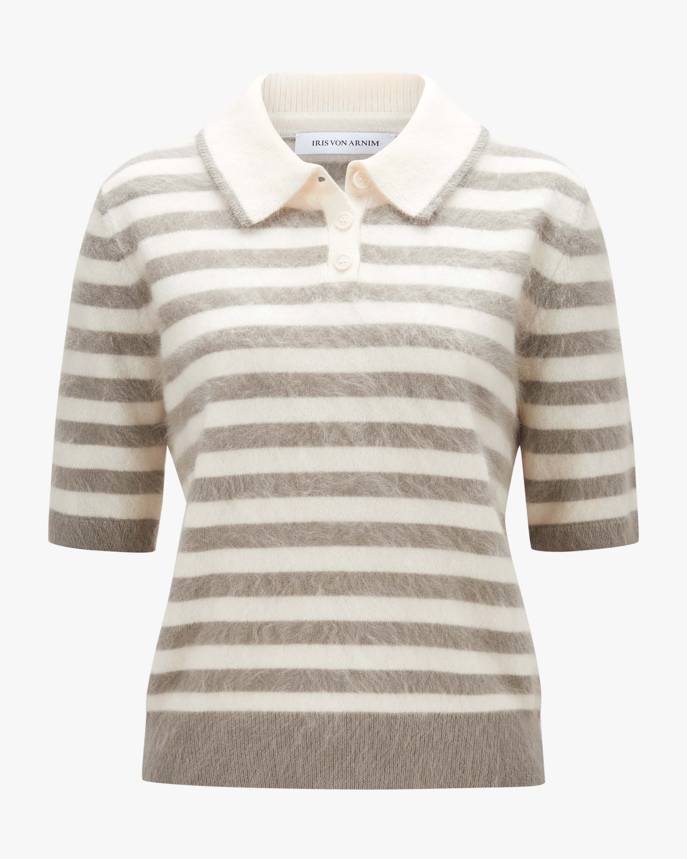 Selva cashmere knit polo shirt for women by Iris von Arnim in off-white and reed. The The Hamburg-based brand is an icon of cashmere craftsmanship - founded by Iris von Arnim and is known for the highest quality and elegant designs. This model also also impresses with its high-quality cashmere fabric in a soft brushed finish, while the sporty silhouette with polo collar and striped pattern creates a creates a fashionable knitted look.