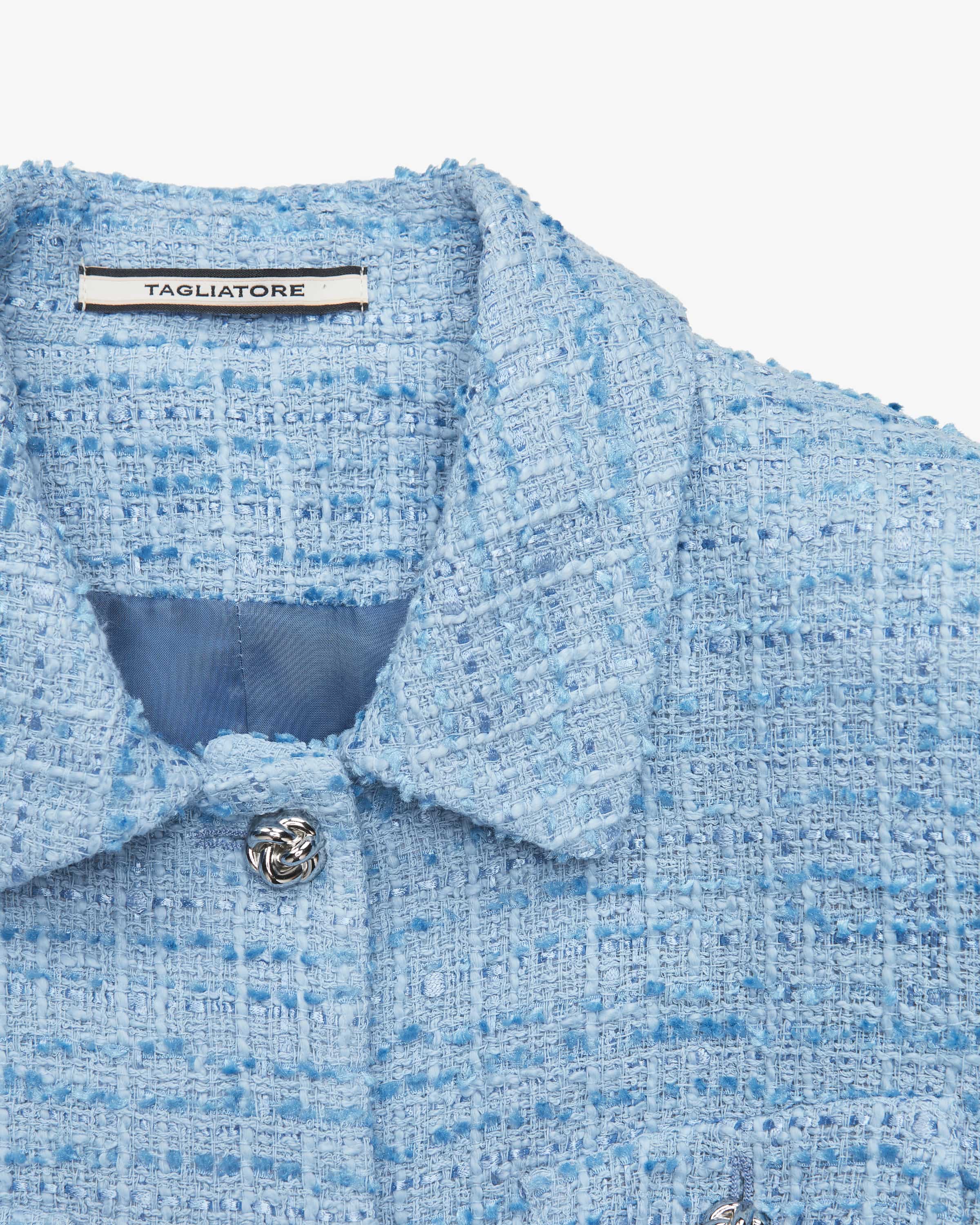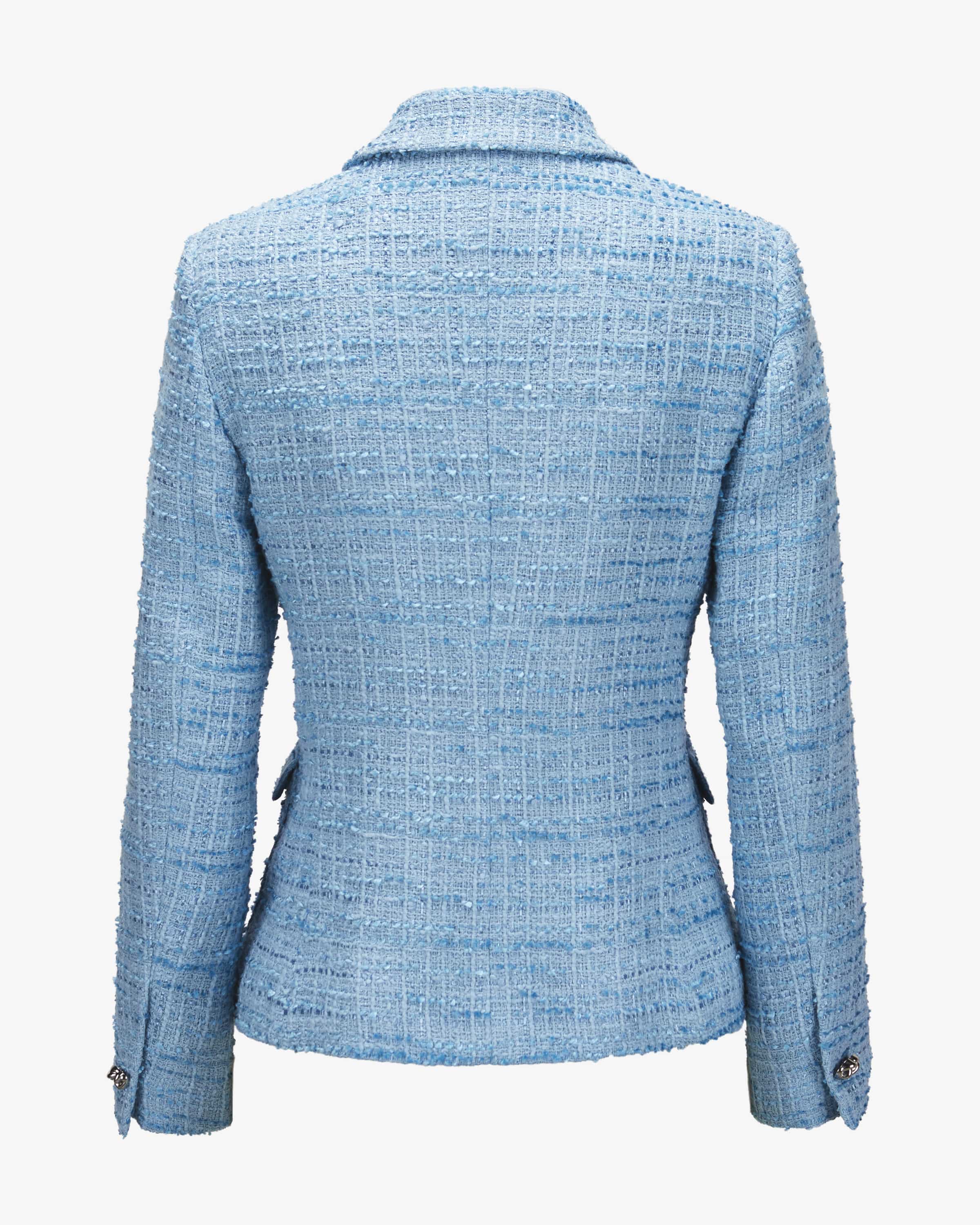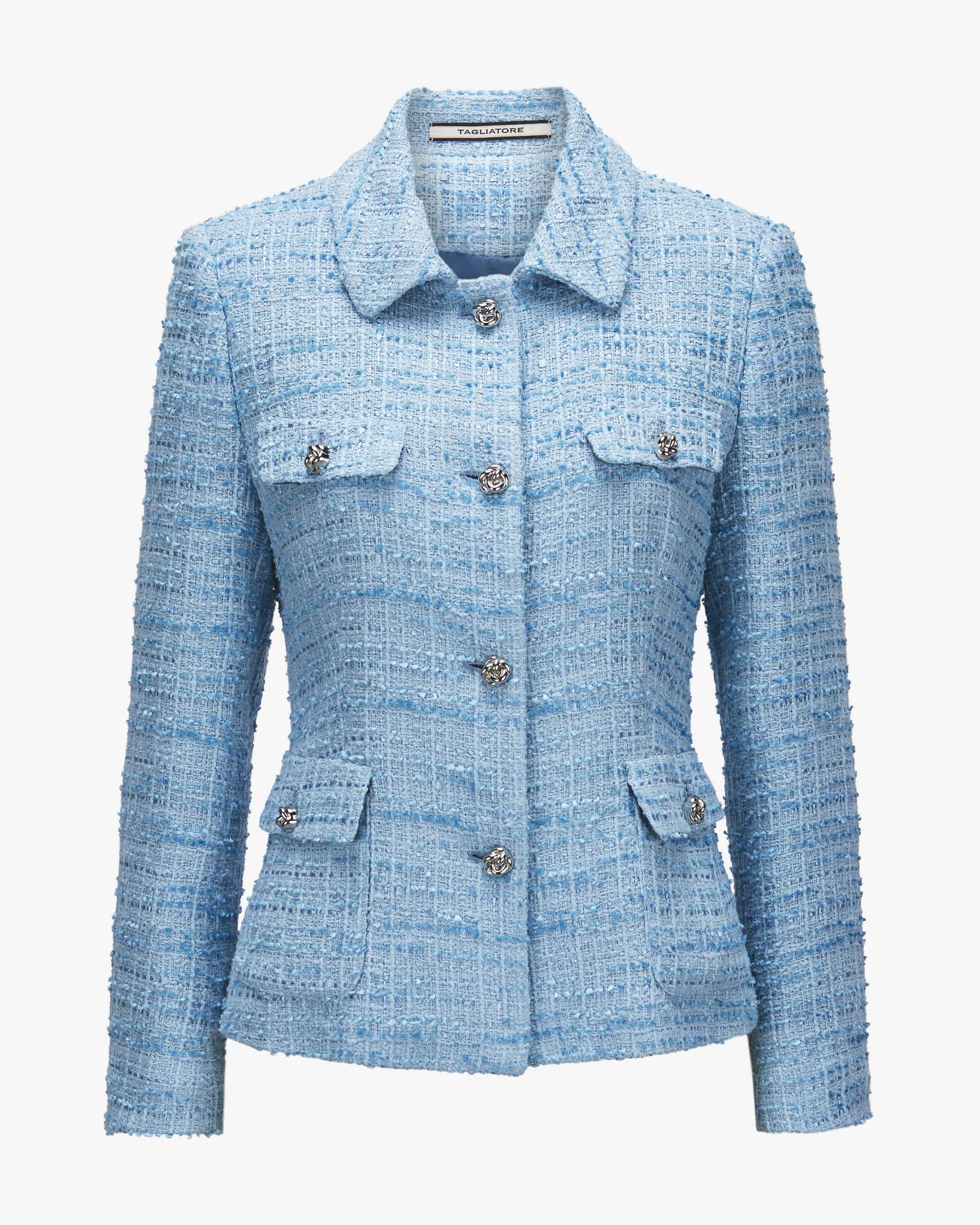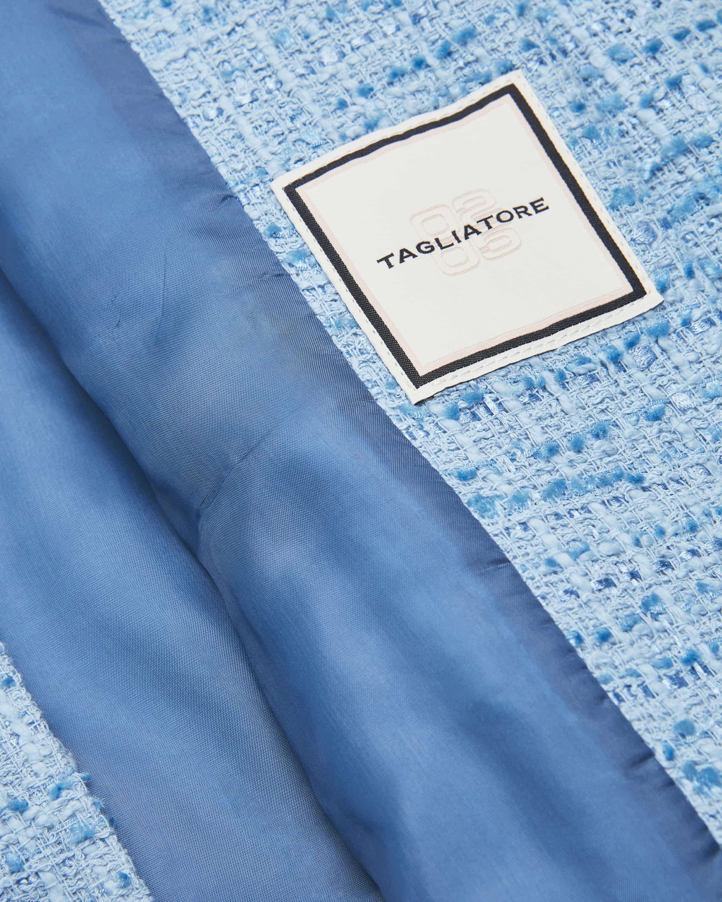 India bouclé blazer for women by Tagliatore in light blue. The Italian brand stands for excellent men's and women's blazers - the finest tailoring from Apulia with a modern touch. Thanks to the classic bouclé look, this tailored model is a stylish companion that is skillfully accentuated by the silver-coloured buttons. buttons skillfully set the scene.