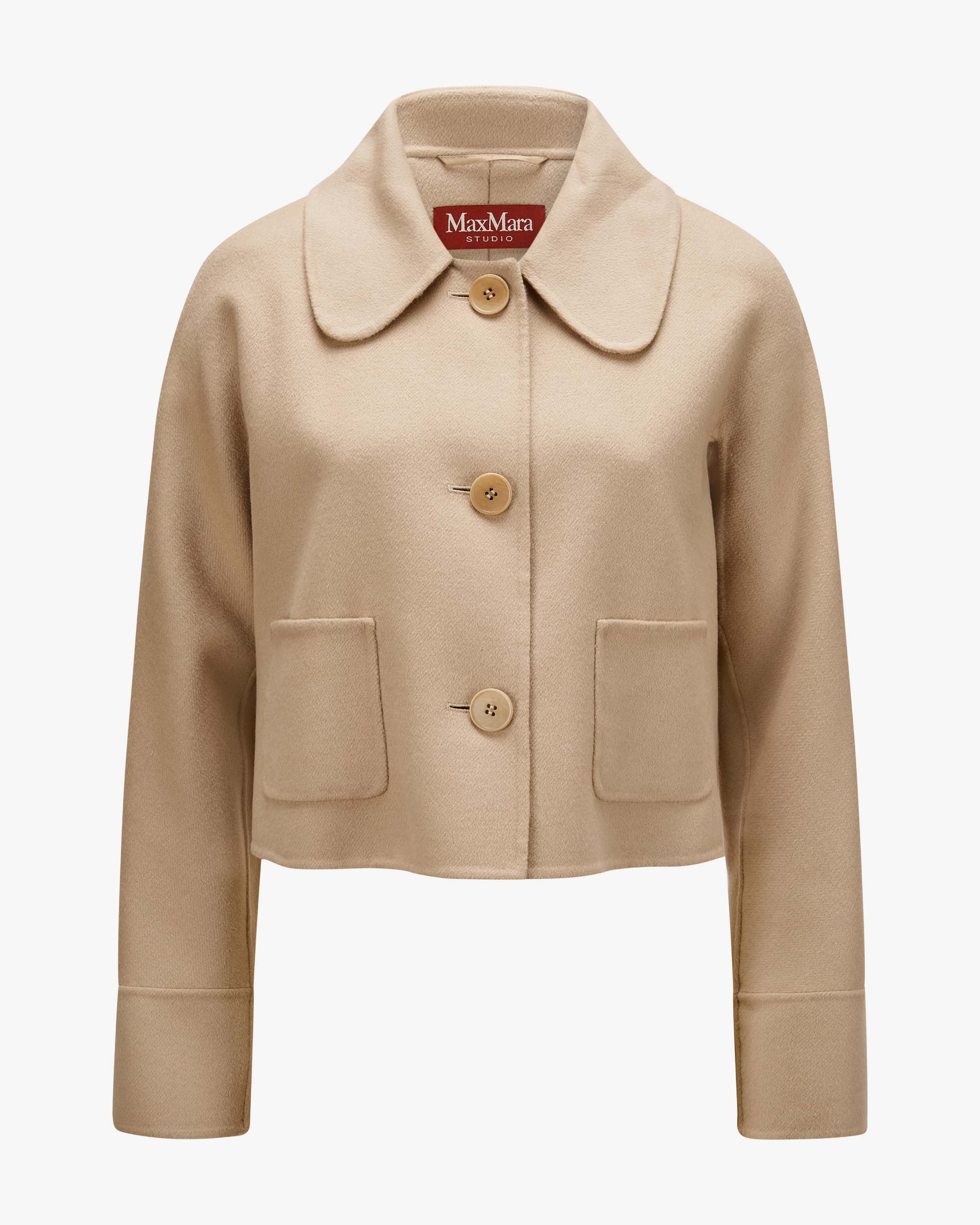 Trionfo wool jacket for women from Max Mara Studio in sand. Feminine, modern, wearable - Max Mara's more feminine line. This model impresses thanks to its high-quality wool blend with silk and cashmere content, this piece has a particularly soft feel, while the cropped cut with a striking box pleat creates a fashionable companion for the transitional season.